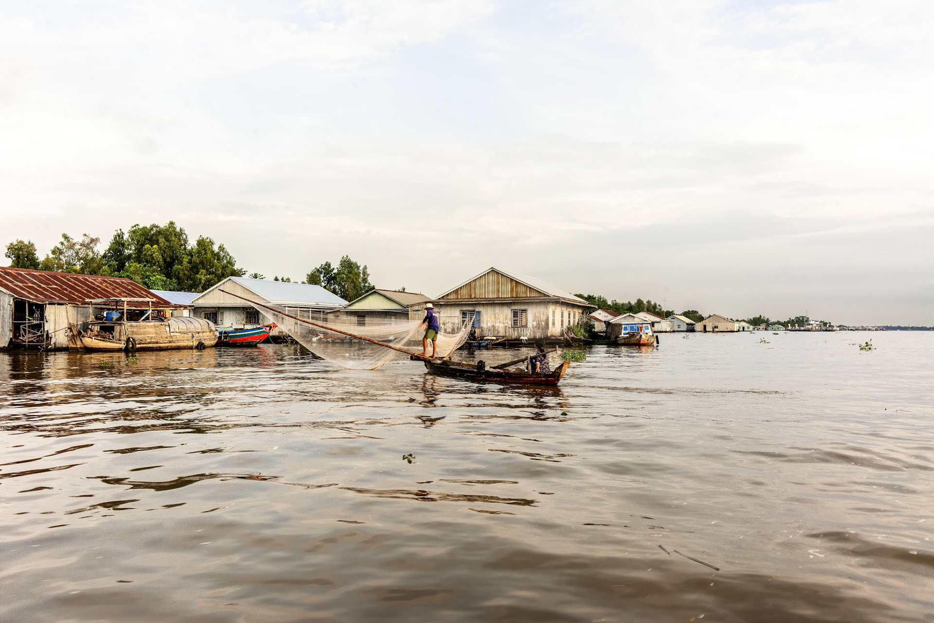 Unlike the previous year I wasn’t woken by the dawn prayers from the mosque but in any case I had set my alarm for a very early morning start. We walked through the local riverside market onto a boat and over to a fish farm, more a large shed with a large number of fish swimming around in a net suspended underneath. Then it was over to a local Muslim silk weaving village for a while, before being urgently called over to reboard the boat and meet and do a mid river transfer to the large launch that would take a Canadian family, that was on the tour, and myself from Châu Đốc to Phnom Penh. After an hour we pulled into Vietnamese Immigration to get stamped out, which only took about 20 minutes or so. Then back on the boat and further upriver to Cambodian Immigration and an interminably slow visa process; unfortunately there was a boat ahead of us and because we were going through a land border eVisa wasn’t available before hand.