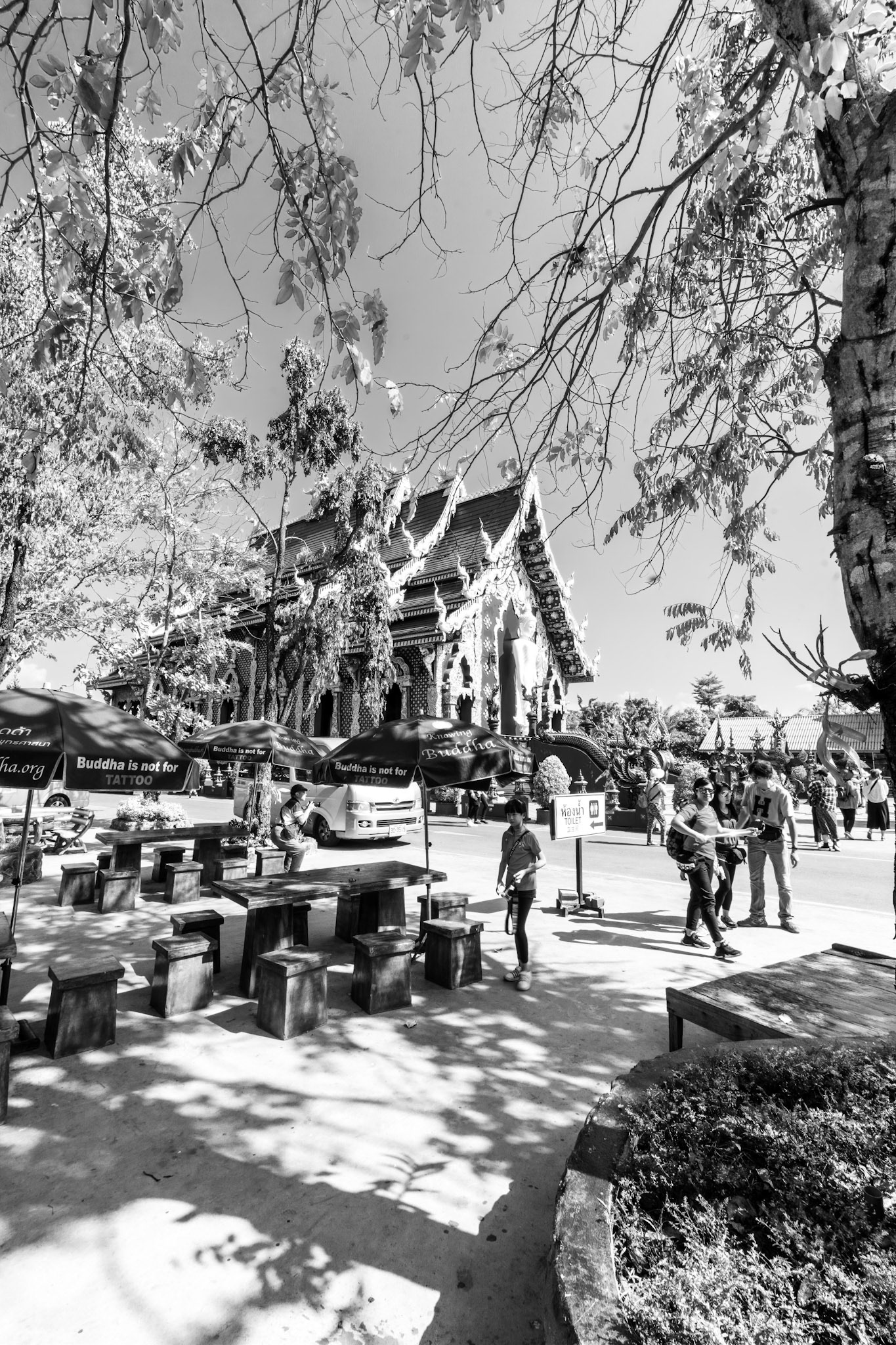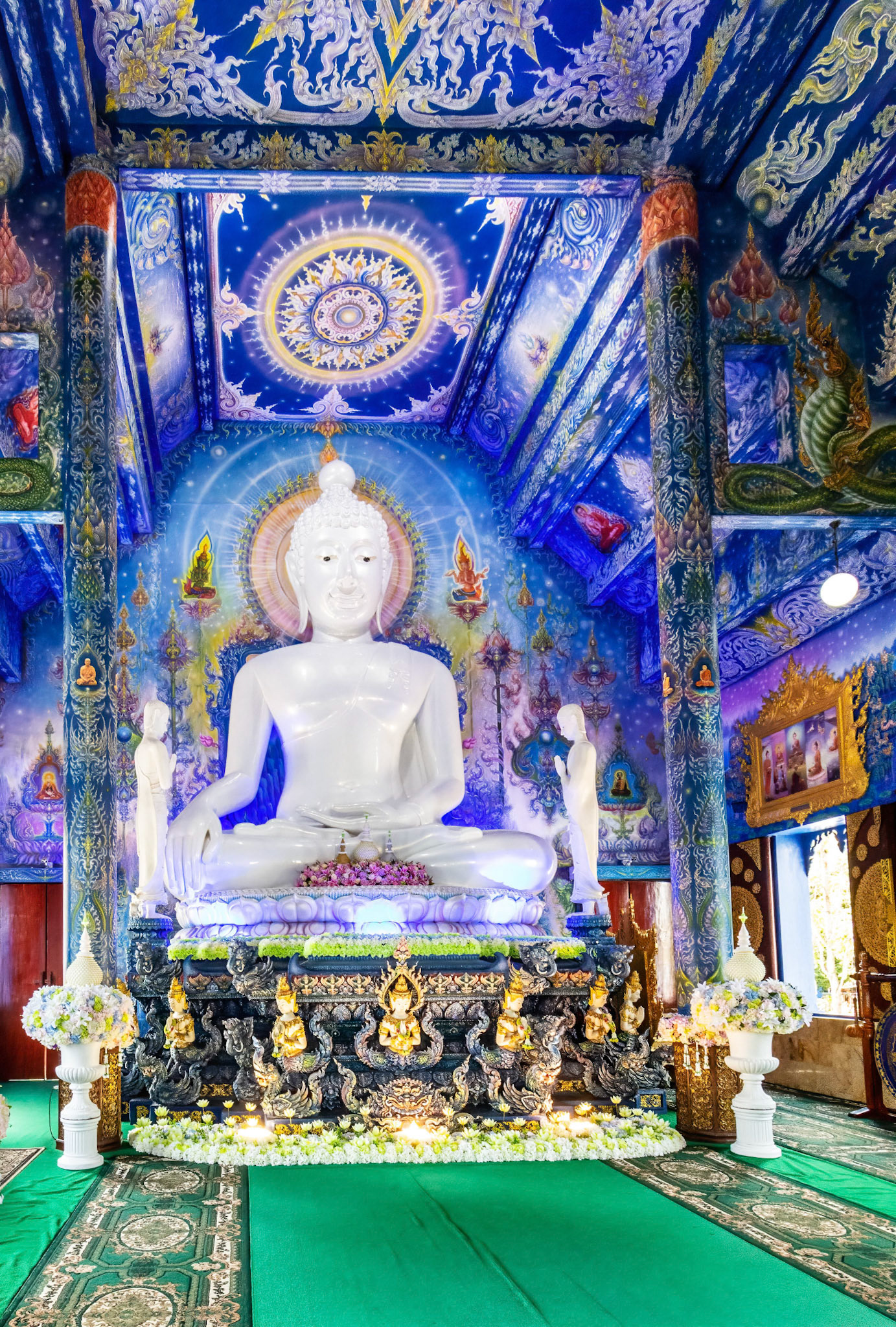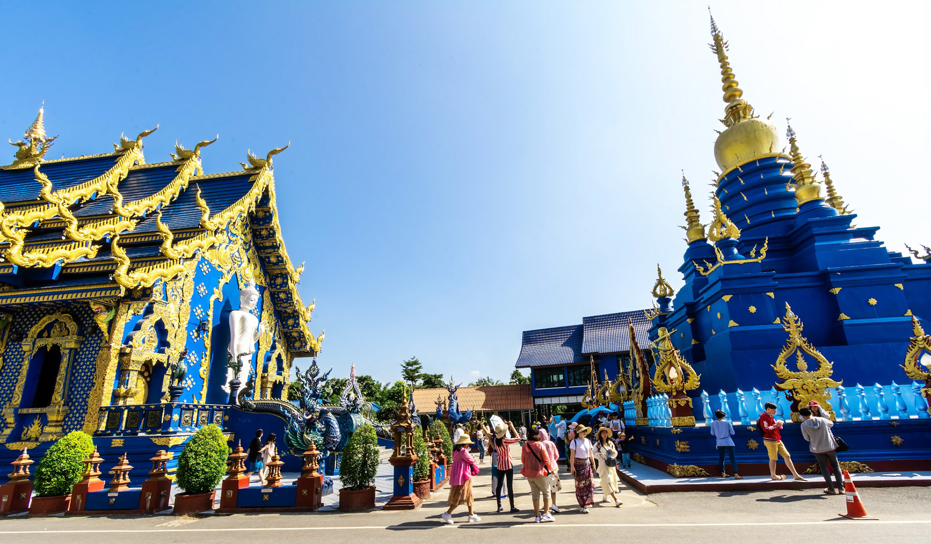 “The monastery was designed by Phuttha Kabkaew, a protégé of Chalermchai Kositpipat;” construction commenced in 2005 and the main buildings completed and opened in 2016. The distinctive and vivid blue and gold of the temple are unique as are the blinding white Buddha statues. Other statues and detail work of Nagas, ‘angels’ etc. have a breathtaking iridescent metallic sheen. See Not so innocents abroad.