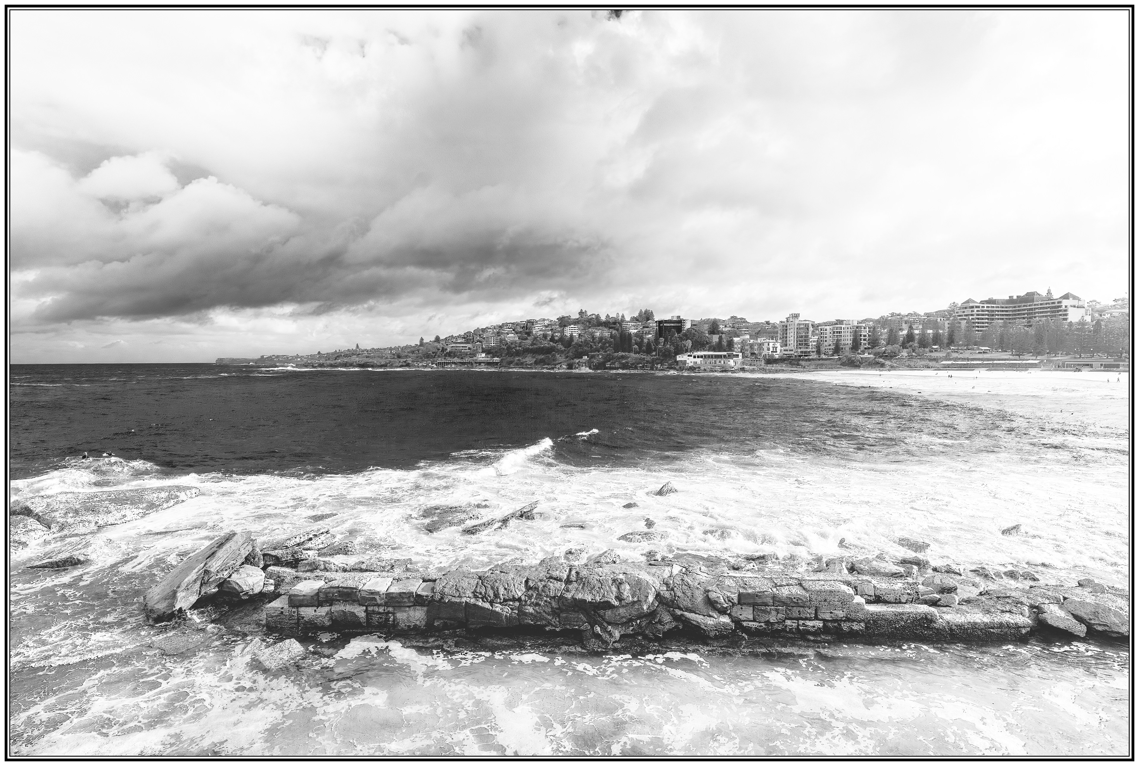 In 2025, when I was there, 12 or so young people were swimming about and about half of them lined themselves along the eastern wall to experience the waves crashing over them as they rolled in. It was a thick cloudy day but from time to time there were sufficient gaps in the clouds that allowed the sun to shine through and reflect off some of the thicker greyer clouds that gave a beautiful quality to the light that I particularly appreciate.