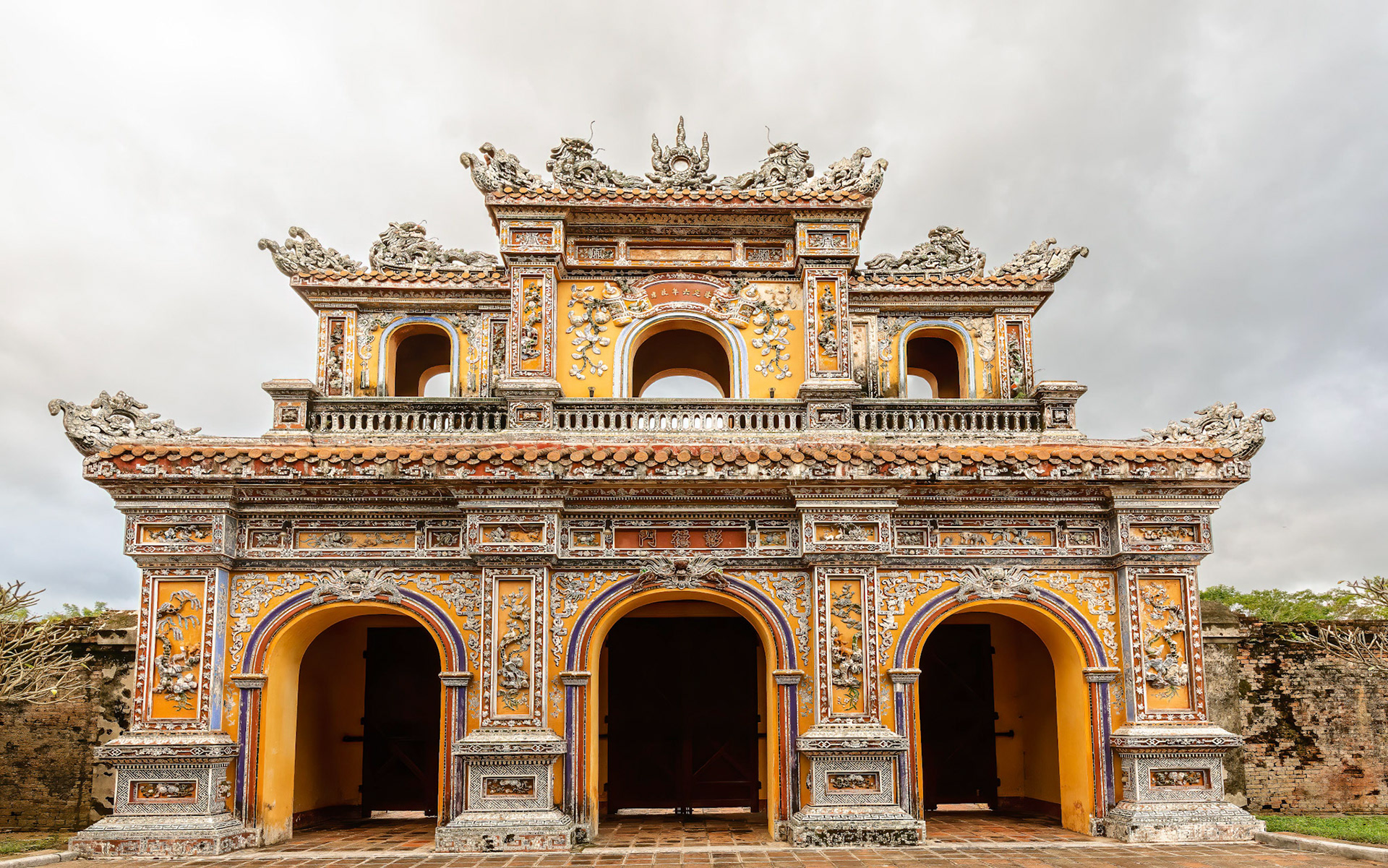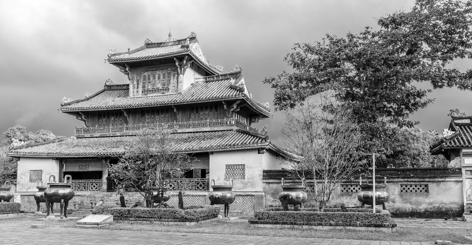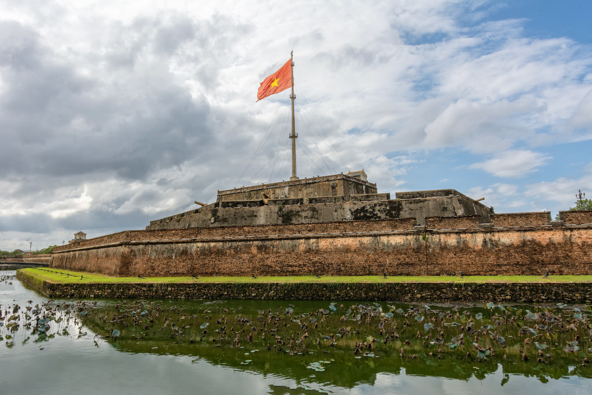 Stop 3 Kinh thành Huế (Imperial City). Construction on the citadel commenced in 1804, after “Geomancers” had been “consulted as to the [most] propitious location site for the new city.” Kinh thành is ringed by 10 km of moats, hewen by hand, in front of brick and stone reinforced earth ramparts. The complex was the seat of government until the declaration of the French Protectorate in the 1880s, but continued to be the symbolic and traditional centre “until the Nguyễn dynasty was ousted in 1945”.