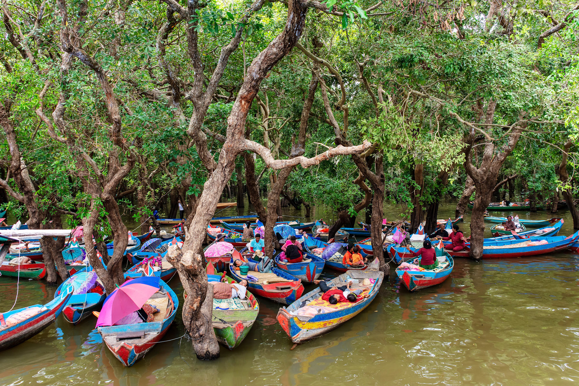 Around what becomes the flooded area is a belt of freshwater mangroves, which we were about to go through. Once we arrived at a floating restaurant, at the southern end of the village, we changed from the powered river vessel into a hand rowed flat-bottomed boat and were rowed through the mangroves for about 30 minutes before emerging at another floating restaurant on the Tonle Sap itself.