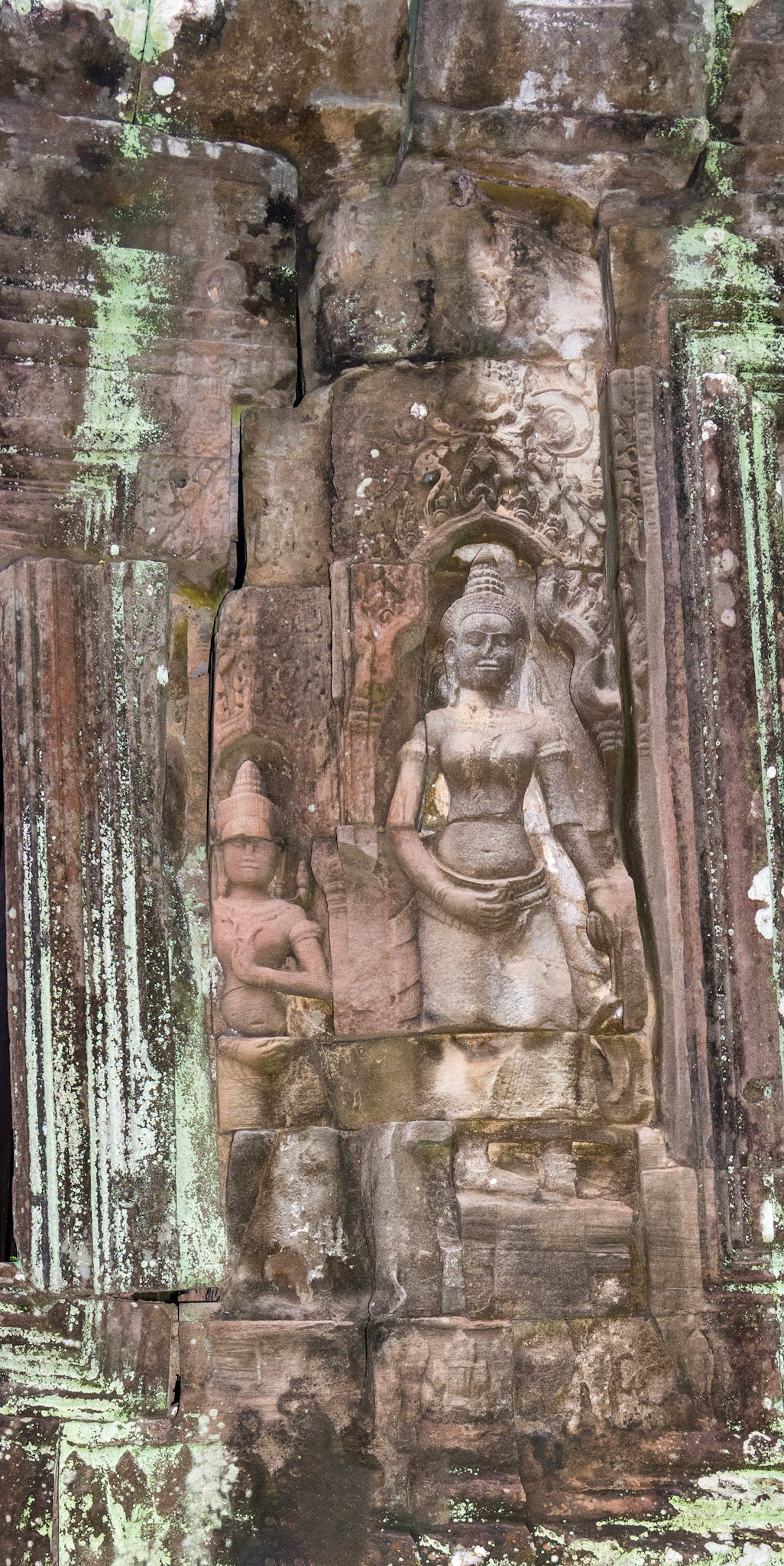 Prasat Kravan ប្រាសាទក្រវ៉ាន់, “was built in 921 by a group of nobility … of brick and plaster” and has “unique interior brick bas-reliefs, which are not found anywhere else at Angkor” See Oriental Architecture.