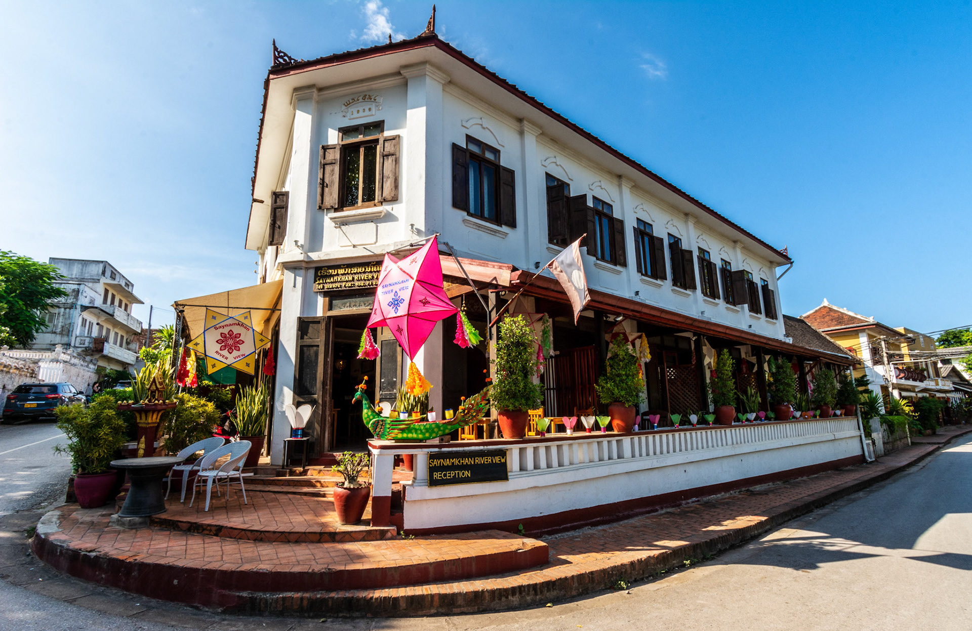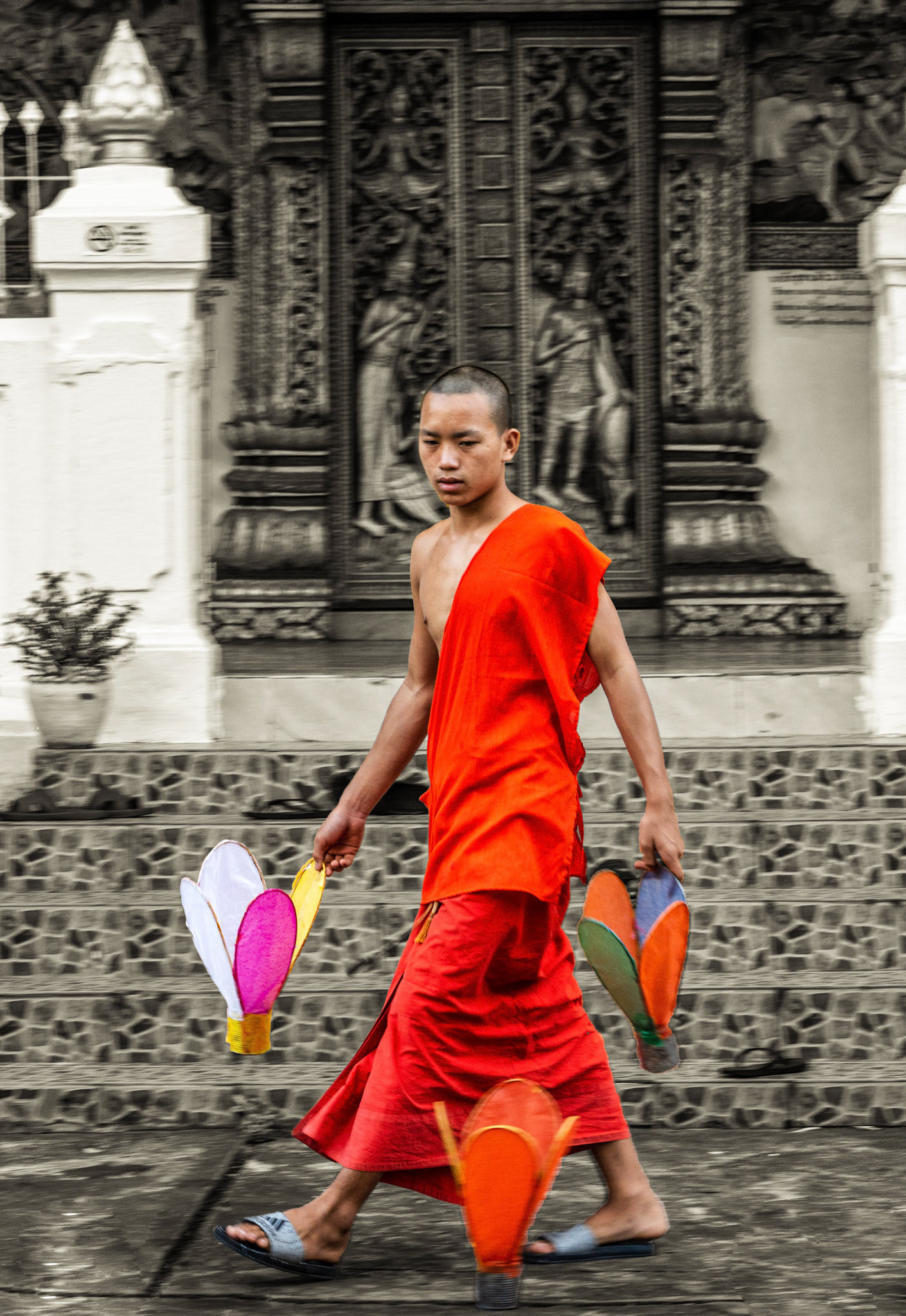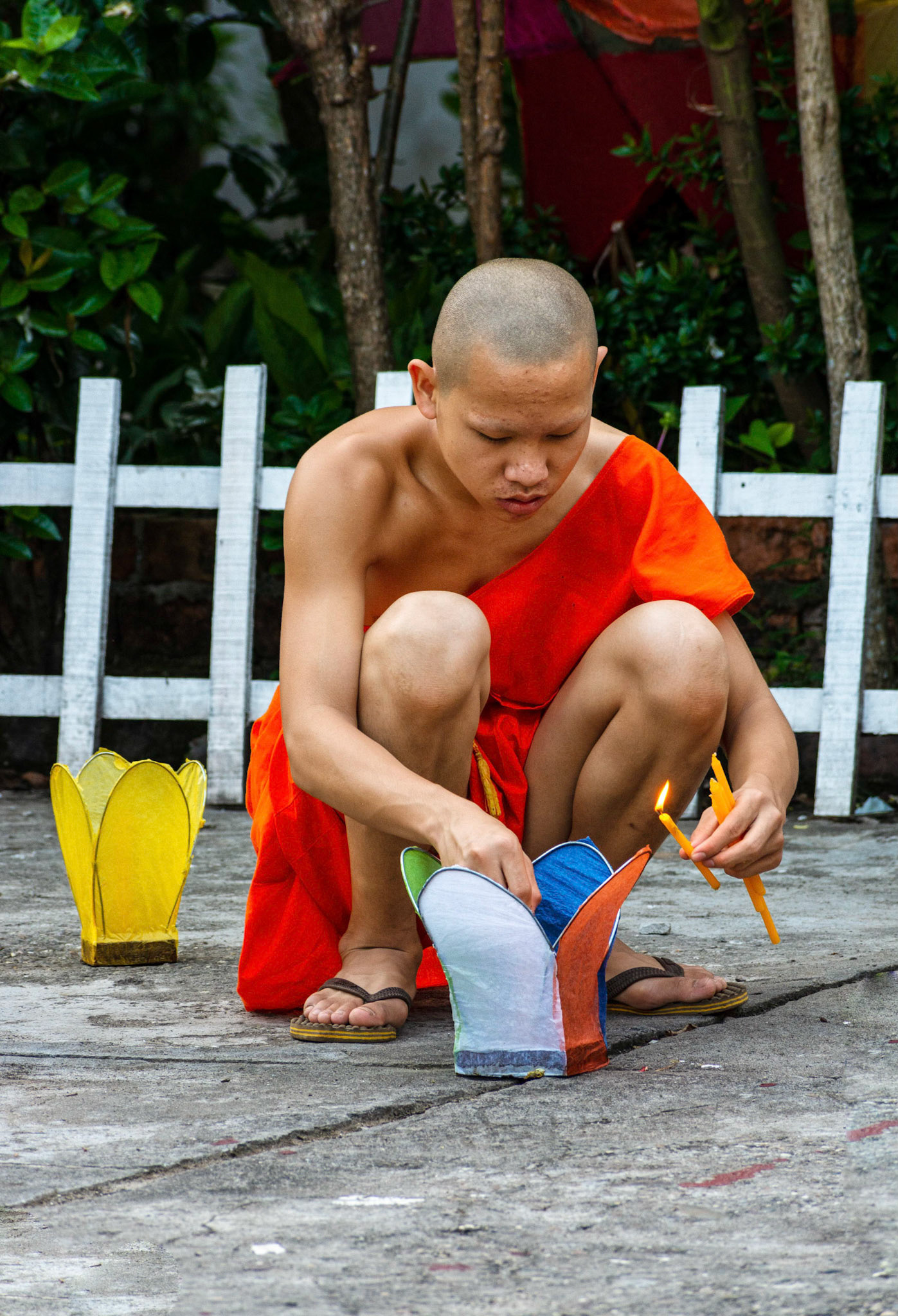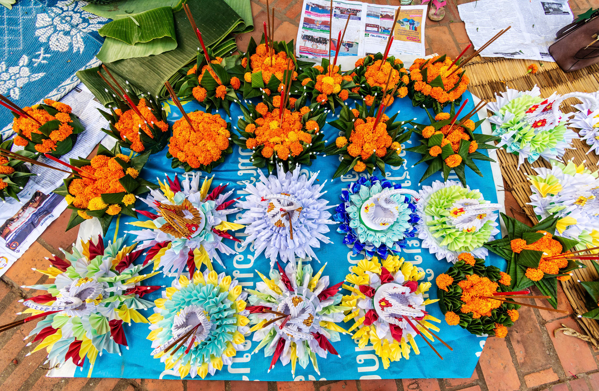 I spent a while downloading and converting the photos, from the morning at Wat Siphoutthabath and then went walkabout. Evidence of preparation for the nigh-time parade was everywhere, when I made it to the Mekong River side I could see heua fai (krathongs- offerings to the river spirits) for sale along the road. In between the heua fai stalls nestled into a bend in the footpath was a group of musicians having a late afternoon practice. Then it was up to Vat Phonxay where they were setting out their lanterns for the night, before returning to the Mekong for sunset.