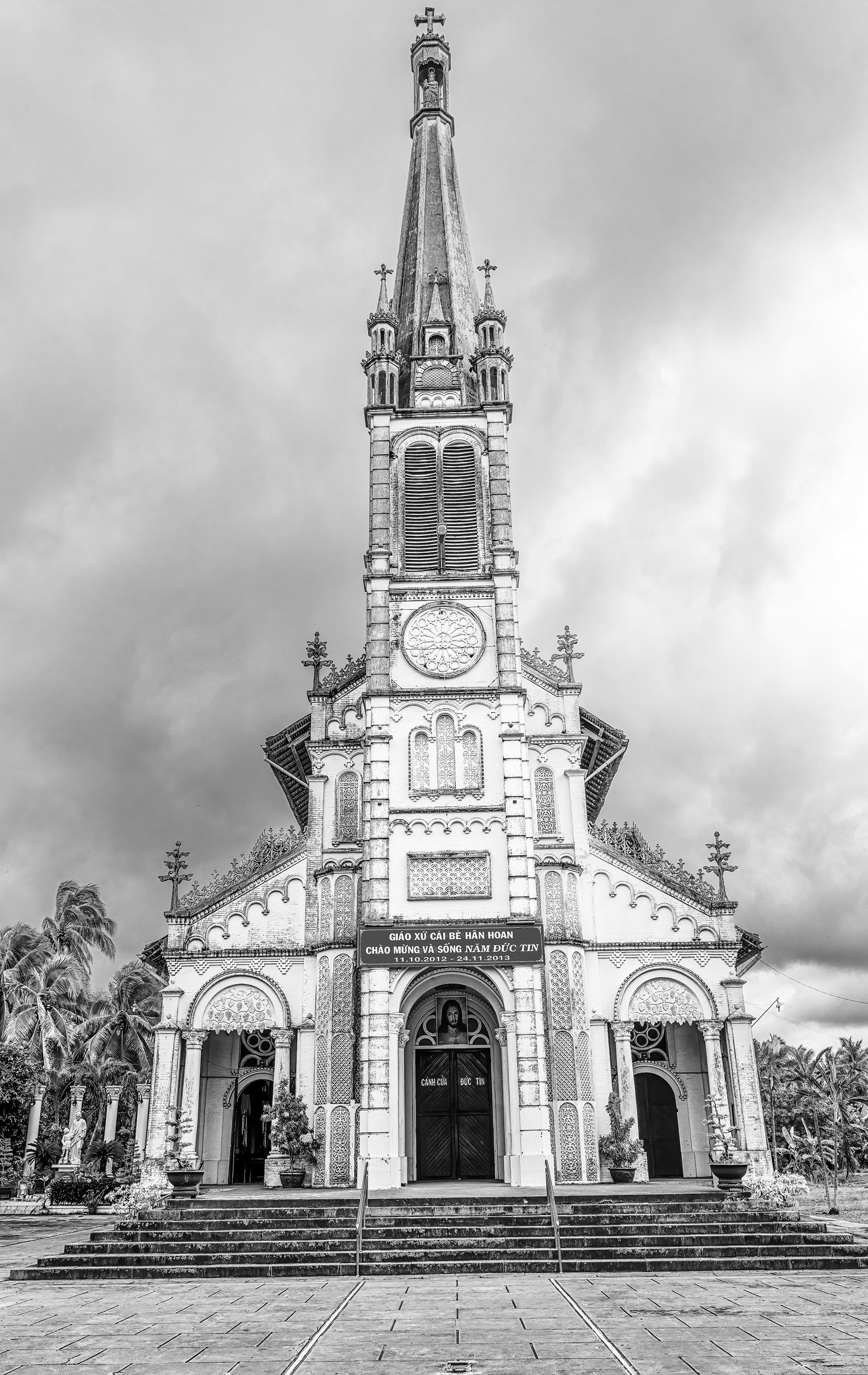 First morning of the cruise and we were at Cái Bè, only about 40 km by river from Mỹ Tho. Tenders transferred us from our boat to the shore, coming in just near Nhà Thờ Cái Bè, the local Roman Catholic church. Built along western lines between 1929 and 1932, complete with grape motifs and wedding cake cement lacework. Its greatest claim to fame is the bell tower- the tallest in the Mekong Delta.