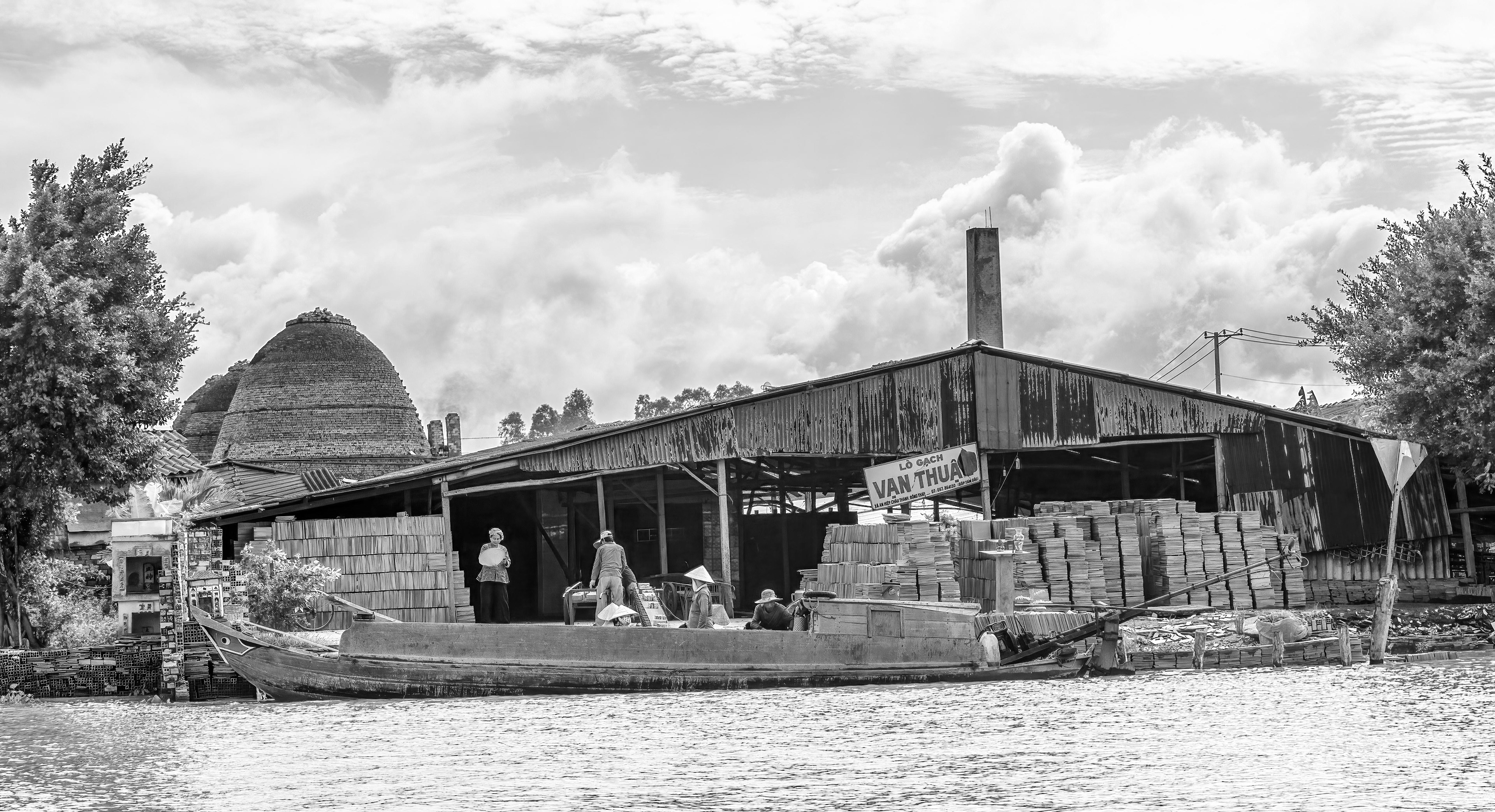 During breakfast we completed the 23 km down river and transferred into tenders to visit a local brick factory. Large parabolic bell shaped brick structures came into sight as we were coming in, which turned out to be some of the many kilns used for firing the bricks and tiles. The traditional fuel for the kilns is husks from hulled rice, which we saw being unloaded from barges by men with two large baskets balanced on either end of a pole across their shoulders. Save for the clothes it was very much a traditional scene; as was the rest of the process- all done by hand using very little modern machinery. The bricks we saw seemed more like strong terracotta than the bricks we know.