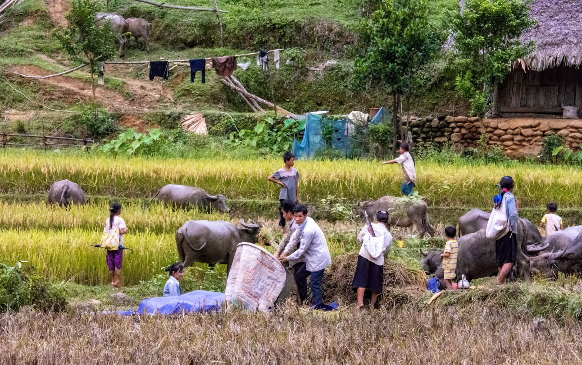 A little later we came across people hand harvesting rice, as most people still do; bending down the woman (mainly it’s the women) gather several rice stalks and cuts them with a razor sharp scythe shaped handheld knife, she then places them on a small pile behind. Other workers come along to gather and tie the piles together into bunches for the next team to come and carry them, balancing several bunches at either end of a bamboo pole, up to the road to dry before threshing. Threshing though, since electric power has become available, is now mainly mechanised although we did see some people hand threshing during the trip.