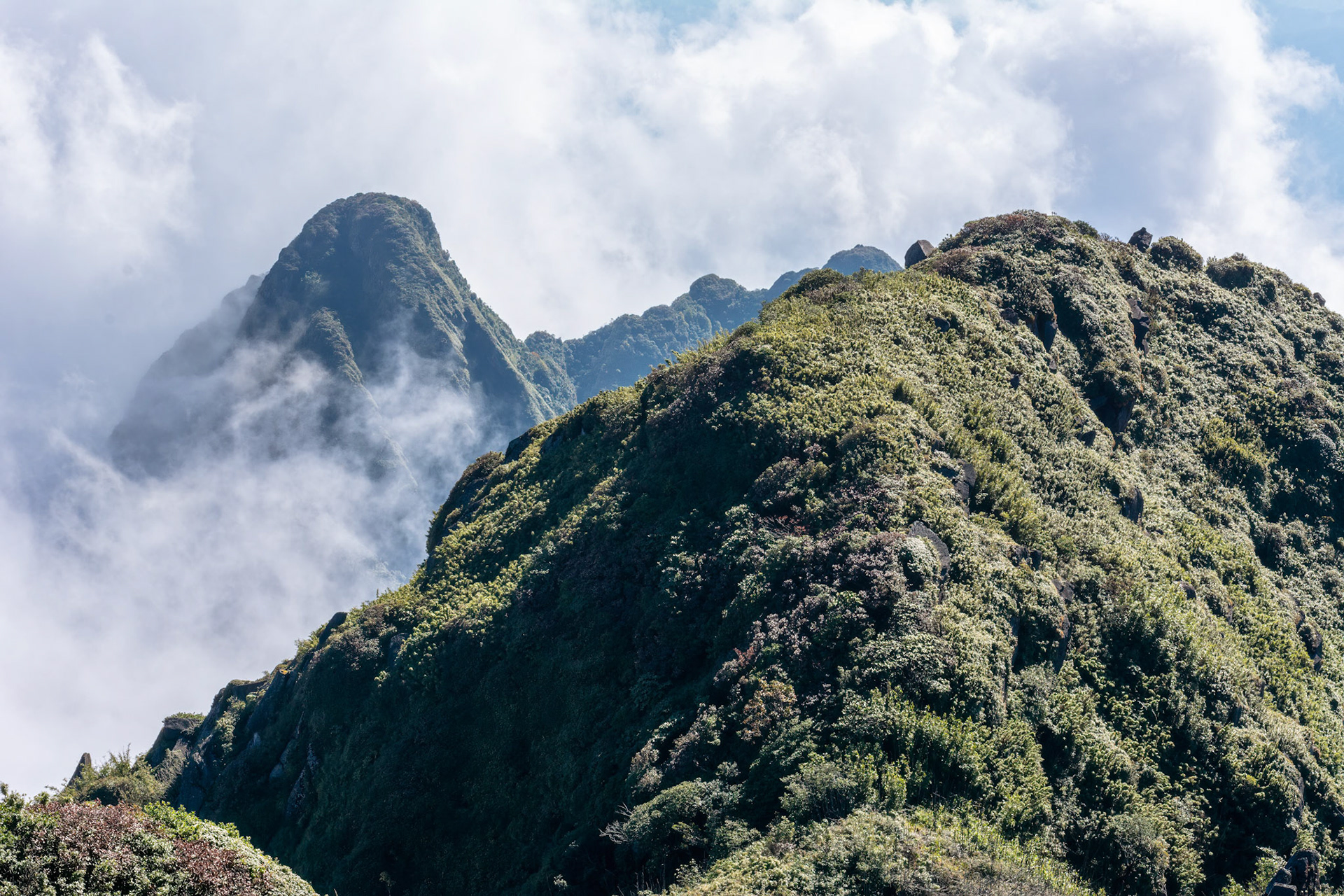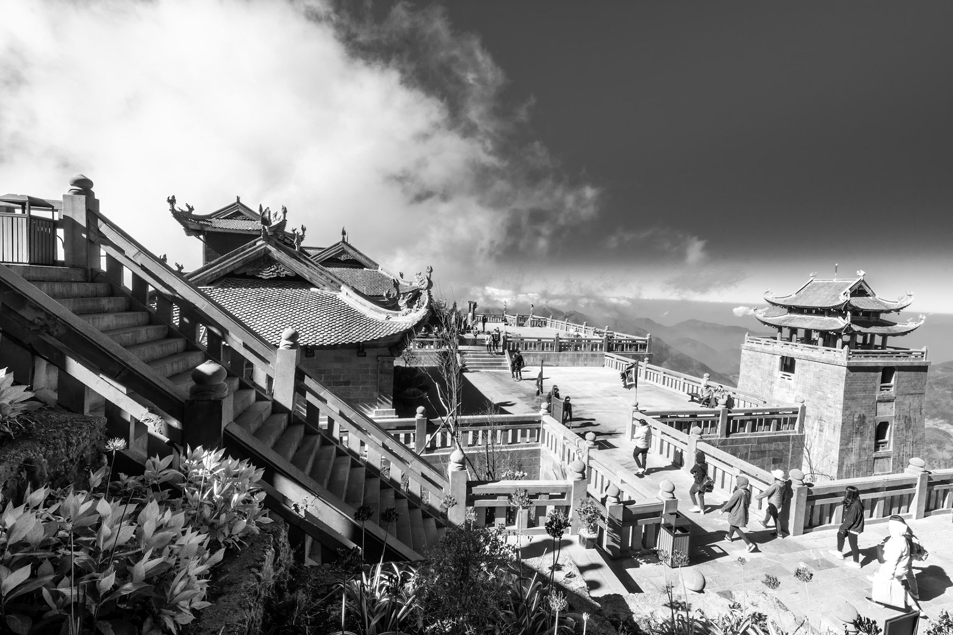 Up another 200 metres or so over several sweeps of stairs to the next funicular, or more stairs if you're so inclined– I wasn't, to the summit at 3,143 metres. The views were amazing and even better we were above the haze line with clouds sweeping around, below and above. At times the clouds closed in and then suddenly opened out revealing some startling views.
