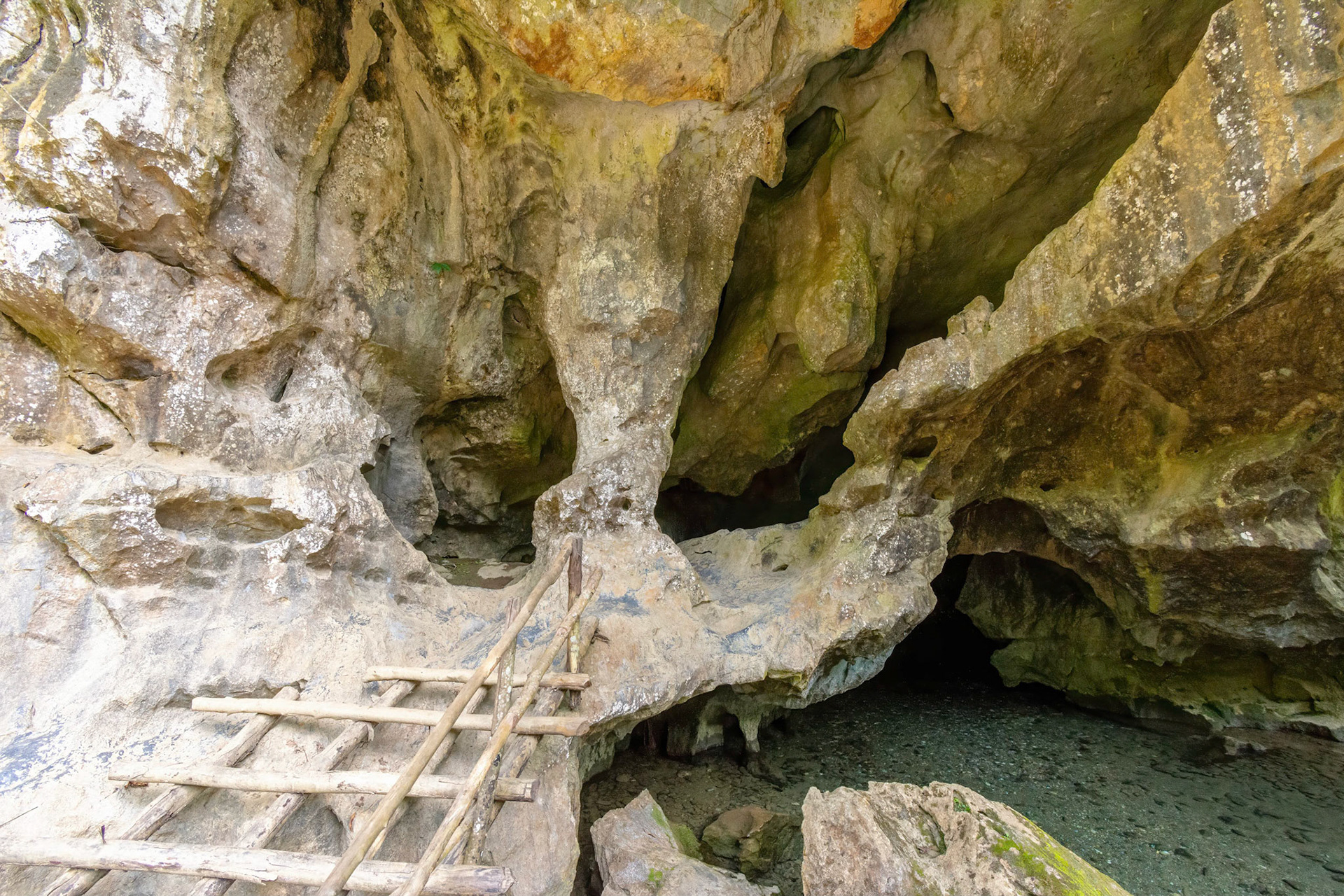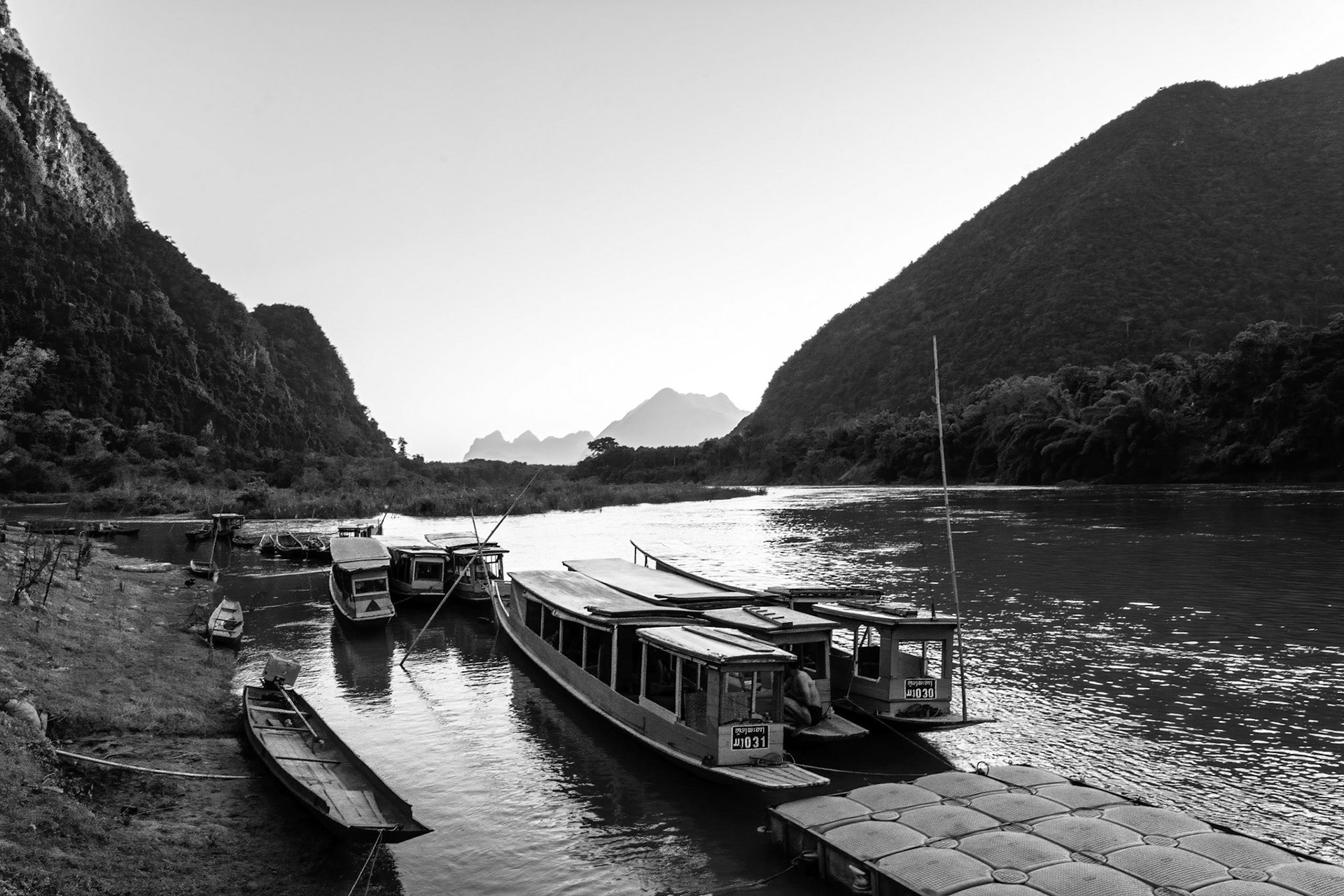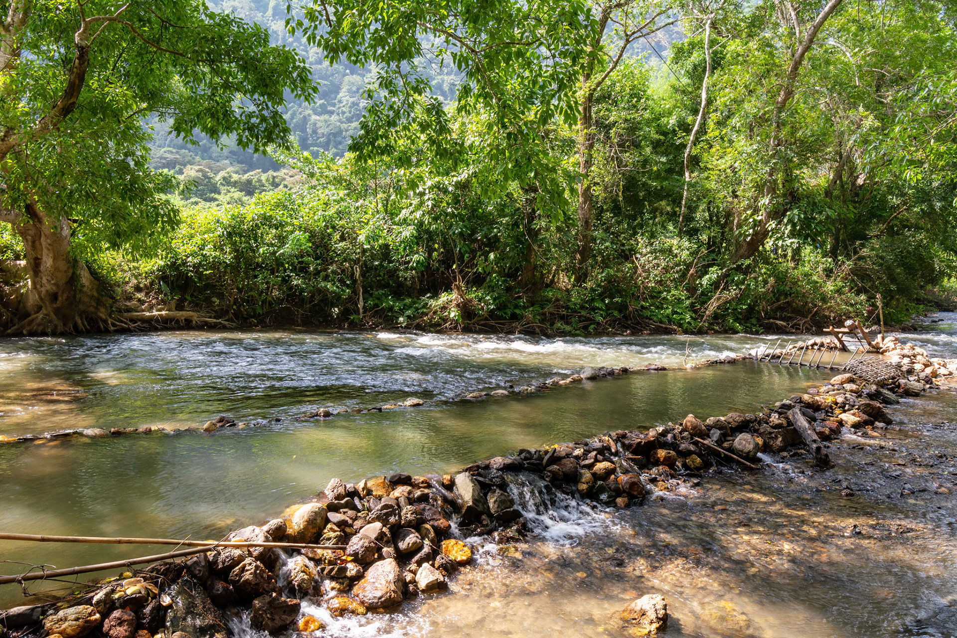 Stop 2 Tham Kang Cave One of the caves around the town where locals sheltered as the US was bombing the bejesus out of the place, I think possibly because it was close to the front line in the civil war between the Royal Lao and Pathet Lao forces, rather than being part of the campaign against the Ho Chi Minh trail- which was further south. The cave is located at the base of a towering kharst, with several adjacent entrances and a clear underground stream flowing through the cave to join with a tributary of the Nam river. There were numerous fish swimming around, one of which seemed longer than 30cm and smart enough to dash back into the shadows when I raised my camera. Close to the cave was a substantial traditional fish trap that seemed to have been there for several decades.