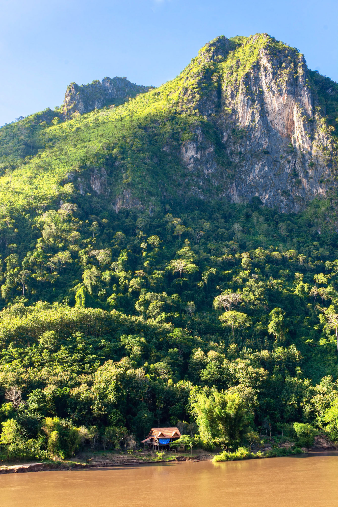 I had to go by bus from Luang Prabang to Nong Khiaw because even though previously the trip could be done by boat up the Nam Ou - ນ້ຳອູ (Ou River)- which literally translates to "Rice Bowl River", now there are several dams are under construction closing off navigation. The bus picked me up and continued on a round of guest houses until it was pretty close to full before we headed, almost due north, out of town. Travelling over mostly good but narrow roads, although in a couple of places we had to dodge a couple of landslides and road works, squeeze past huge trucks in others and multiple groups of bike riders undergoing some type of challenge. The road traverses some spectacular limestone country and runs parallel to the river for about two thirds of the trip until Pak Nga; where we headed up into the hills.
