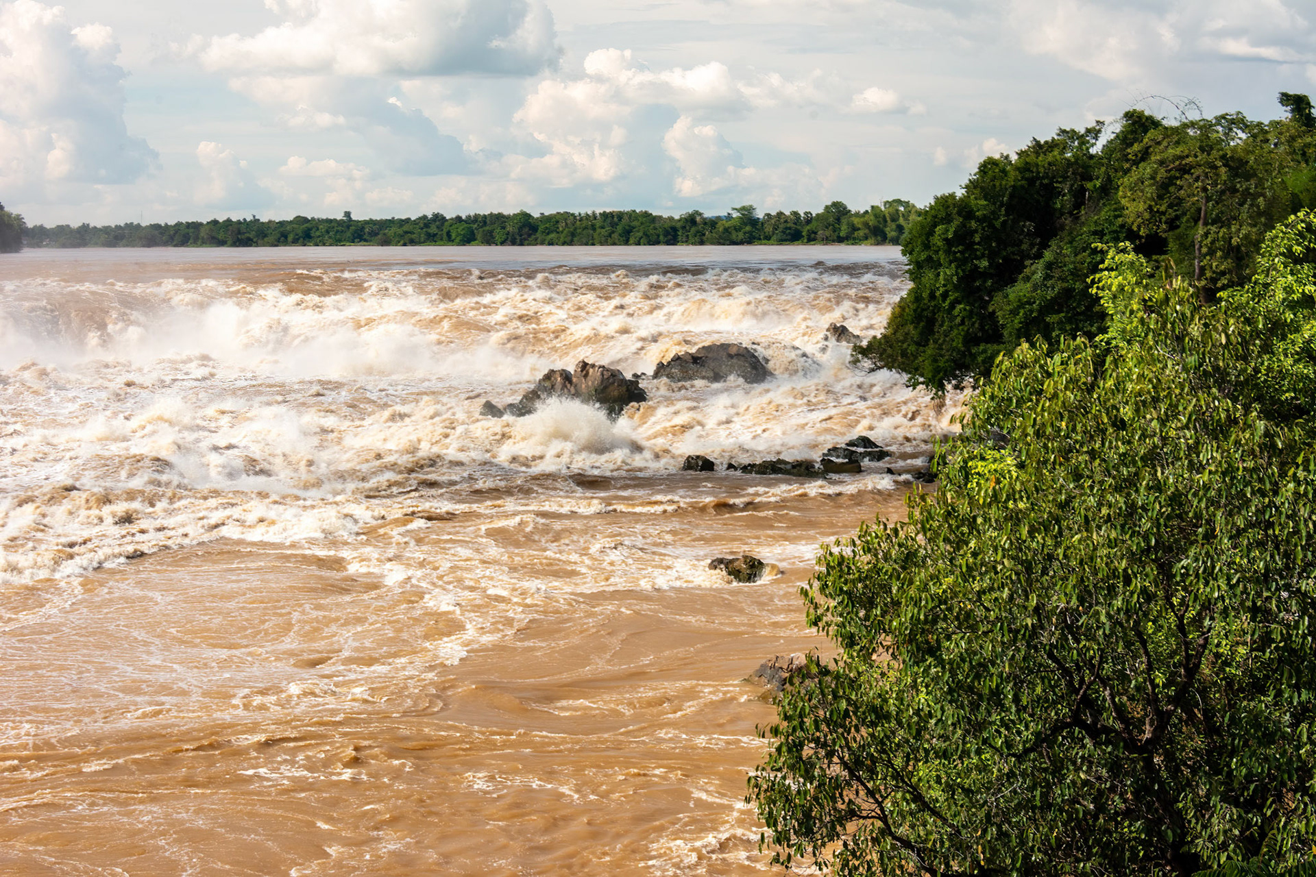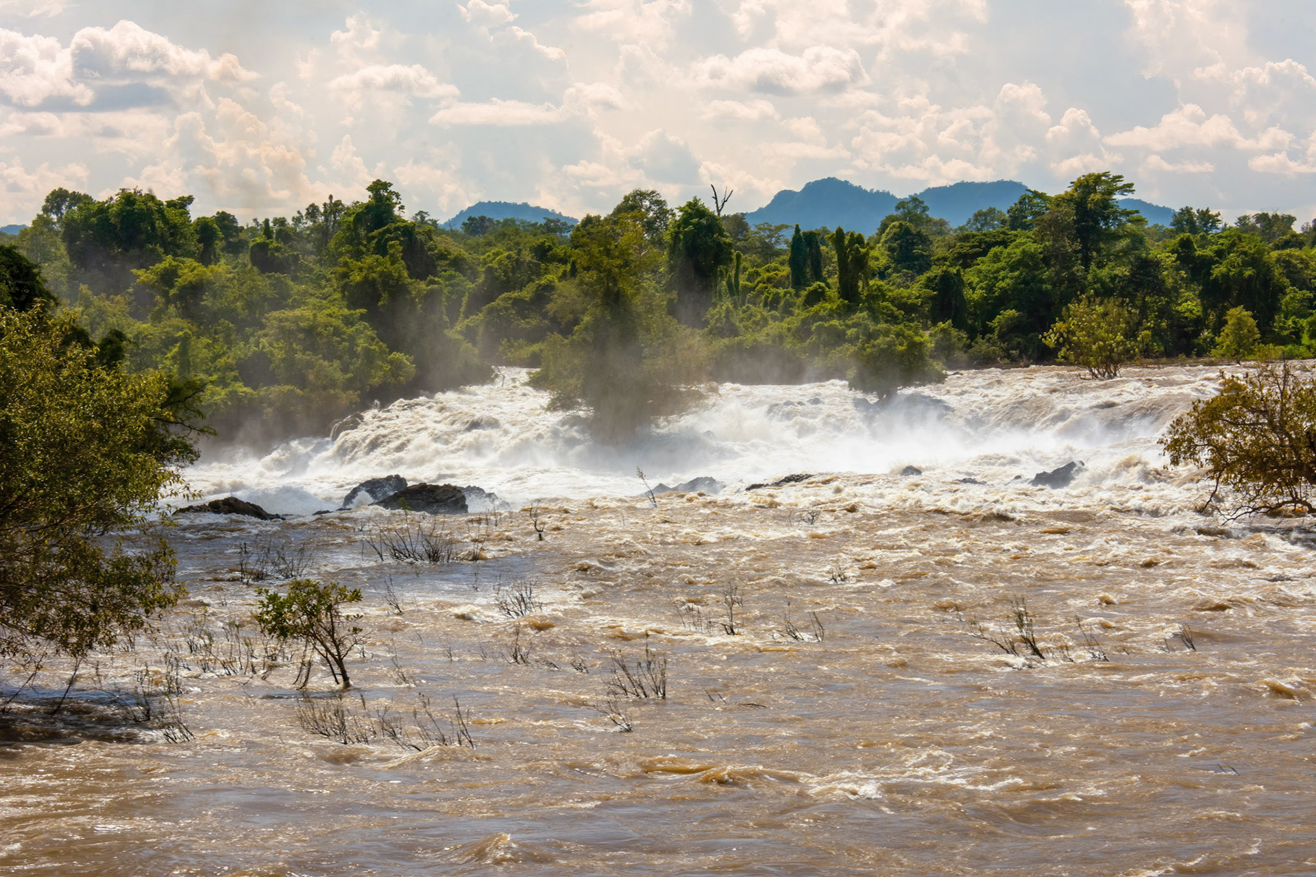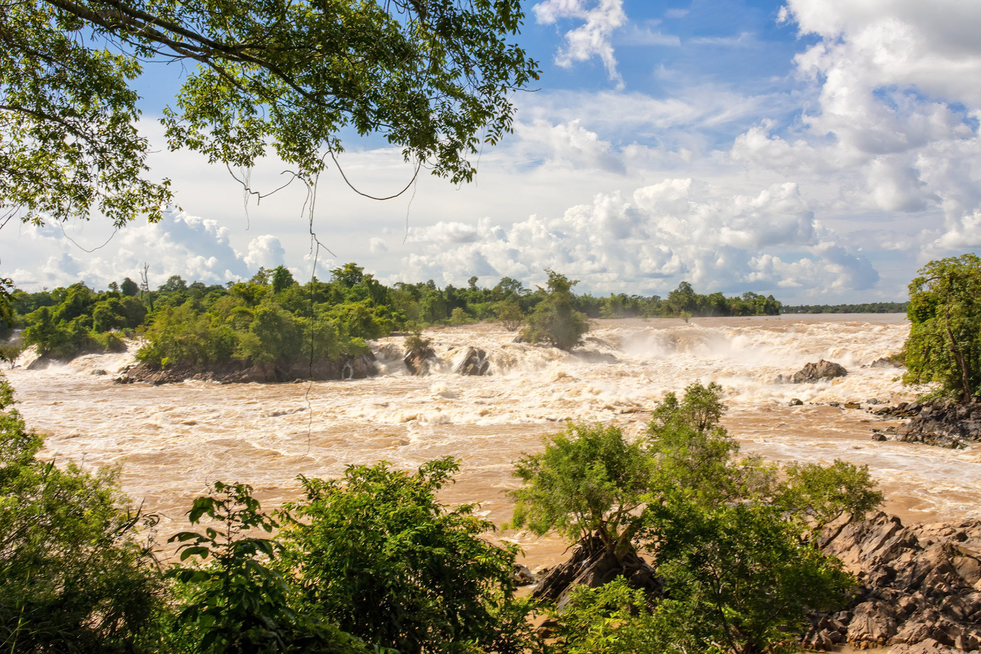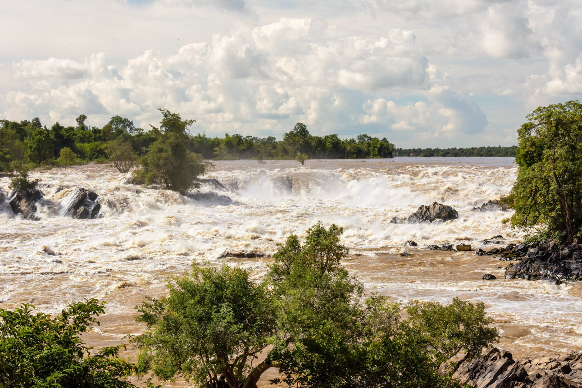 "The Khone Falls is the prime reason why the Mekong river is not fully navigable into China" and the most impressive waterfall I've seen even though really it's more a cascade of rapids rather than a waterfall. "The highest falls reach to 21 metres (69 ft); the succession of rapids stretch 9.7 km (6.0 mi) of the river's length. The average discharge of the cataract is nearly 11,000 m3/s (390,000 cu ft/s), with the highest flow on record at over 49,000 m3/s (1,700,000 cu ft/s)." See Wikipedia