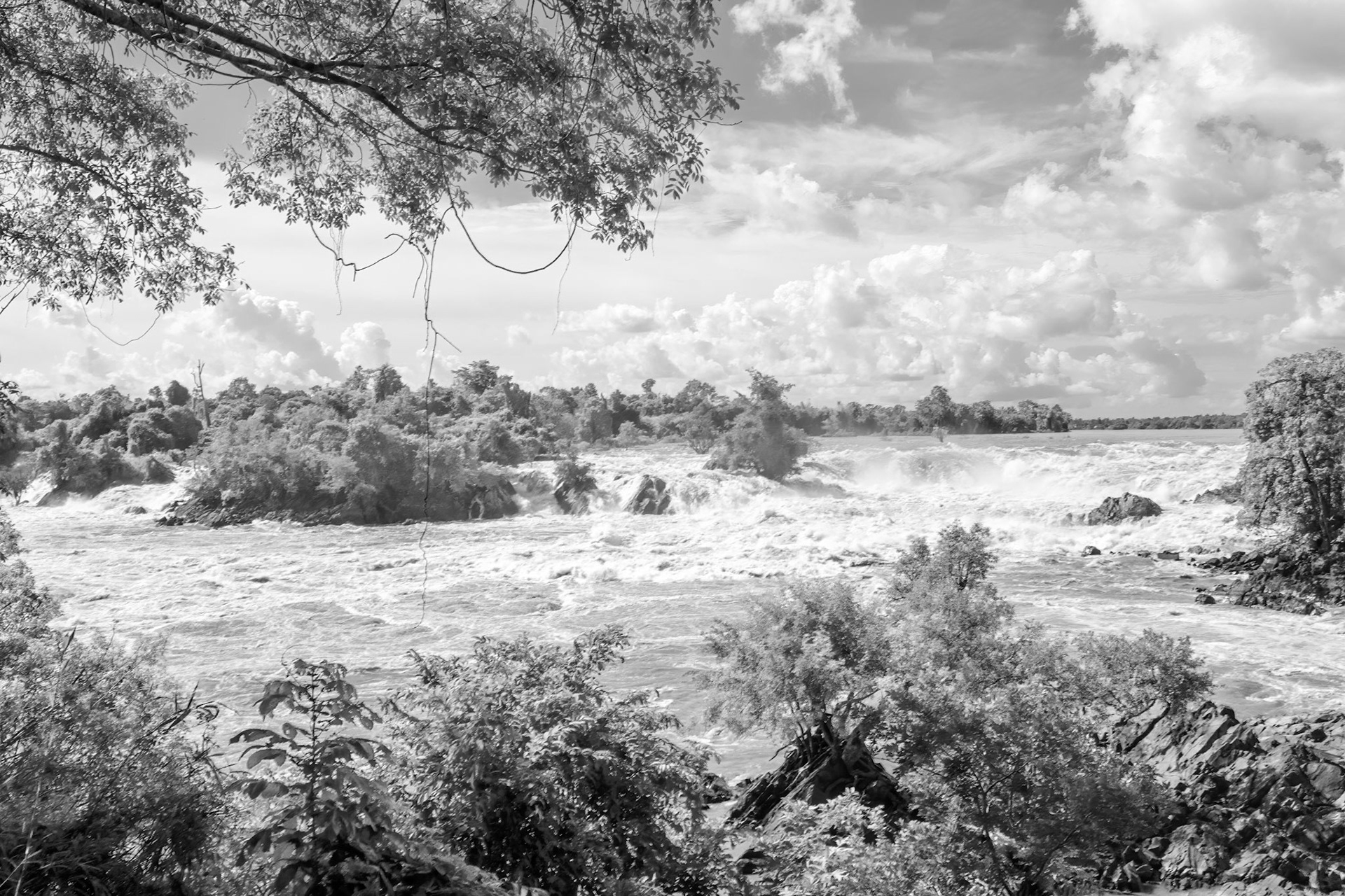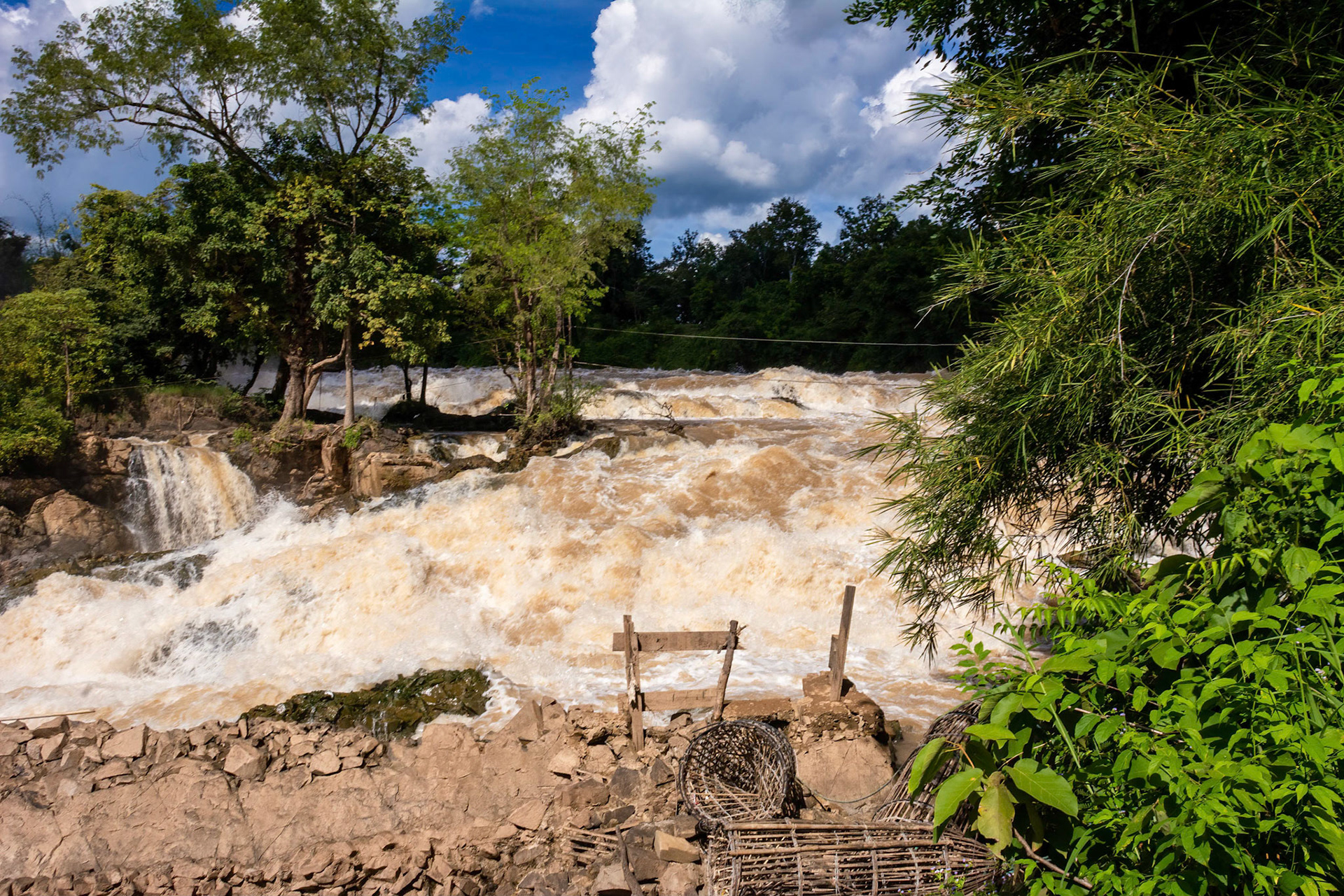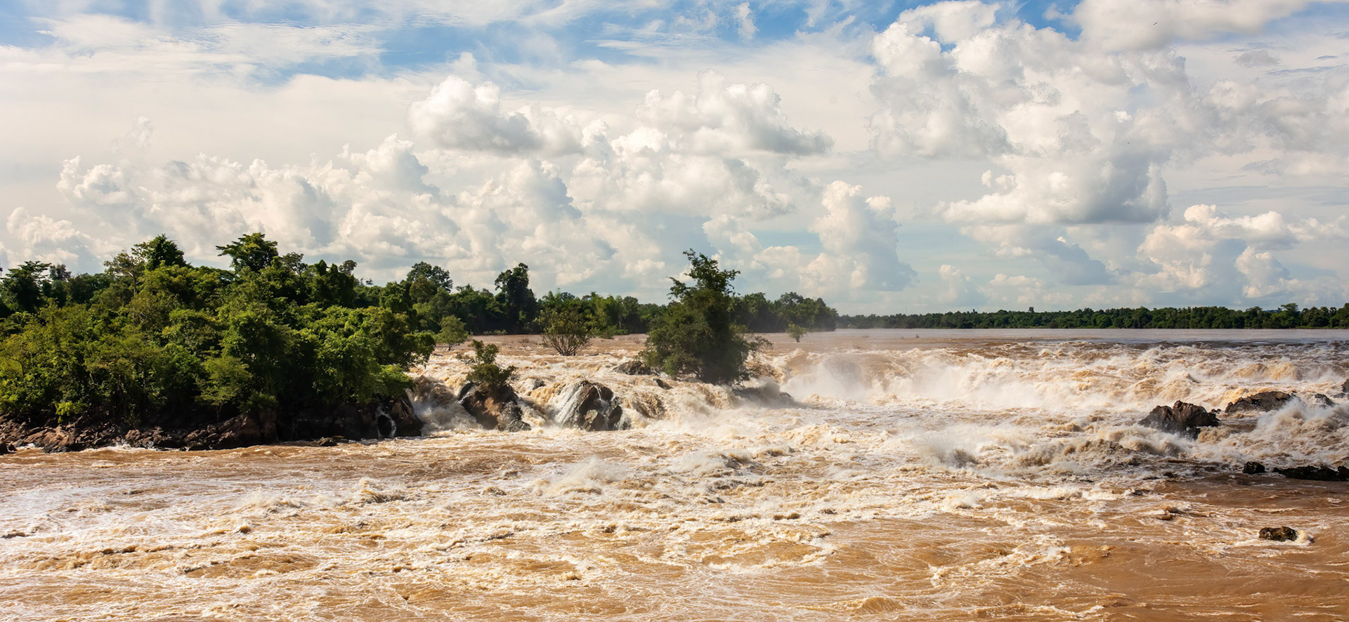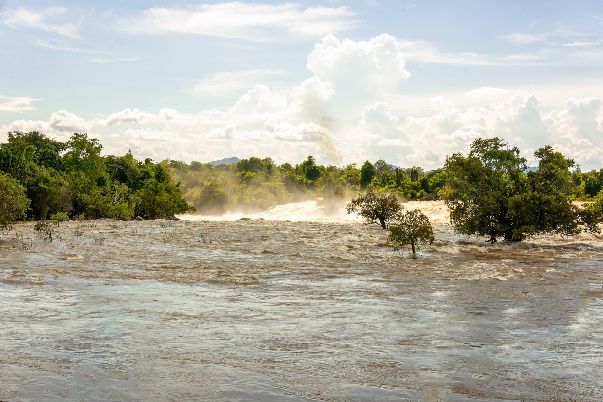 "The Khone Falls is the prime reason why the Mekong river is not fully navigable into China" and the most impressive waterfall I've seen even though really it's more a cascade of rapids rather than a waterfall. "The highest falls reach to 21 metres (69 ft); the succession of rapids stretch 9.7 km (6.0 mi) of the river's length. The average discharge of the cataract is nearly 11,000 m3/s (390,000 cu ft/s), with the highest flow on record at over 49,000 m3/s (1,700,000 cu ft/s)." See Wikipedia