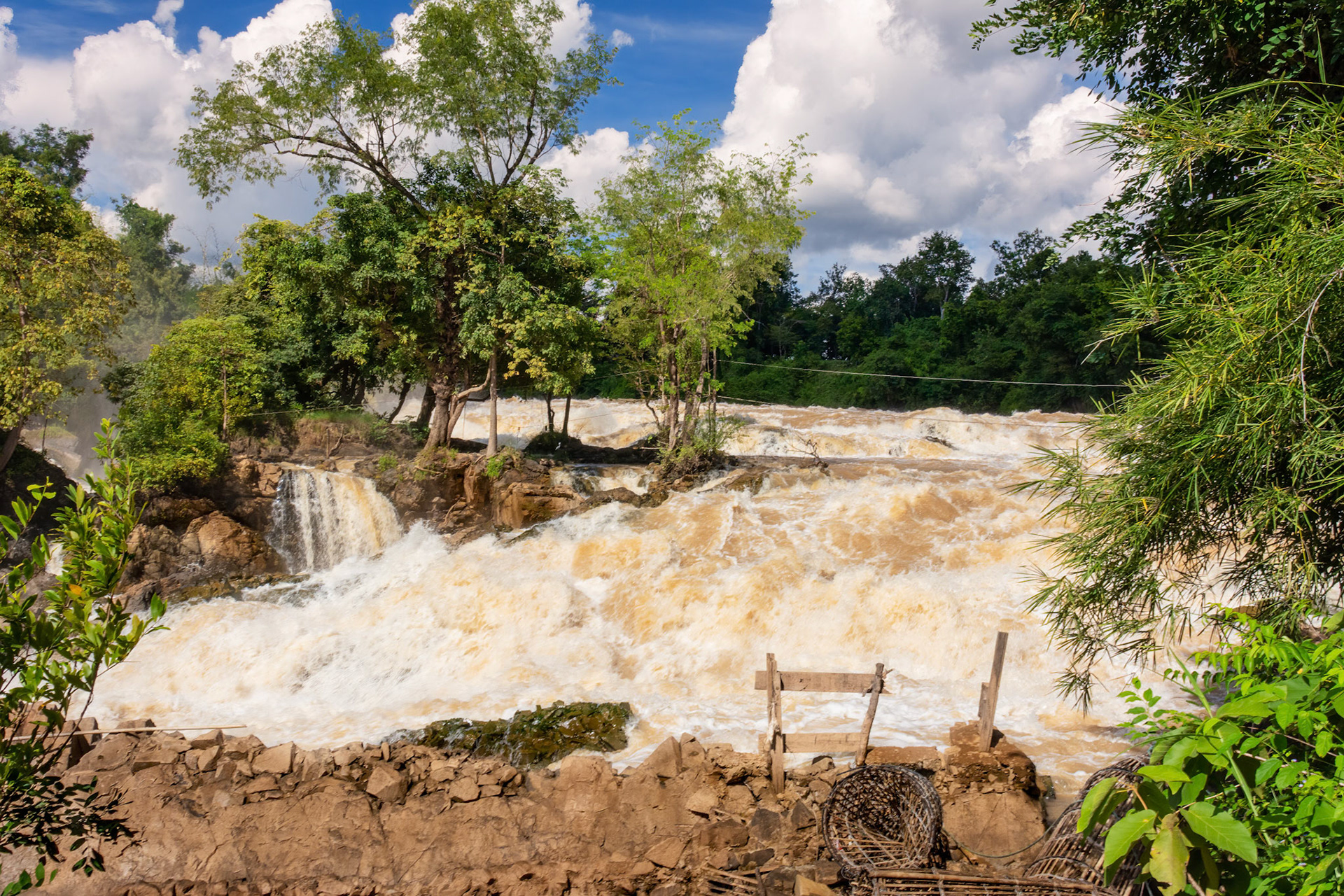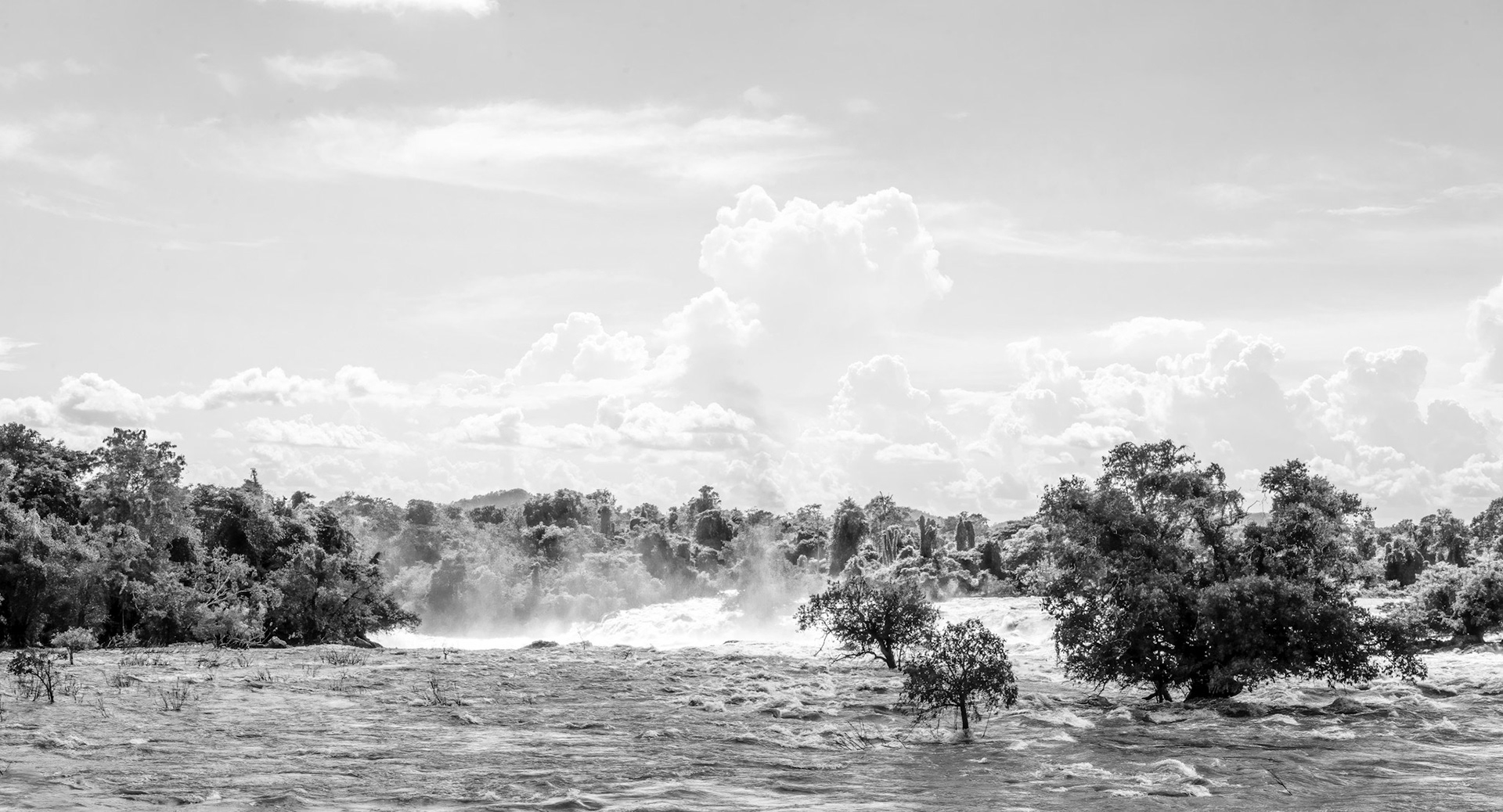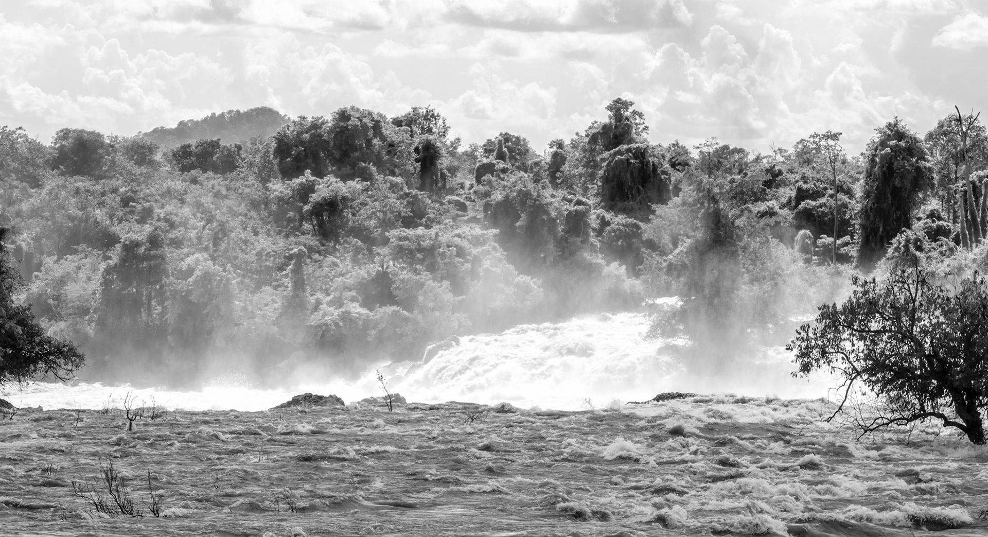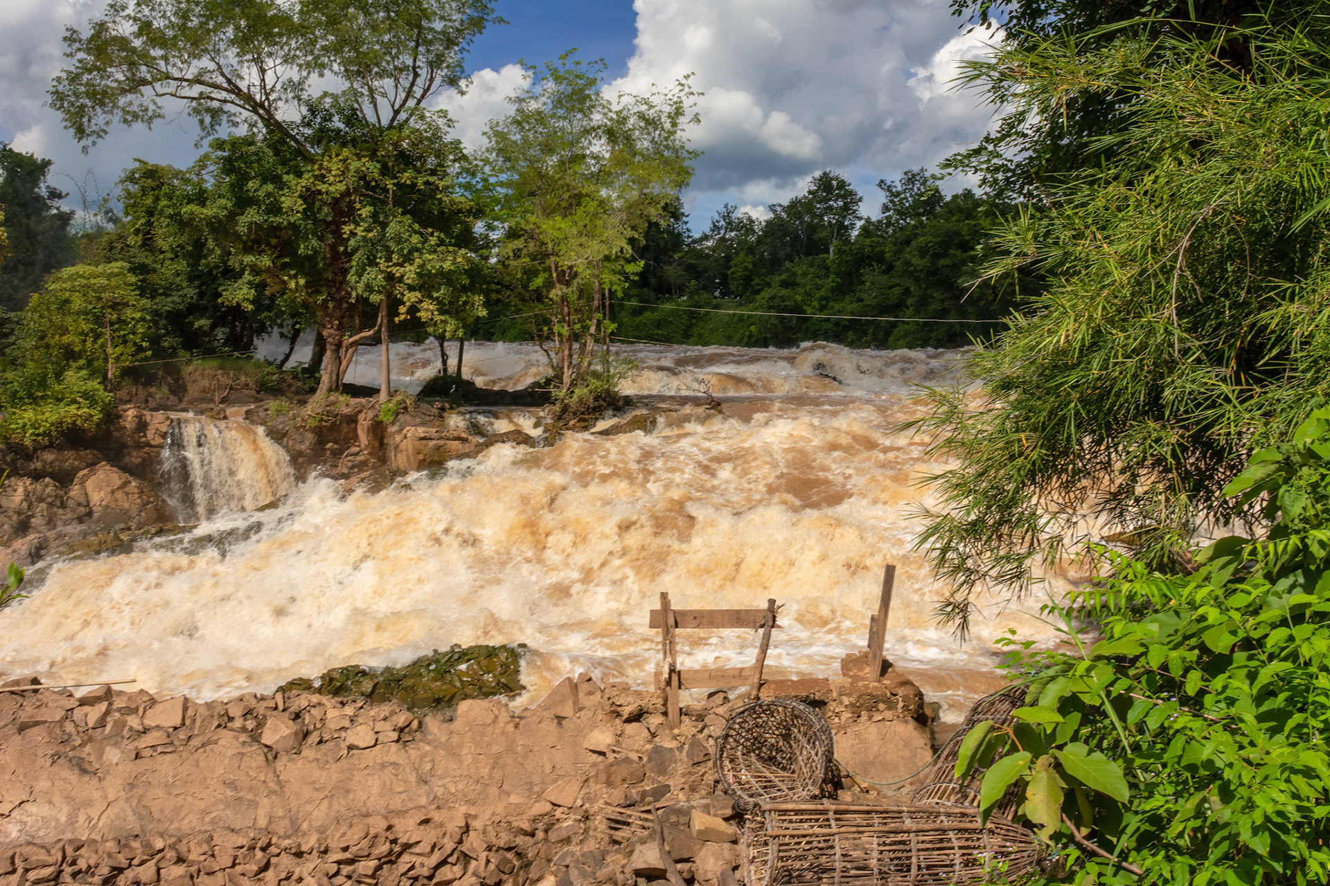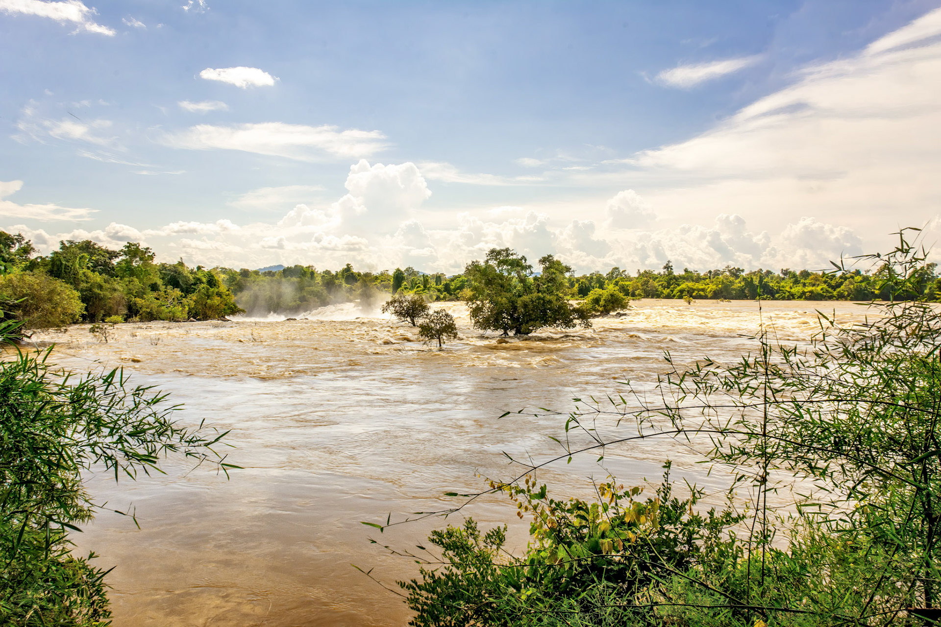 "The Khone Falls is the prime reason why the Mekong river is not fully navigable into China" and the most impressive waterfall I've seen even though really it's more a cascade of rapids rather than a waterfall. "The highest falls reach to 21 metres (69 ft); the succession of rapids stretch 9.7 km (6.0 mi) of the river's length. The average discharge of the cataract is nearly 11,000 m3/s (390,000 cu ft/s), with the highest flow on record at over 49,000 m3/s (1,700,000 cu ft/s)." See Wikipedia