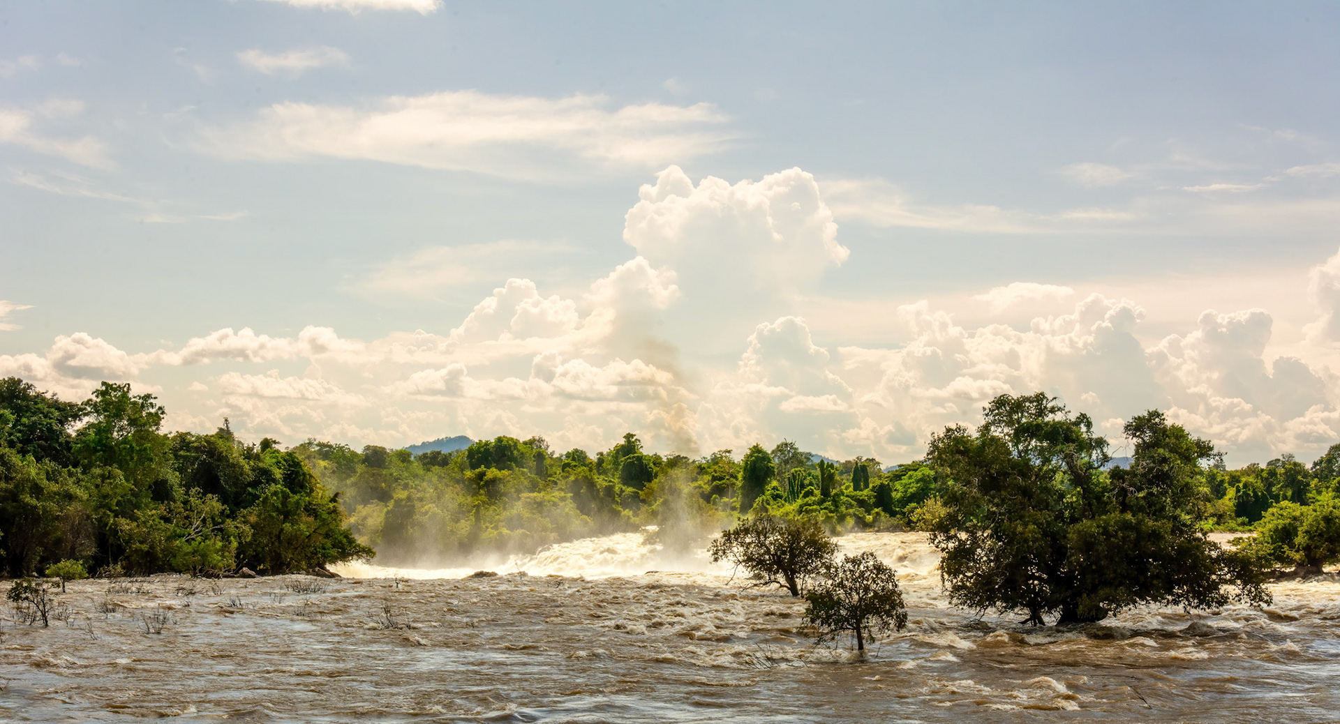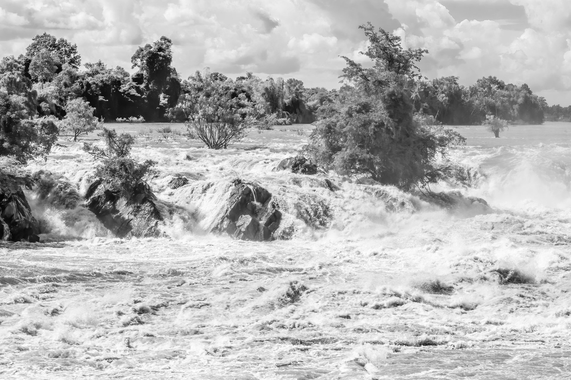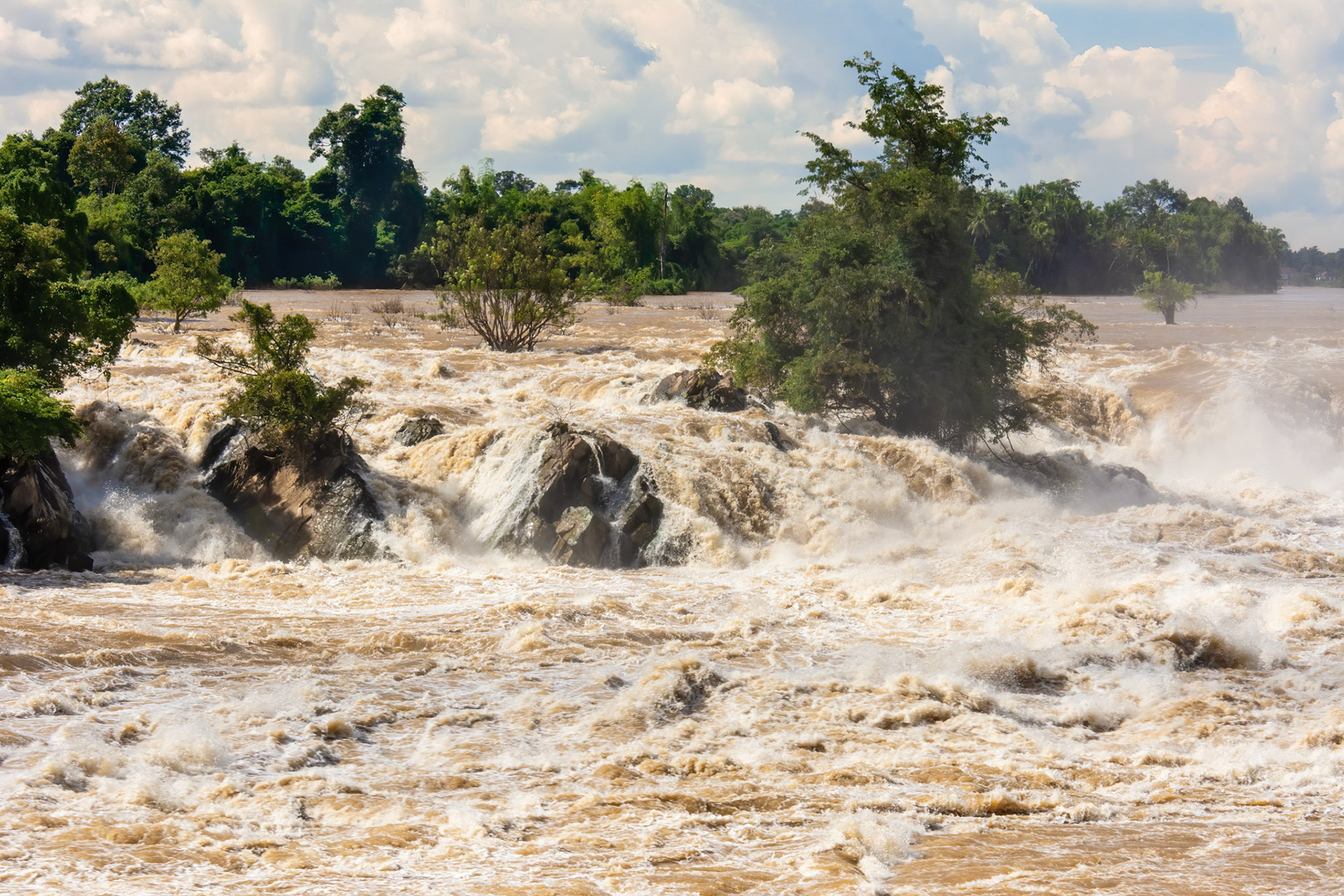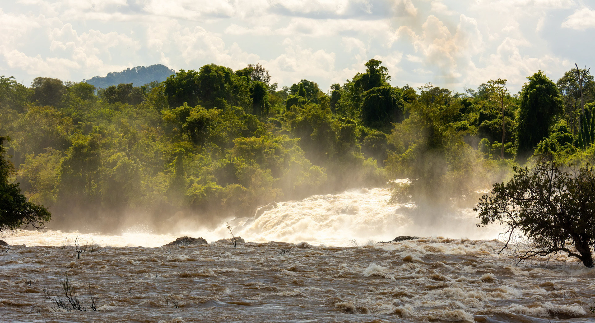 "The Khone Falls is the prime reason why the Mekong river is not fully navigable into China" and the most impressive waterfall I've seen even though really it's more a cascade of rapids rather than a waterfall. "The highest falls reach to 21 metres (69 ft); the succession of rapids stretch 9.7 km (6.0 mi) of the river's length. The average discharge of the cataract is nearly 11,000 m3/s (390,000 cu ft/s), with the highest flow on record at over 49,000 m3/s (1,700,000 cu ft/s)." See Wikipedia