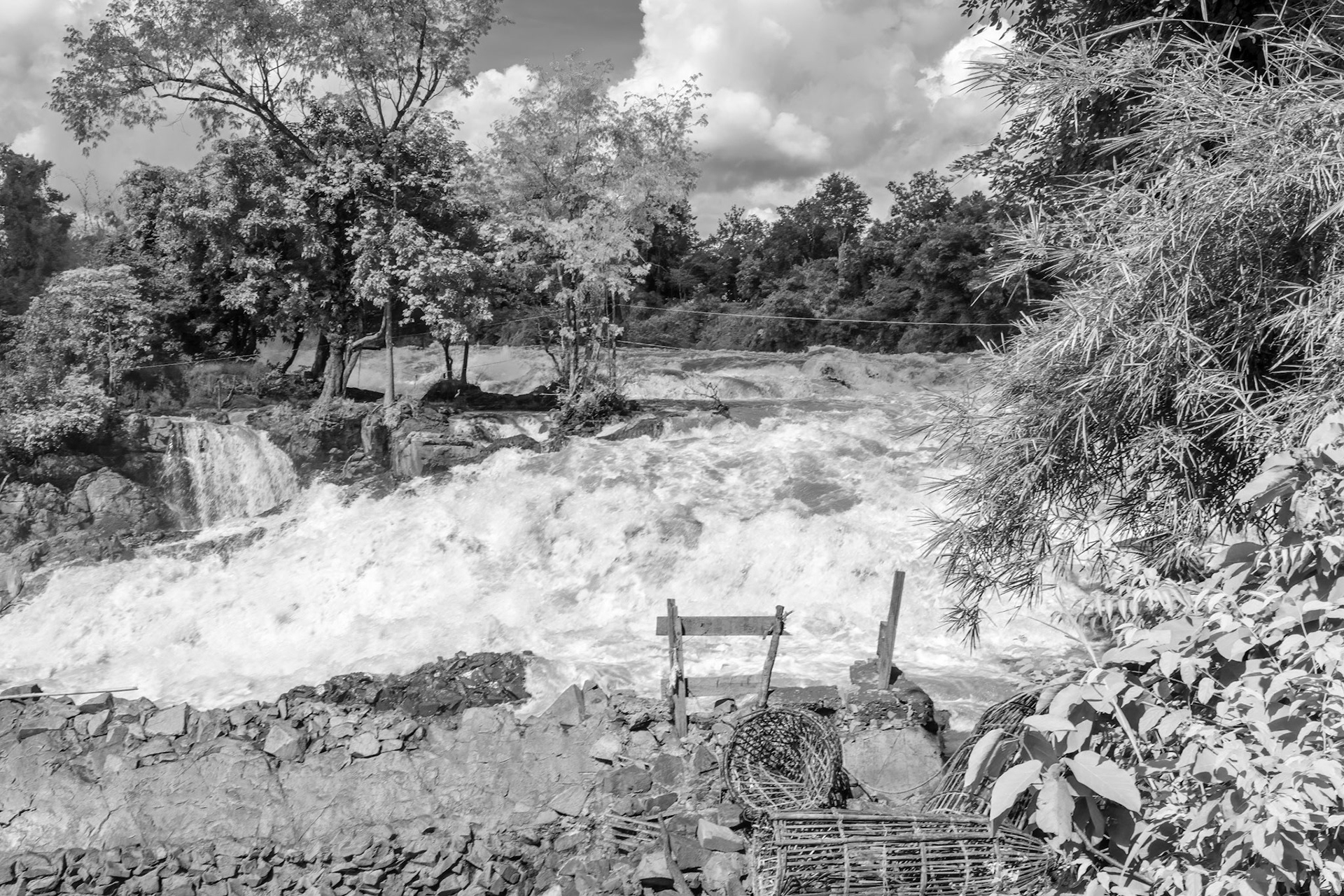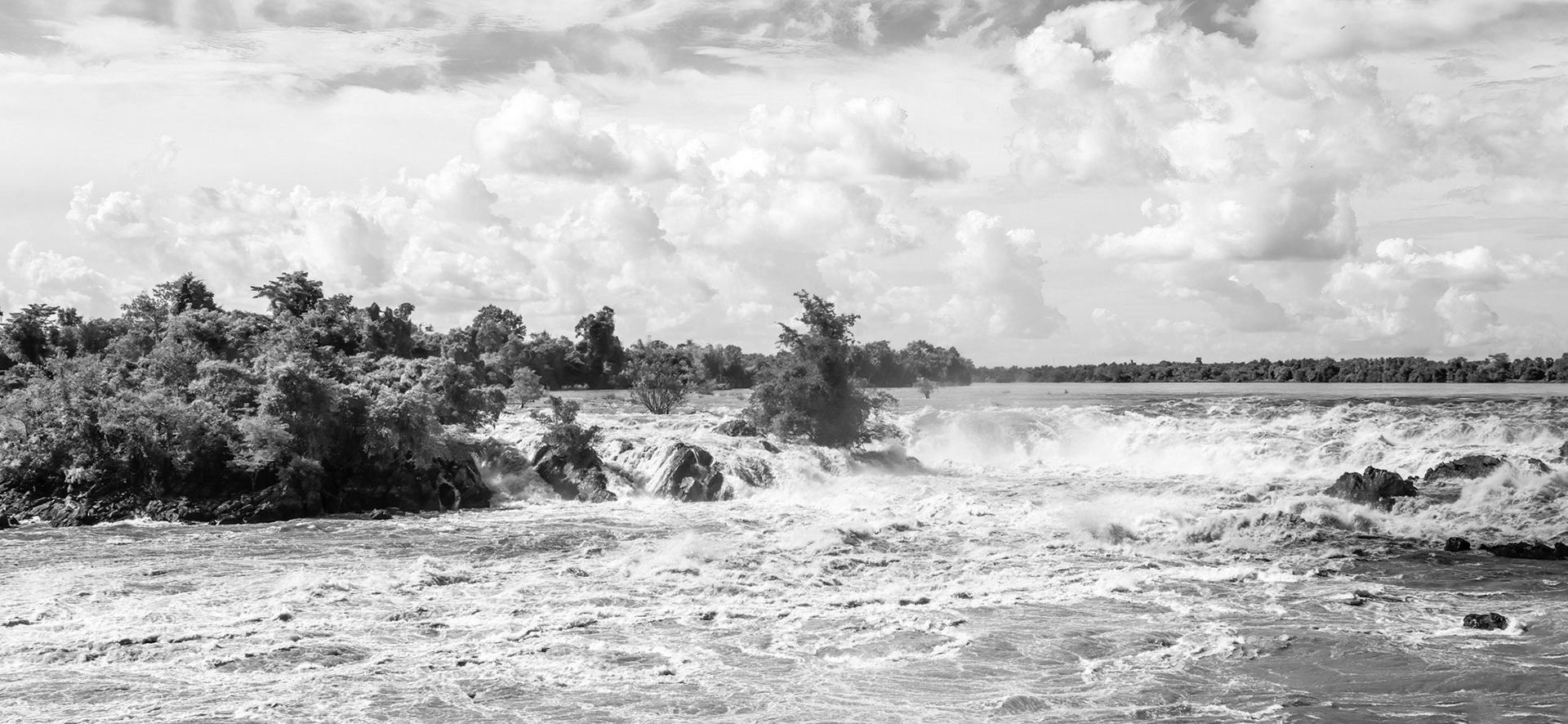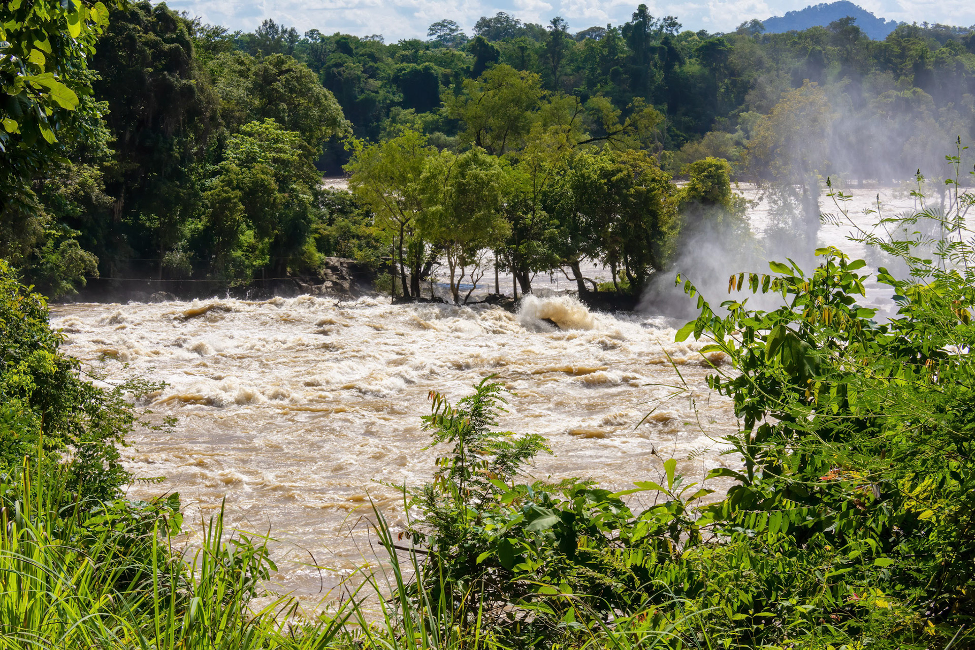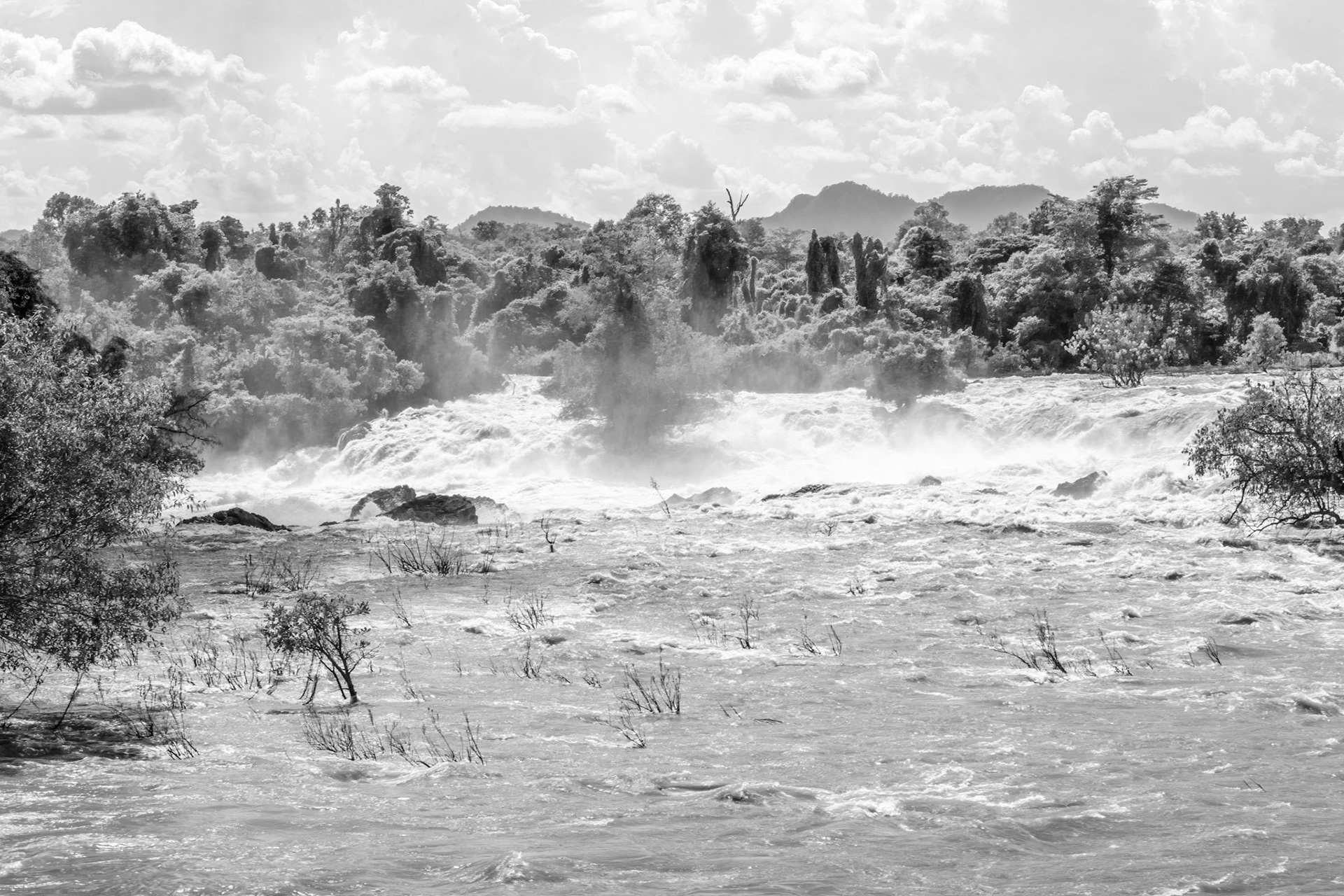 "The Khone Falls is the prime reason why the Mekong river is not fully navigable into China" and the most impressive waterfall I've seen even though really it's more a cascade of rapids rather than a waterfall. "The highest falls reach to 21 metres (69 ft); the succession of rapids stretch 9.7 km (6.0 mi) of the river's length. The average discharge of the cataract is nearly 11,000 m3/s (390,000 cu ft/s), with the highest flow on record at over 49,000 m3/s (1,700,000 cu ft/s)." See Wikipedia
