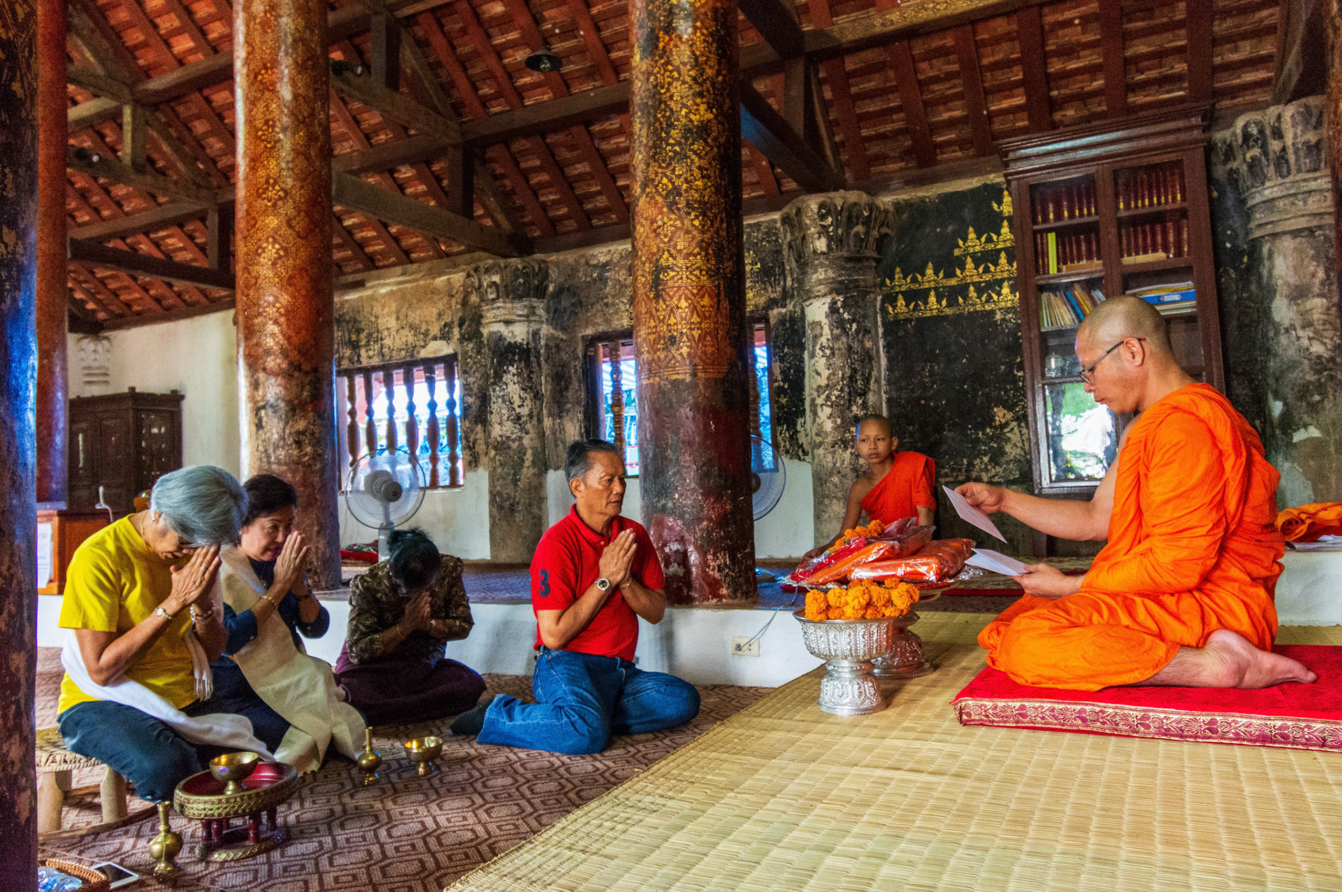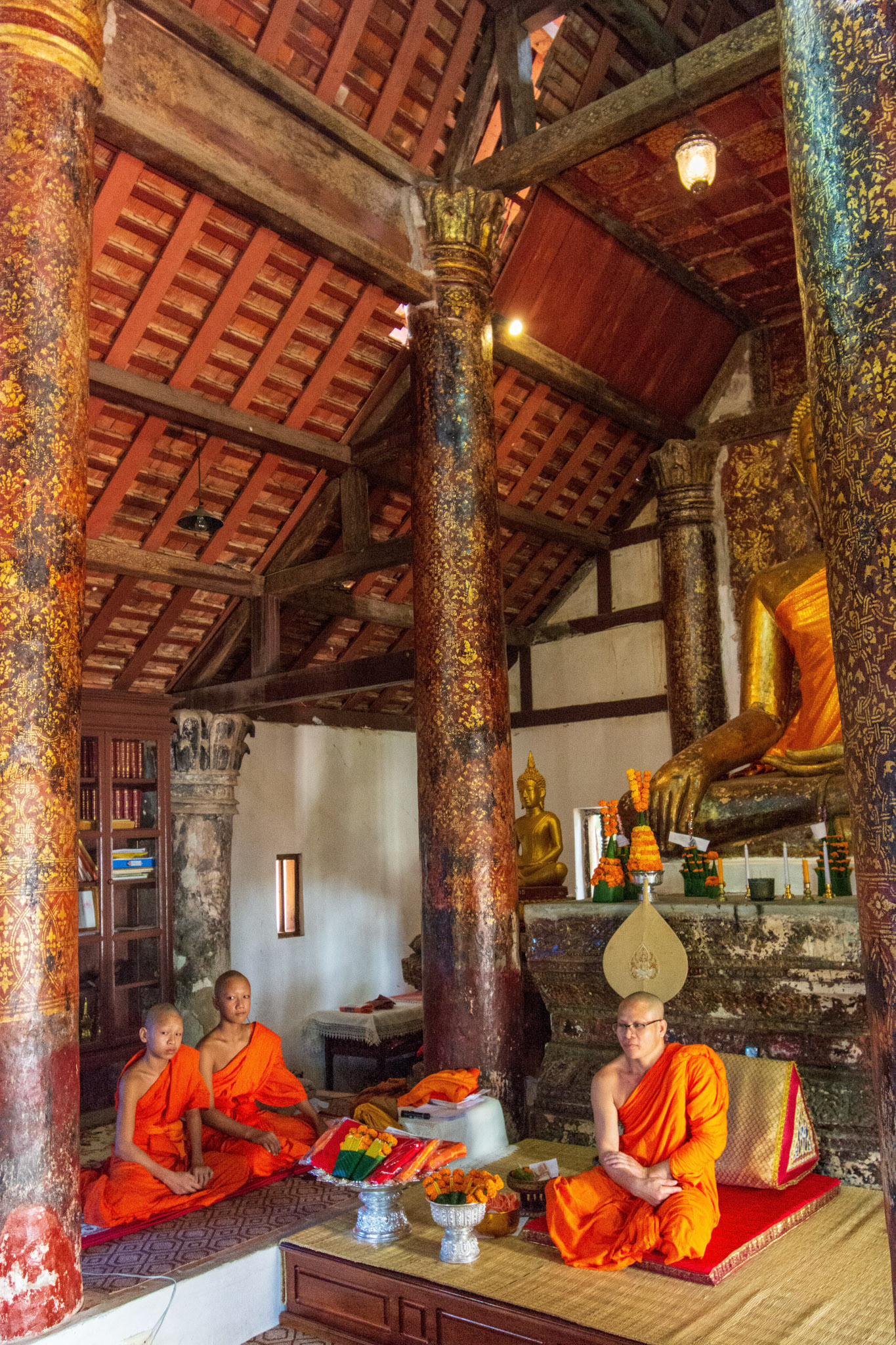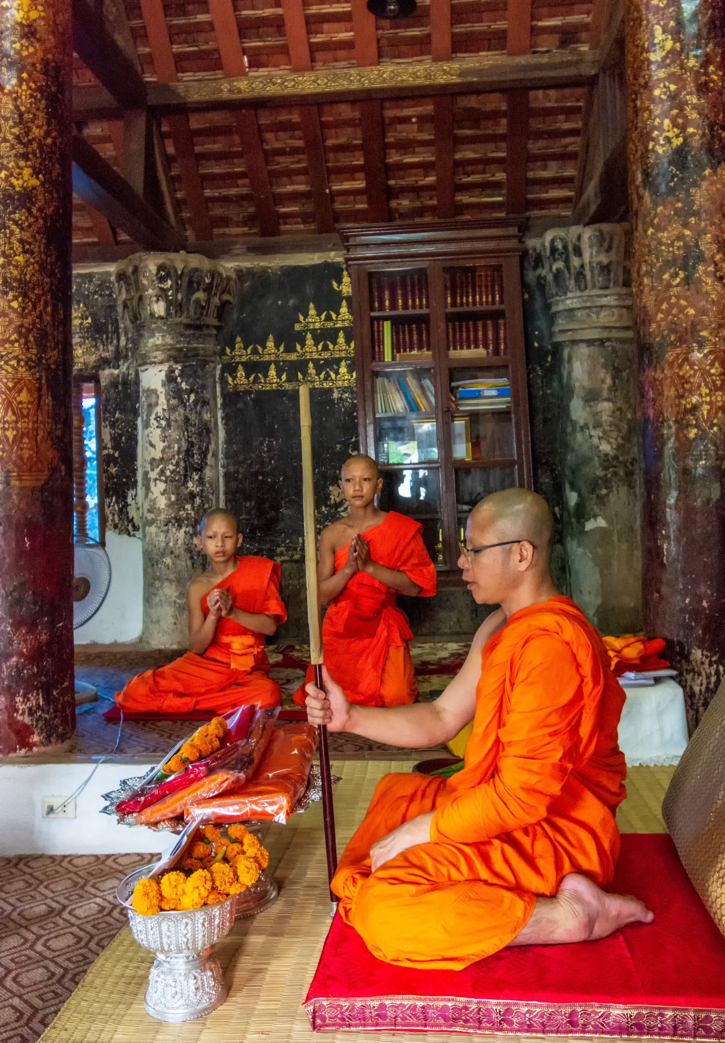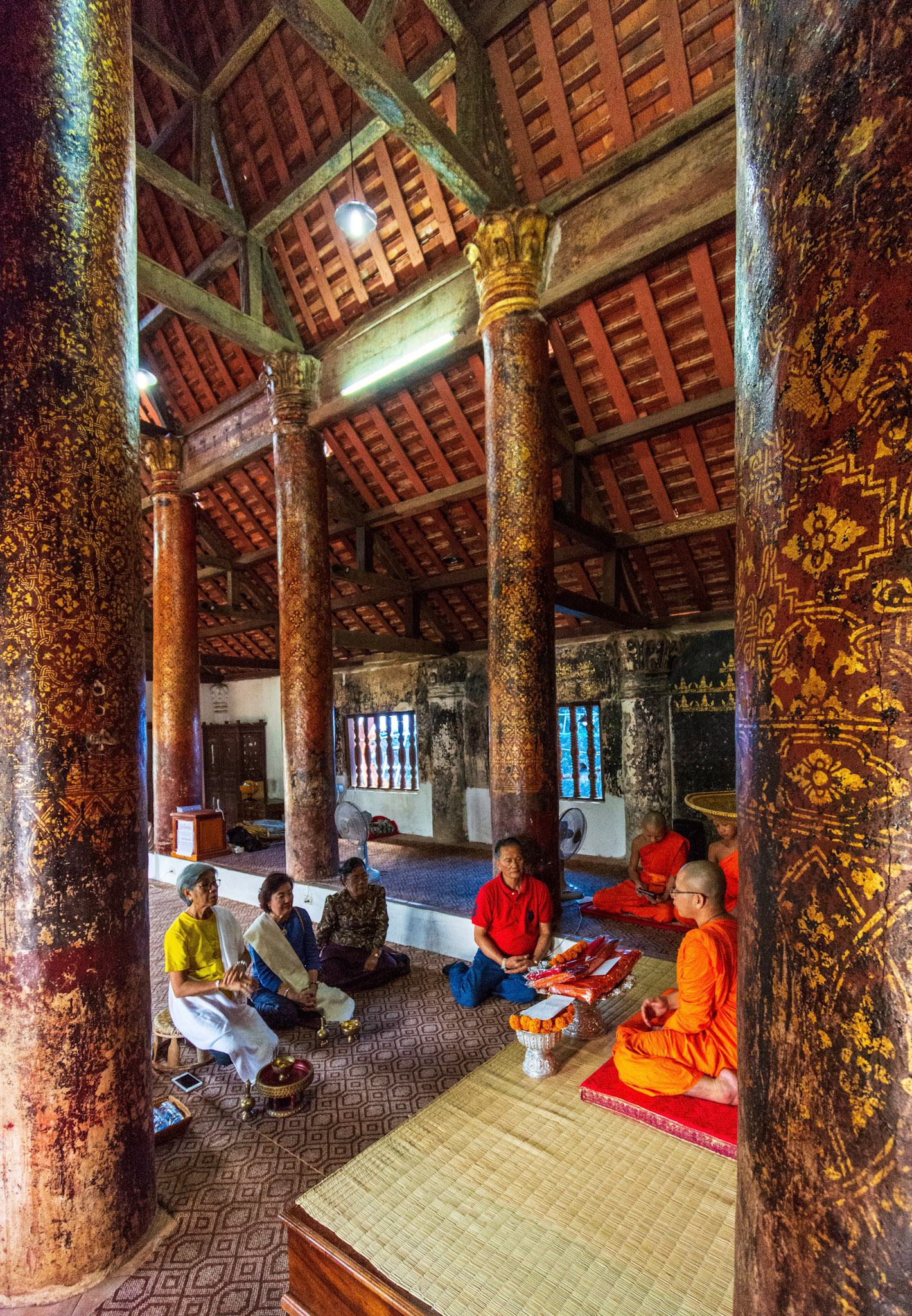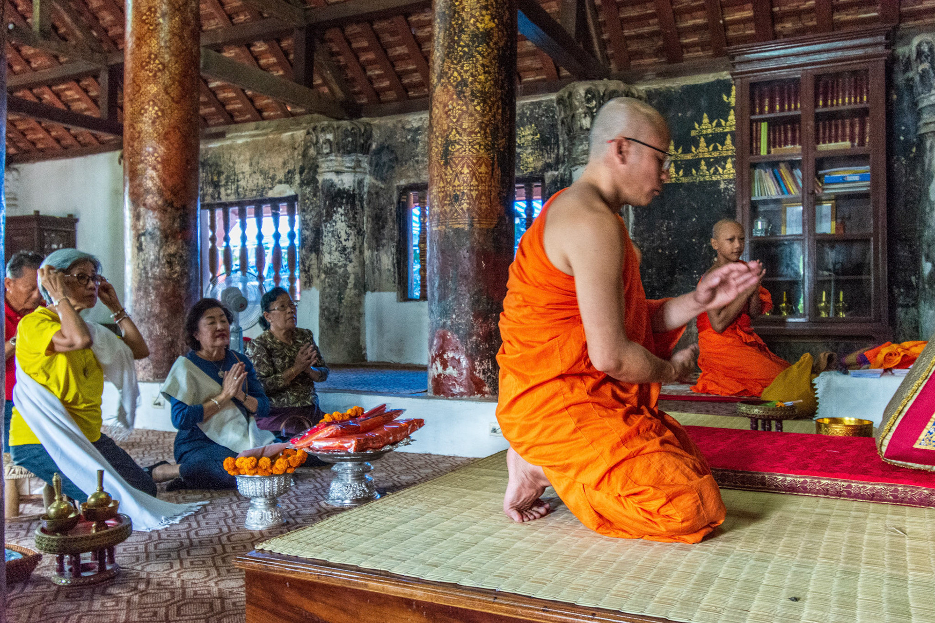 Boun Heua Fai (Fireboat Festival) day with the parade, weather permitting, due to take place that night. I went into Wat Siphoutthabath to see if anything was happening and was almost immediately greeted by a monk and invited into a prayer service- he’d seen my camera and wanted me to take shots during the service. Apart from the novices, there was what seemed like a prominent family group who during the service gave numerous offerings to the temple. Afterwards the monk walked the family group, a couple of other tourists and me in tow around the grounds.
