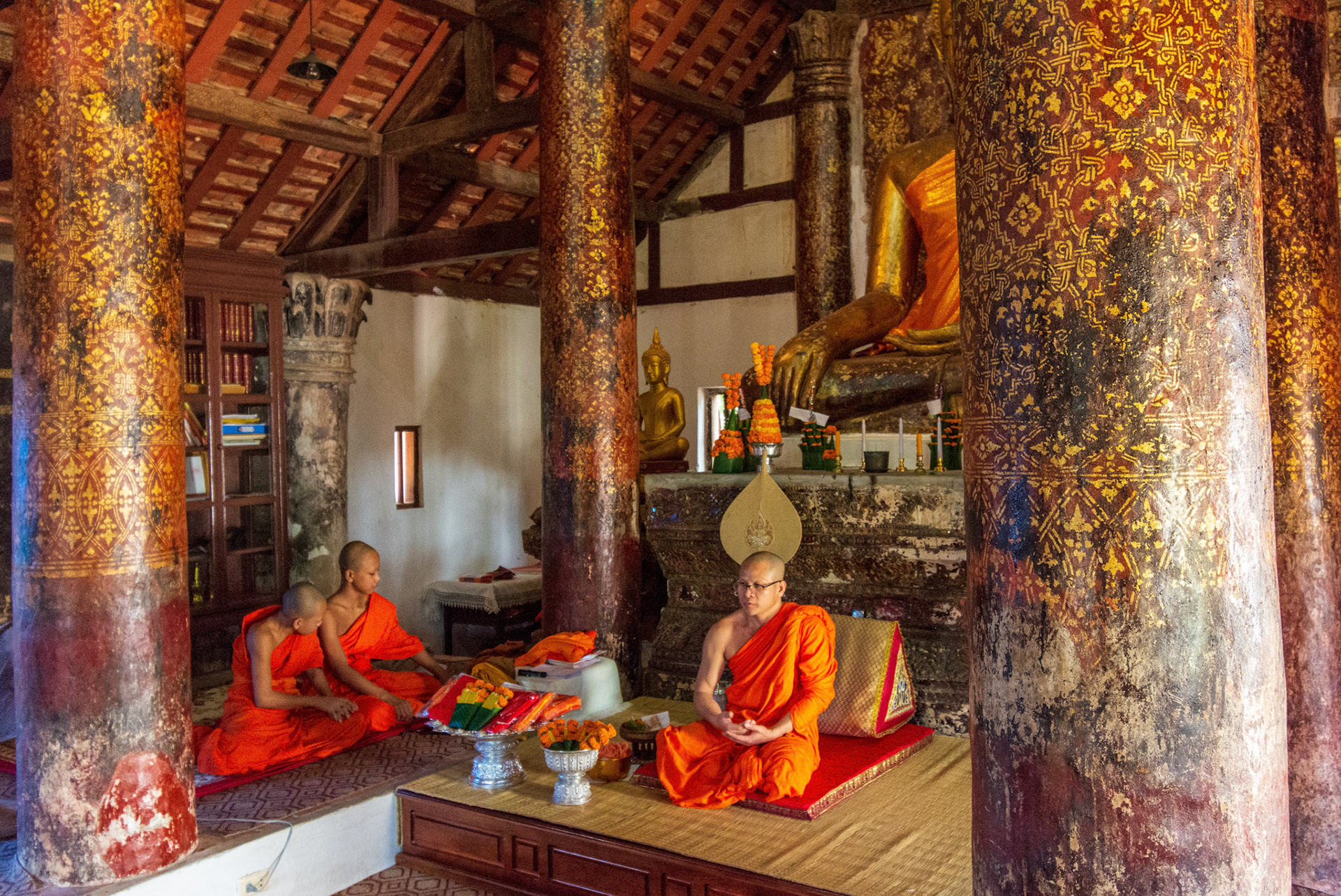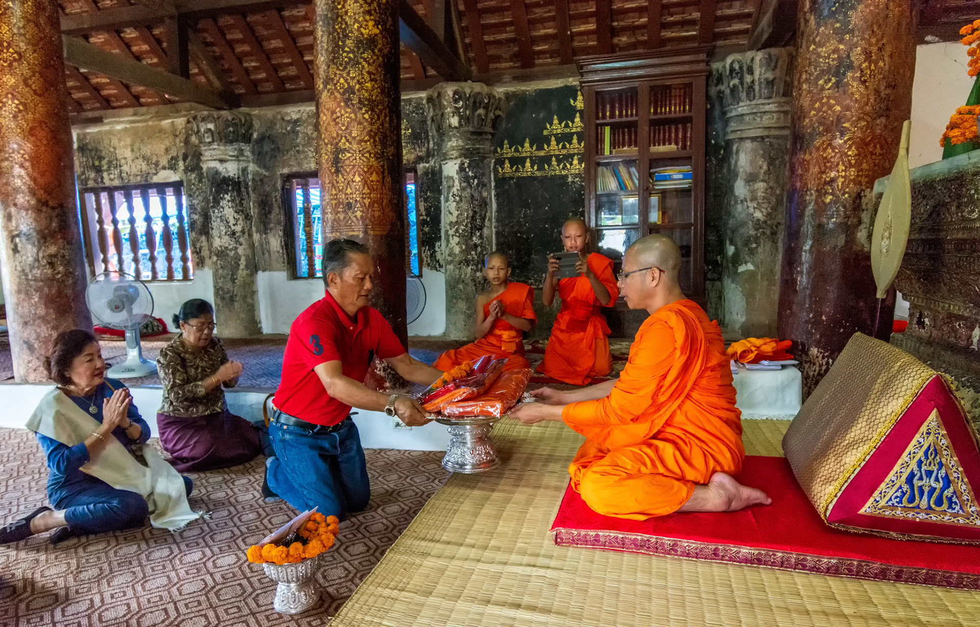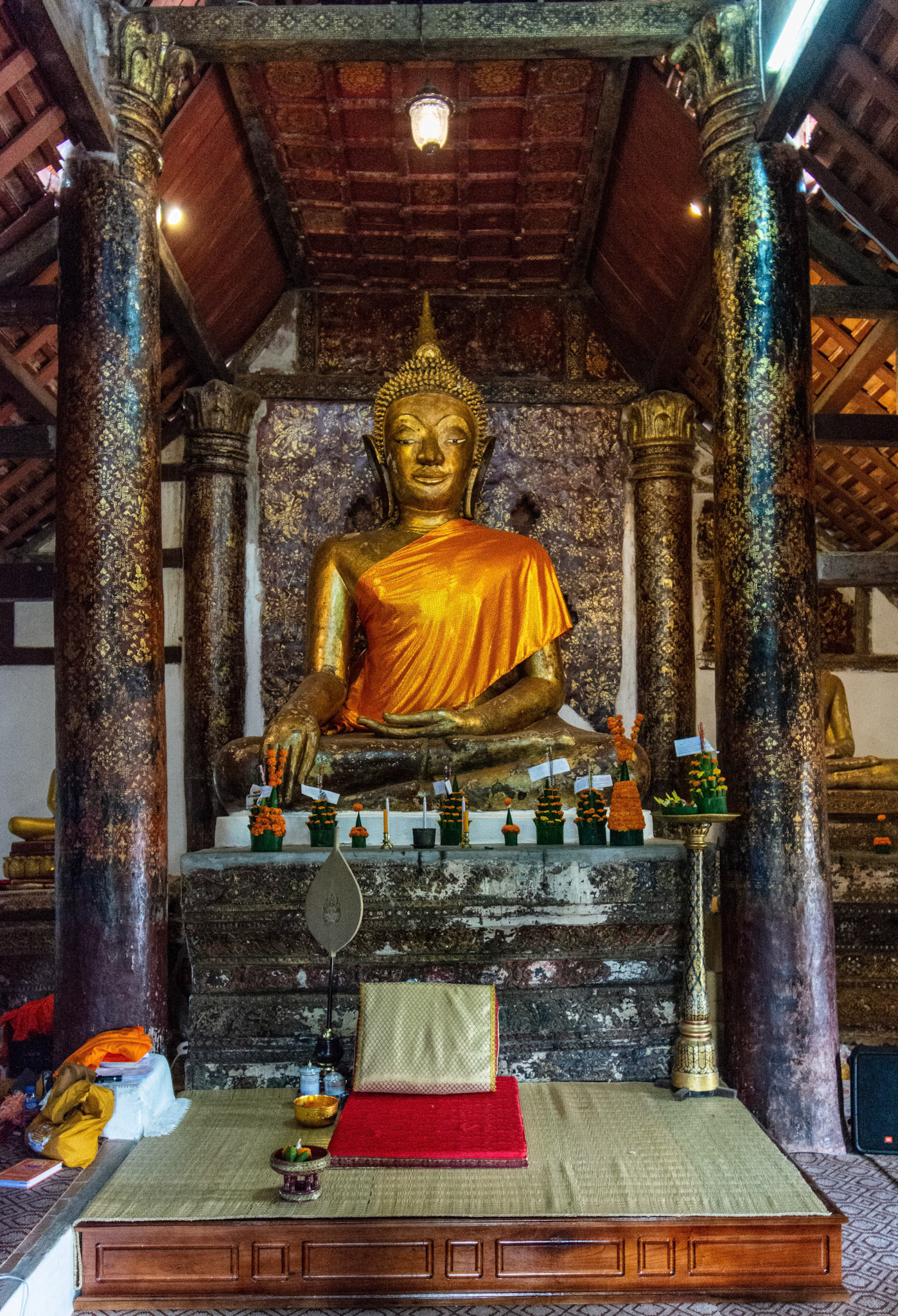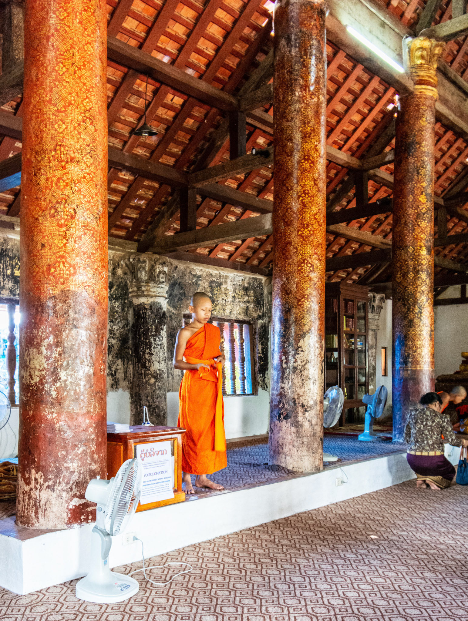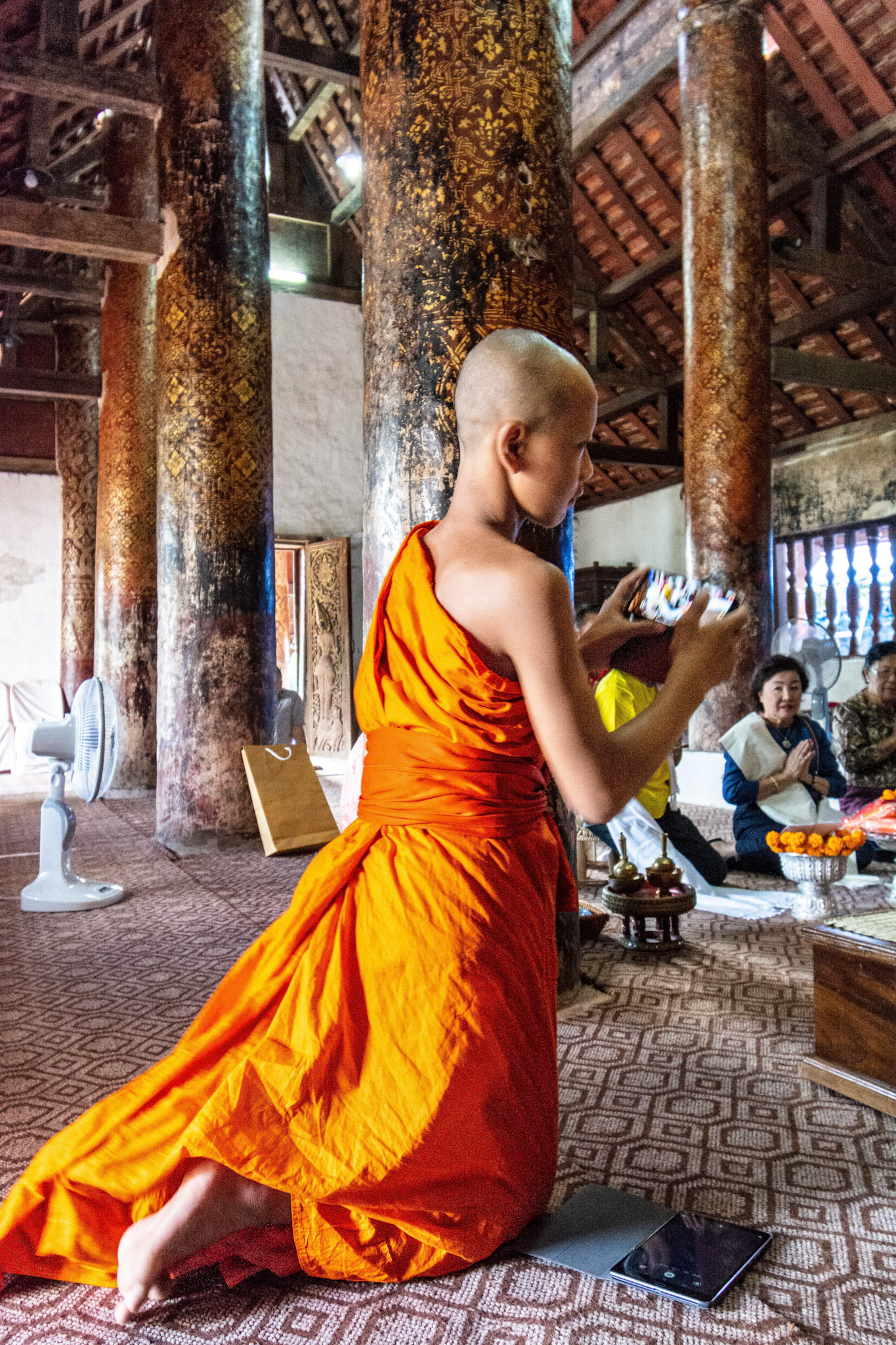 Boun Heua Fai (Fireboat Festival) day with the parade, weather permitting, due to take place that night. I went into Wat Siphoutthabath to see if anything was happening and was almost immediately greeted by a monk and invited into a prayer service- he’d seen my camera and wanted me to take shots during the service. Apart from the novices, there was what seemed like a prominent family group who during the service gave numerous offerings to the temple. Afterwards the monk walked the family group, a couple of other tourists and me in tow around the grounds.