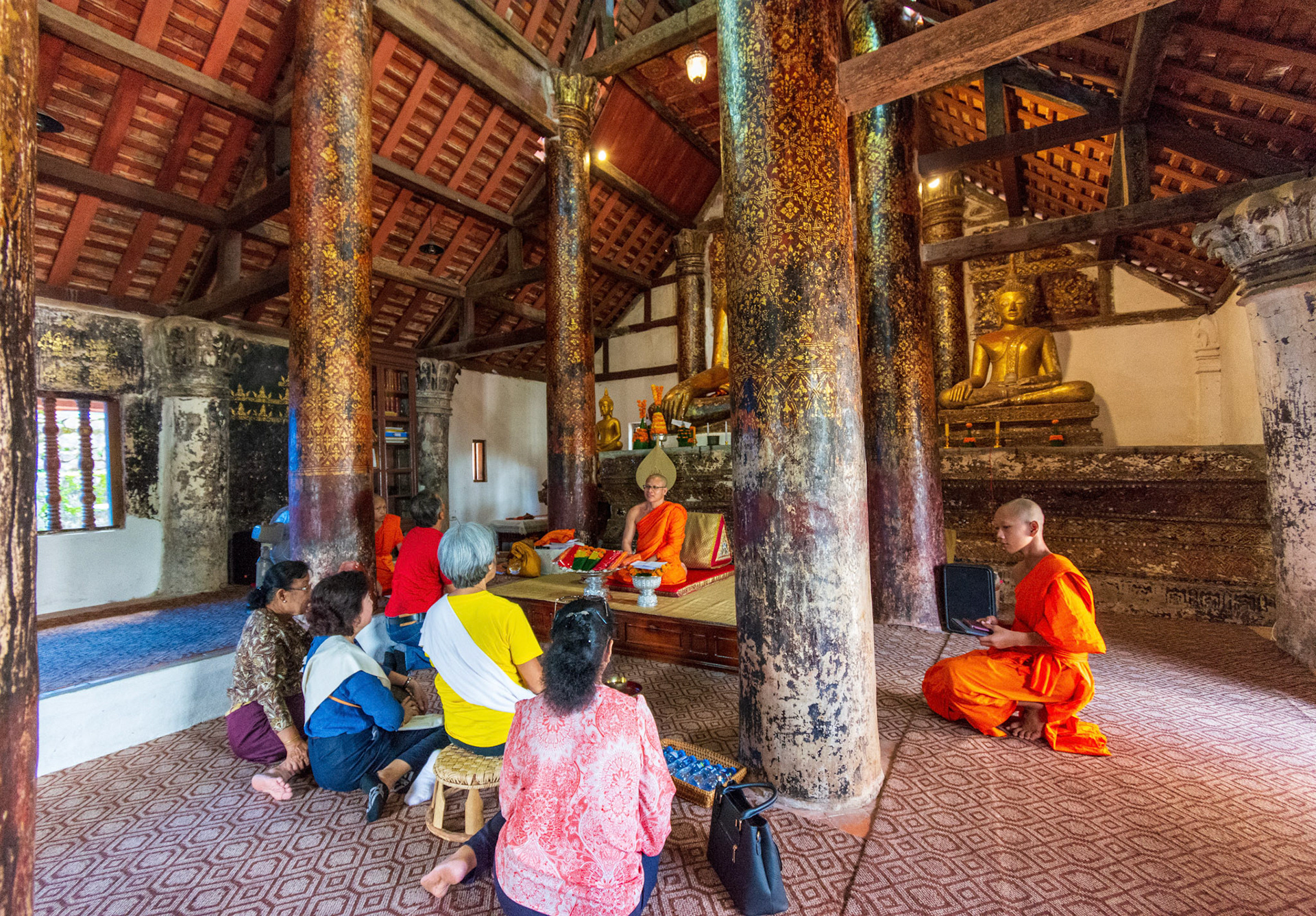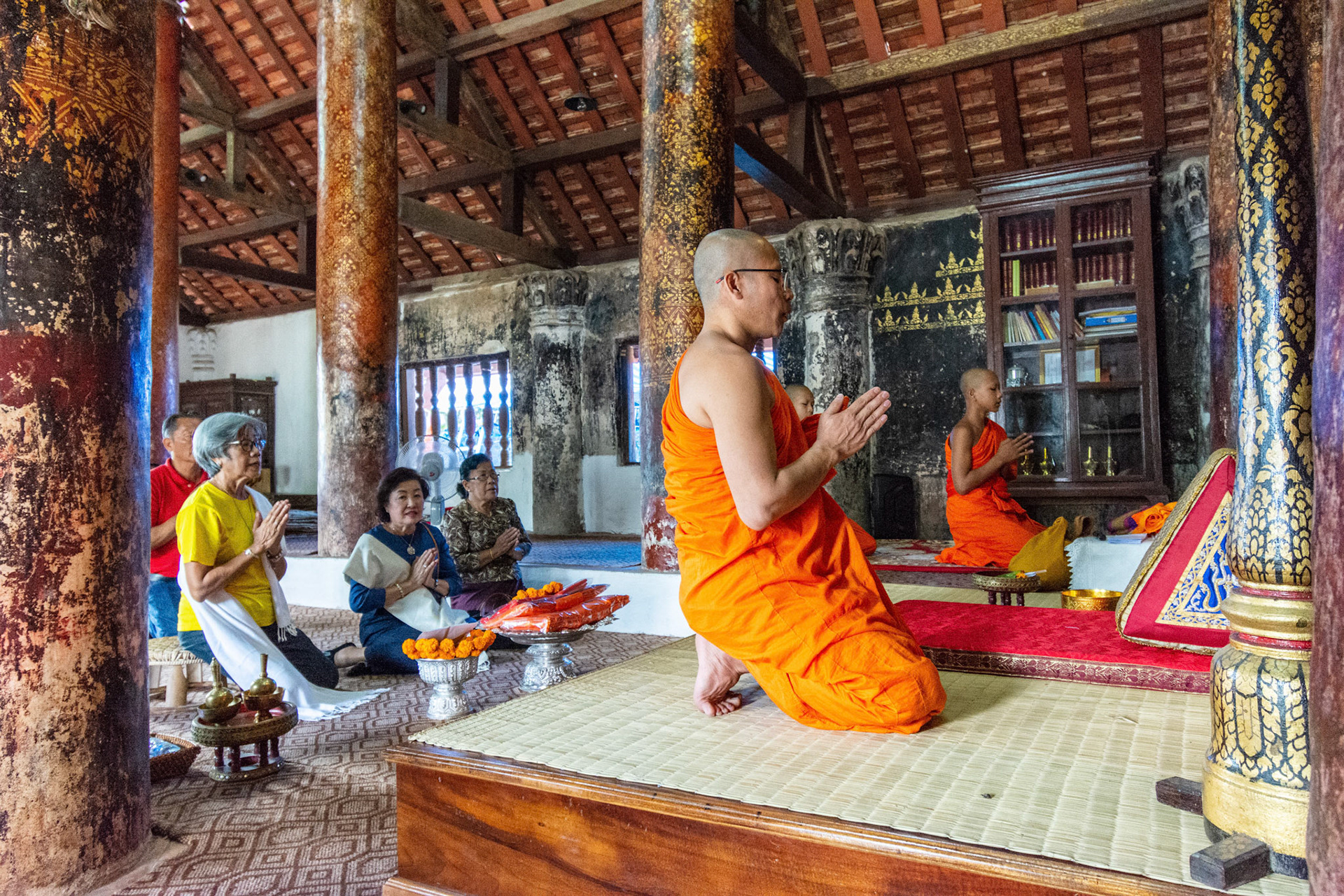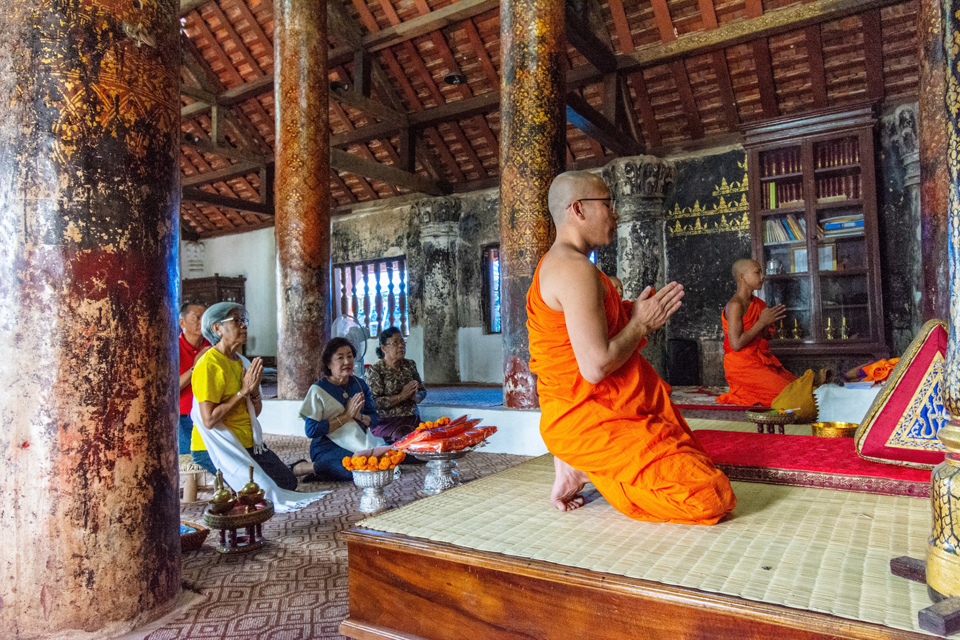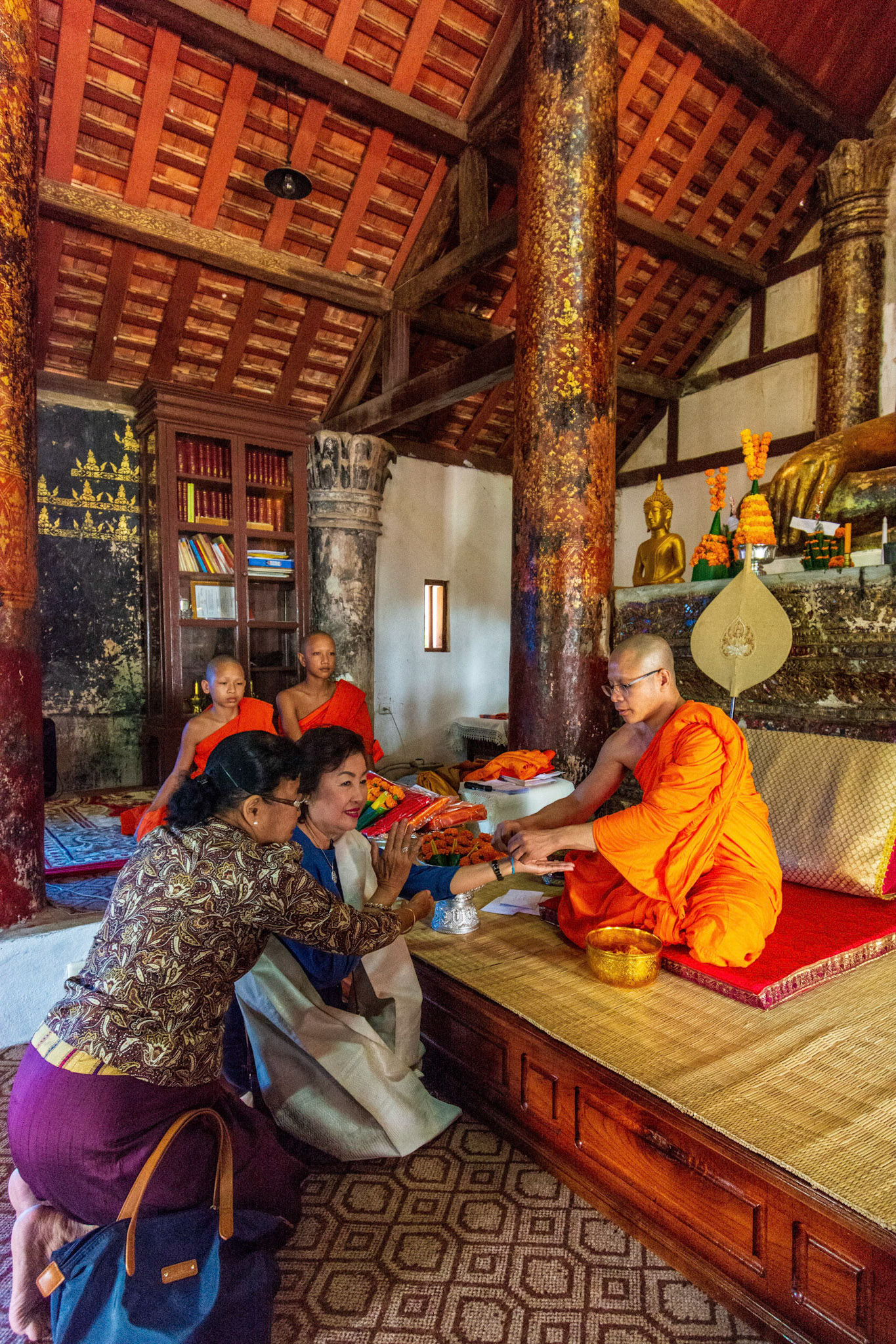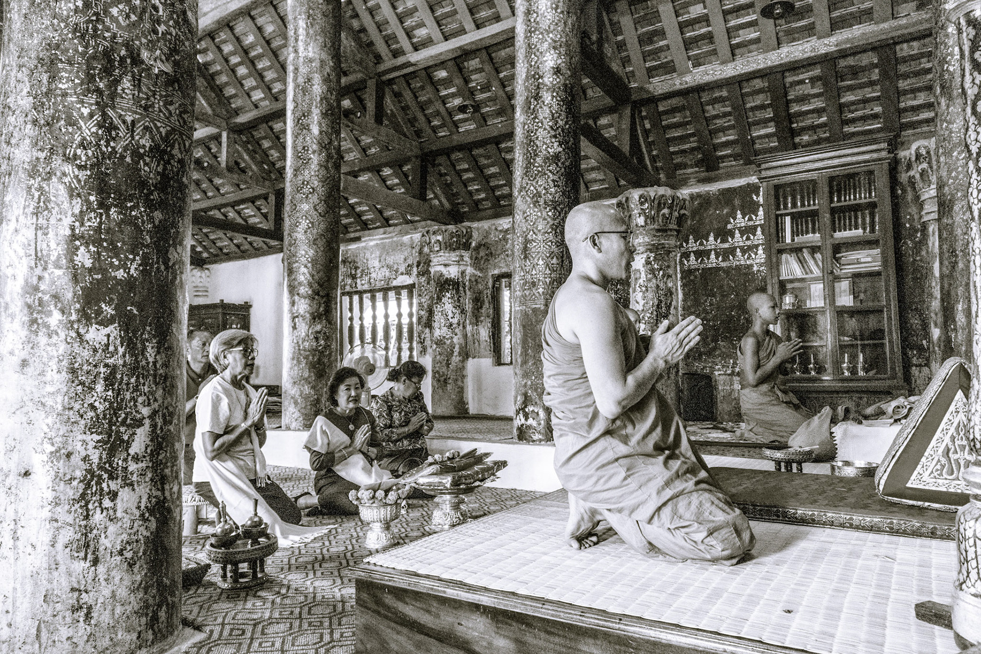 Boun Heua Fai (Fireboat Festival) day with the parade, weather permitting, due to take place that night. I went into Wat Siphoutthabath to see if anything was happening and was almost immediately greeted by a monk and invited into a prayer service- he’d seen my camera and wanted me to take shots during the service. Apart from the novices, there was what seemed like a prominent family group who during the service gave numerous offerings to the temple. Afterwards the monk walked the family group, a couple of other tourists and me in tow around the grounds.