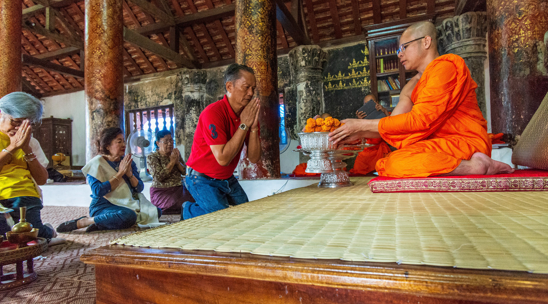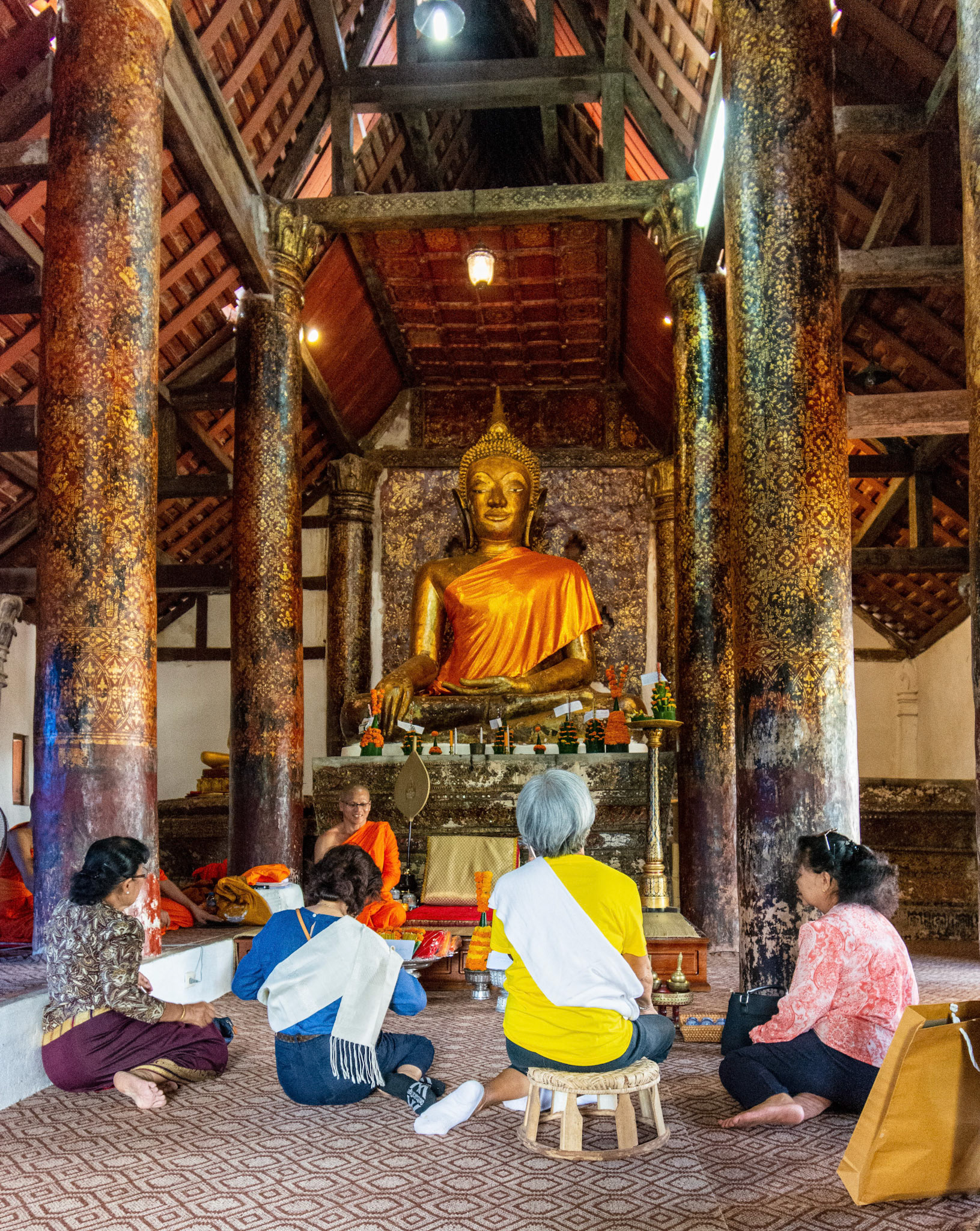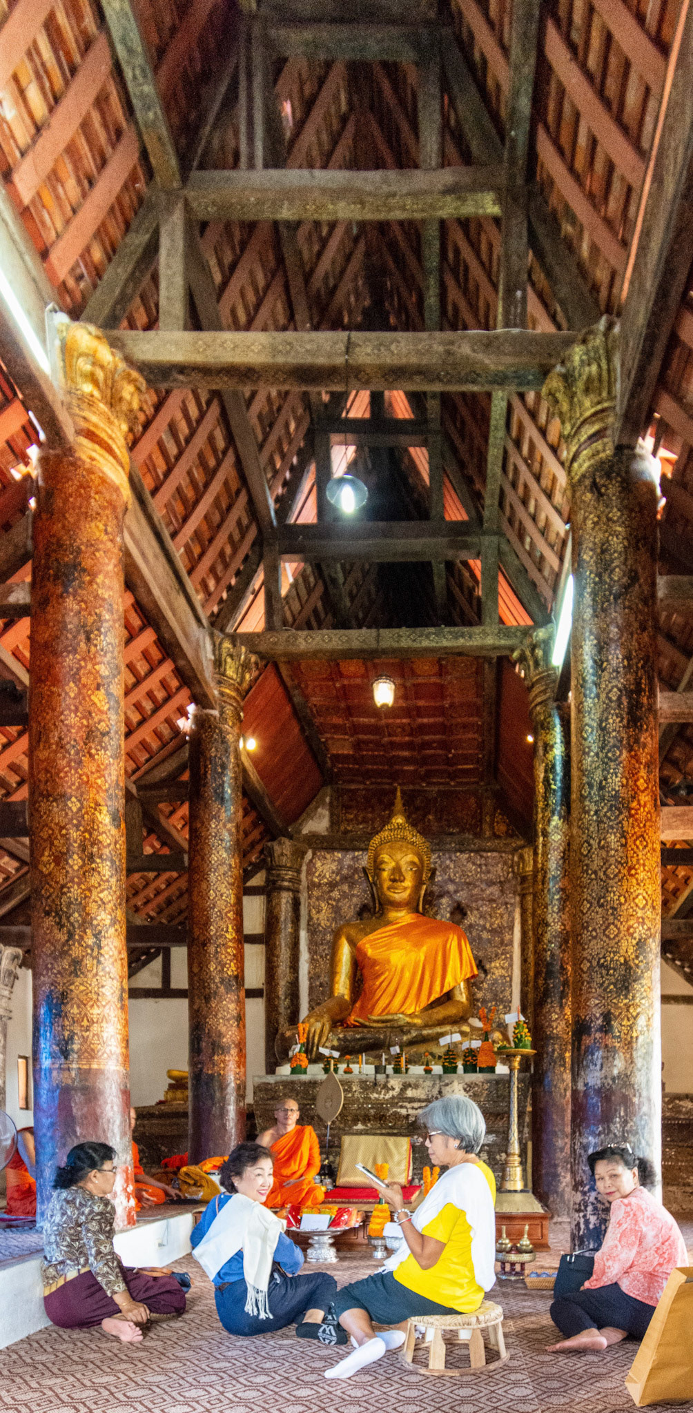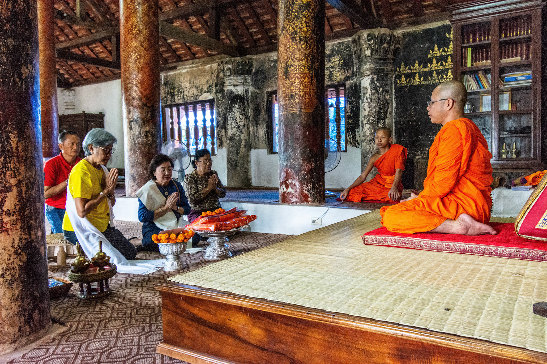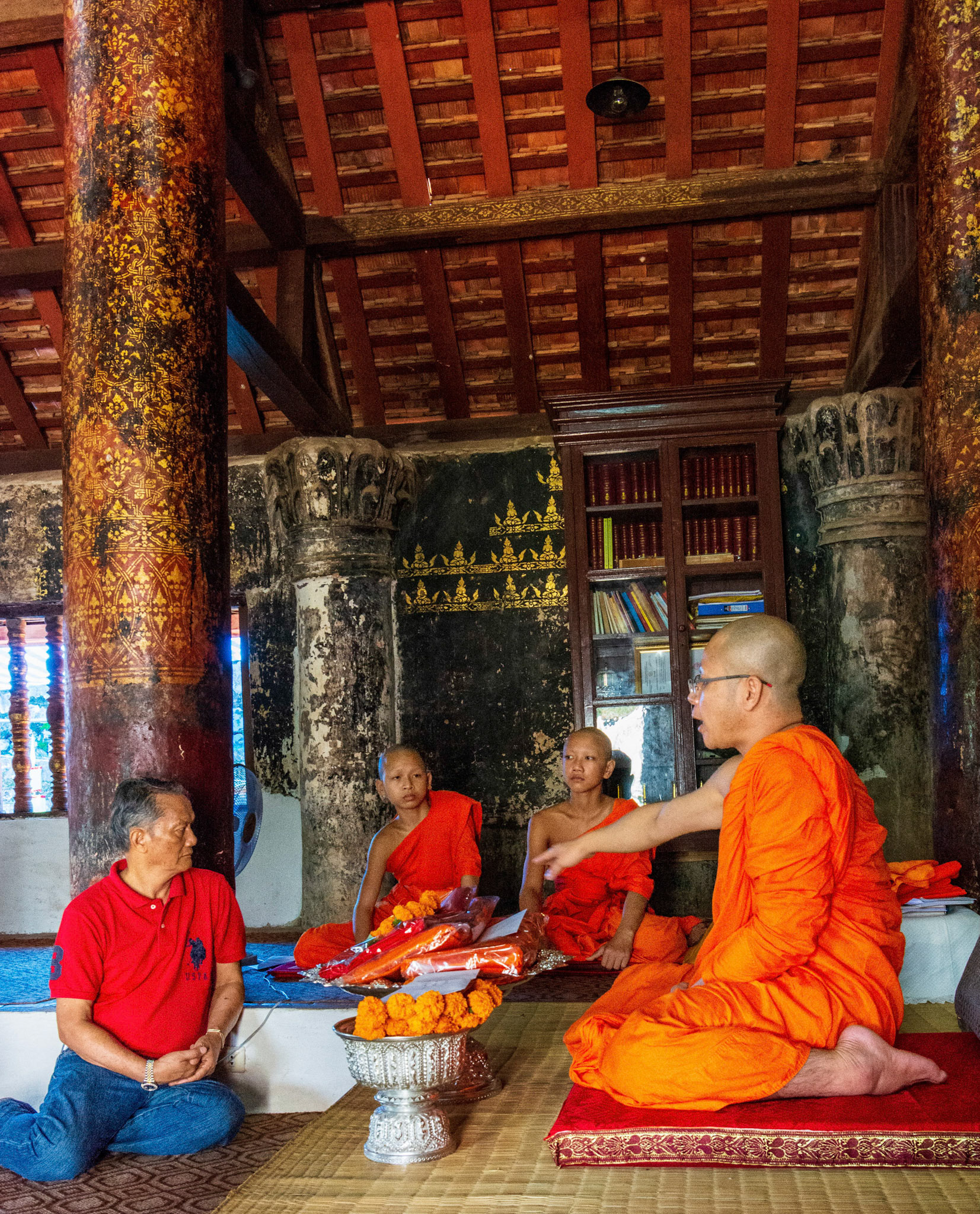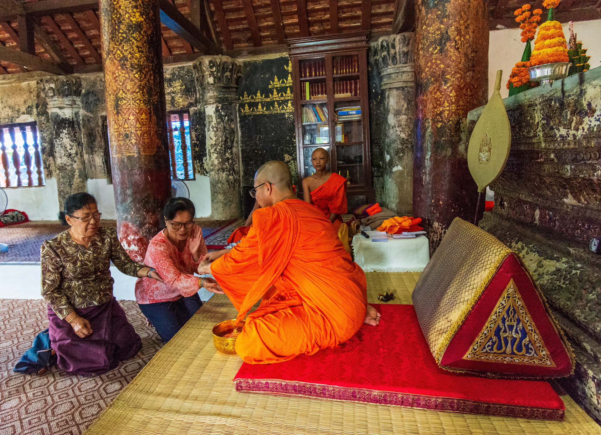 Boun Heua Fai (Fireboat Festival) day with the parade, weather permitting, due to take place that night. I went into Wat Siphoutthabath to see if anything was happening and was almost immediately greeted by a monk and invited into a prayer service- he’d seen my camera and wanted me to take shots during the service. Apart from the novices, there was what seemed like a prominent family group who during the service gave numerous offerings to the temple. Afterwards the monk walked the family group, a couple of other tourists and me in tow around the grounds.