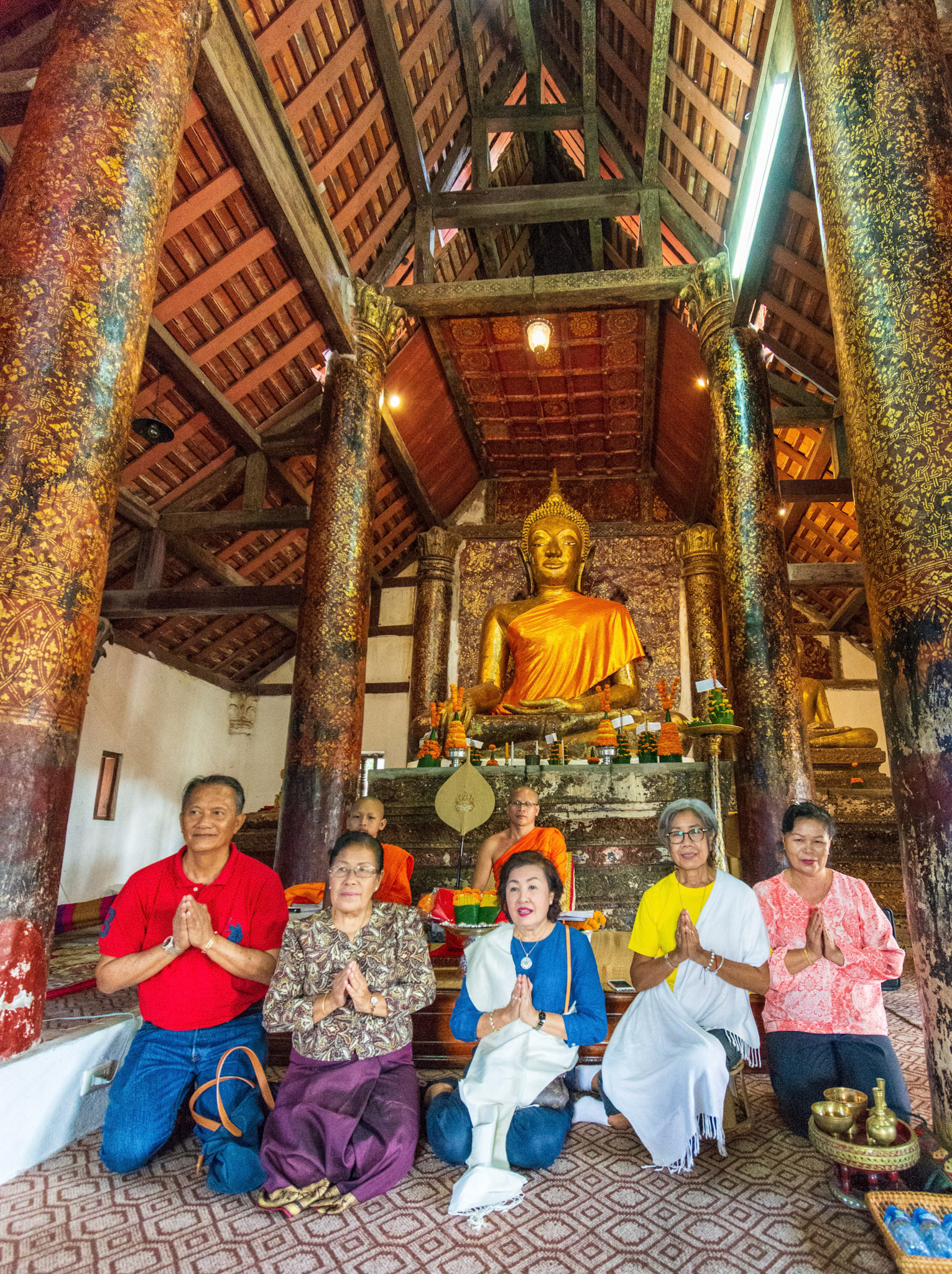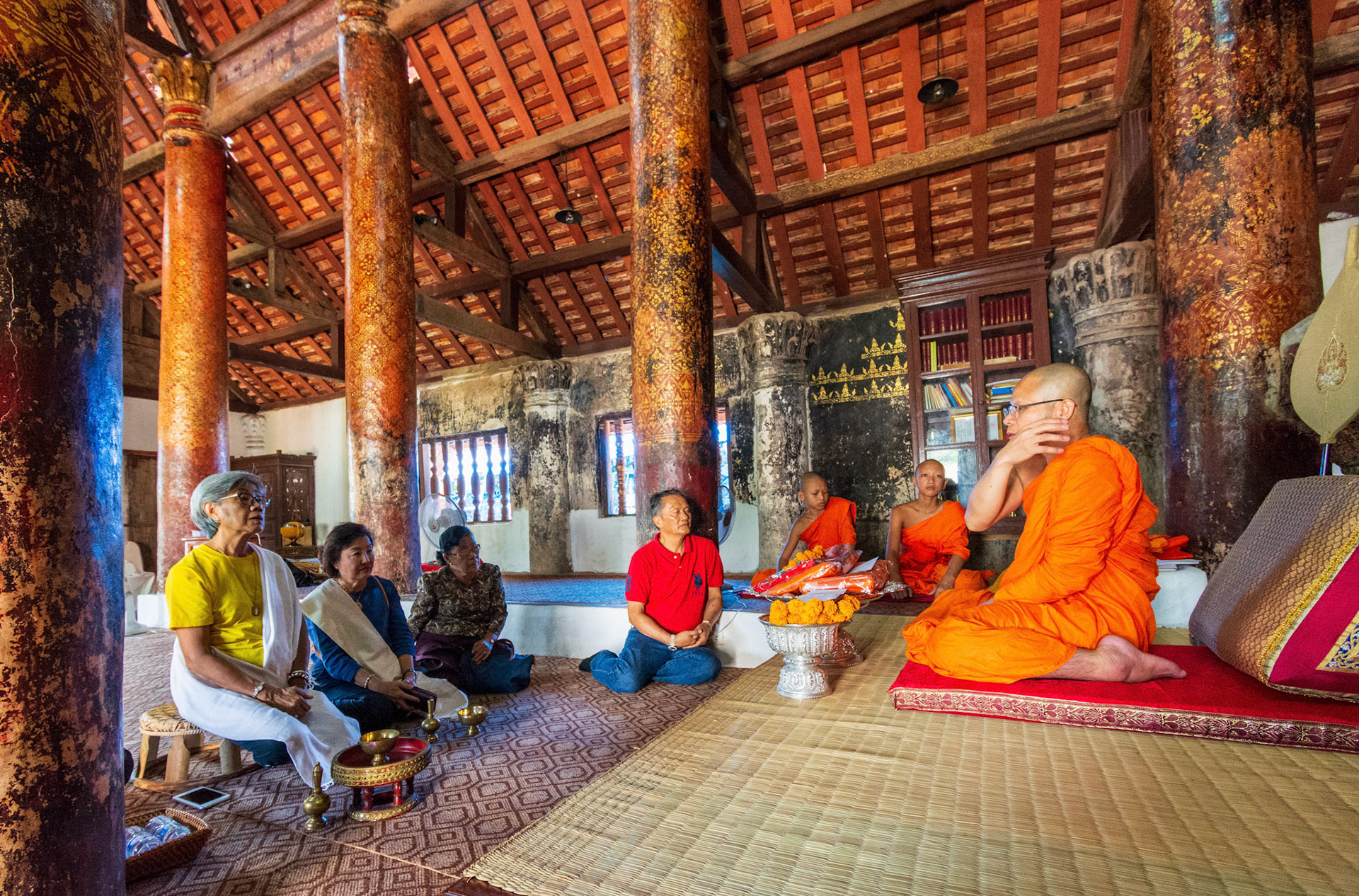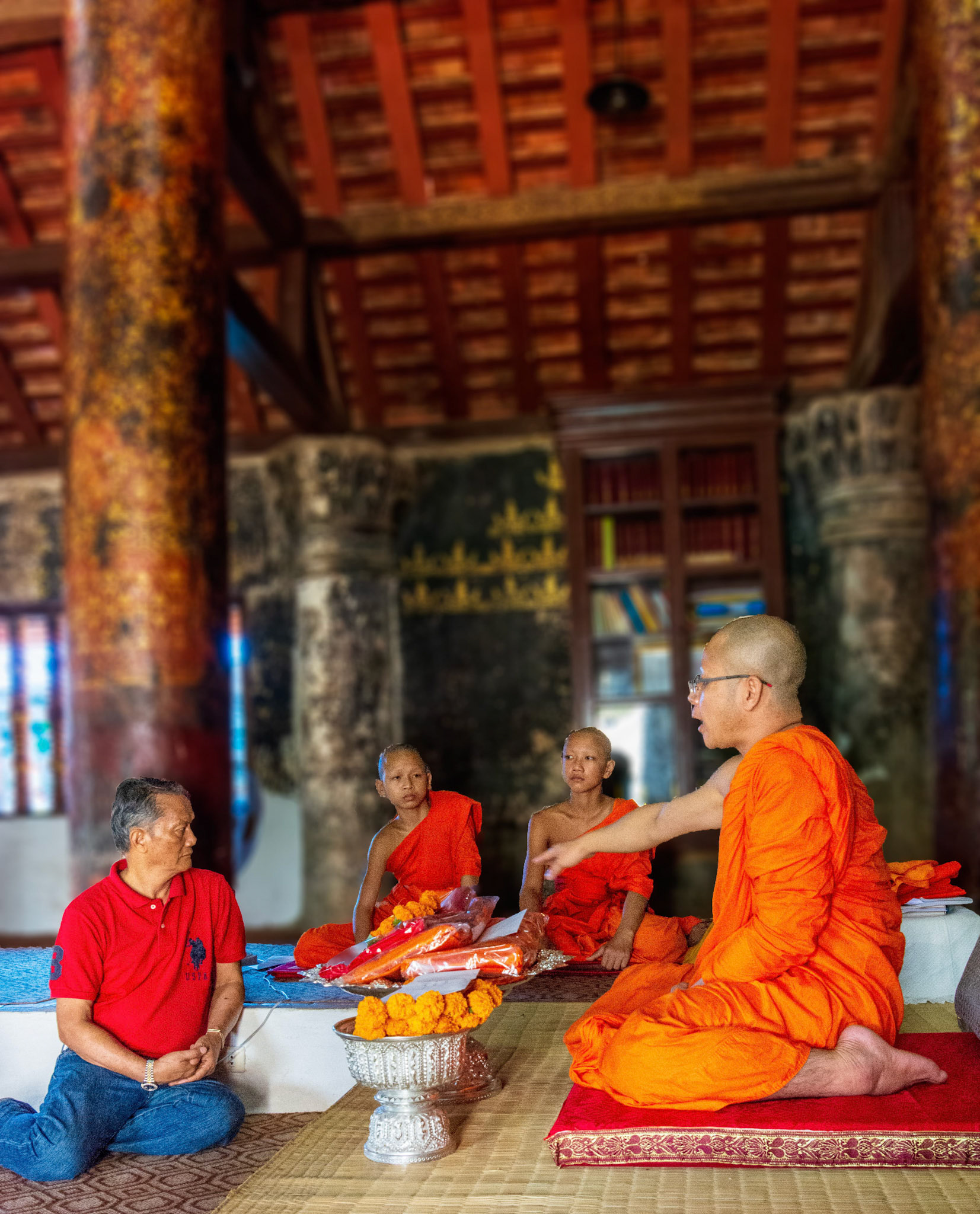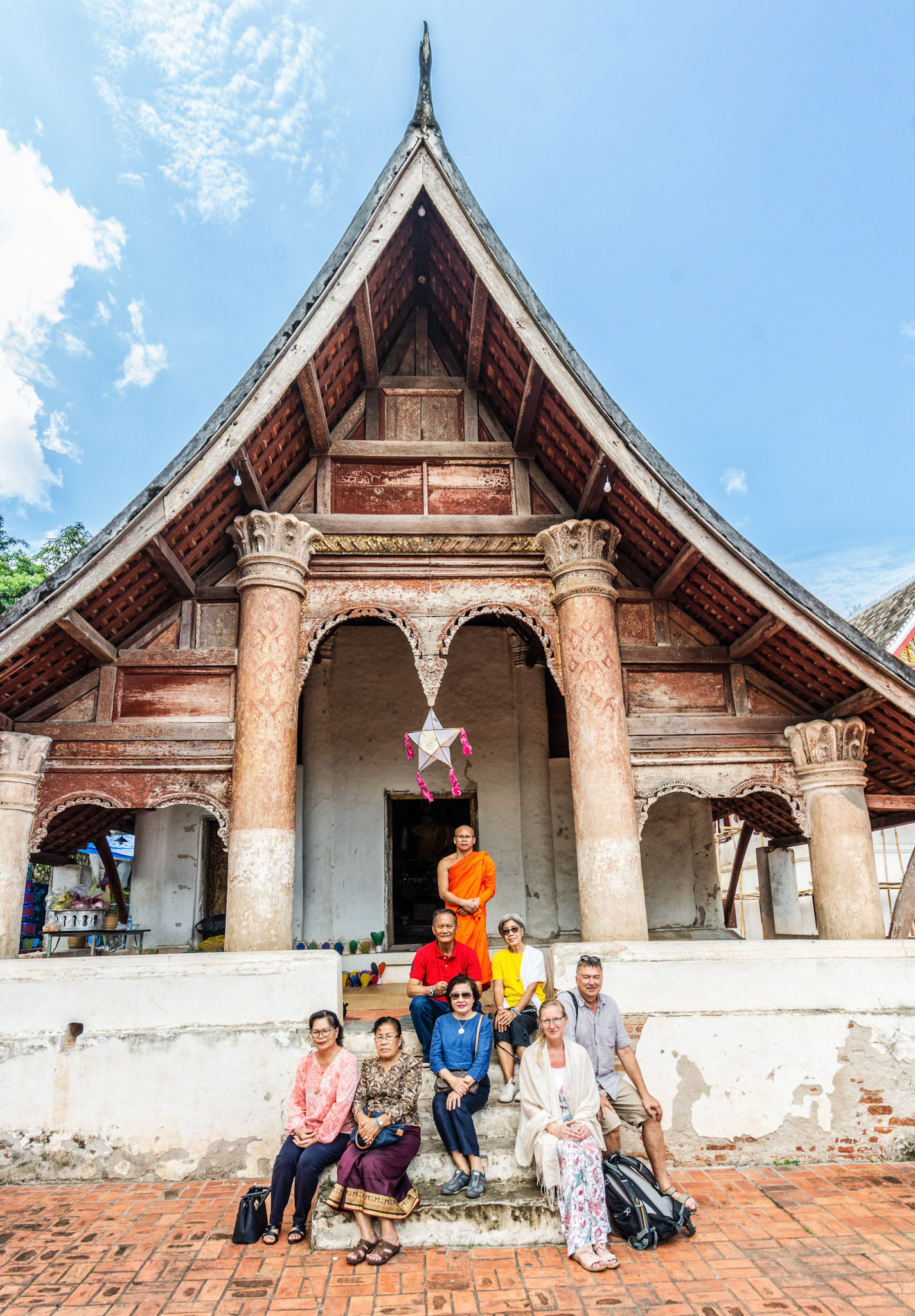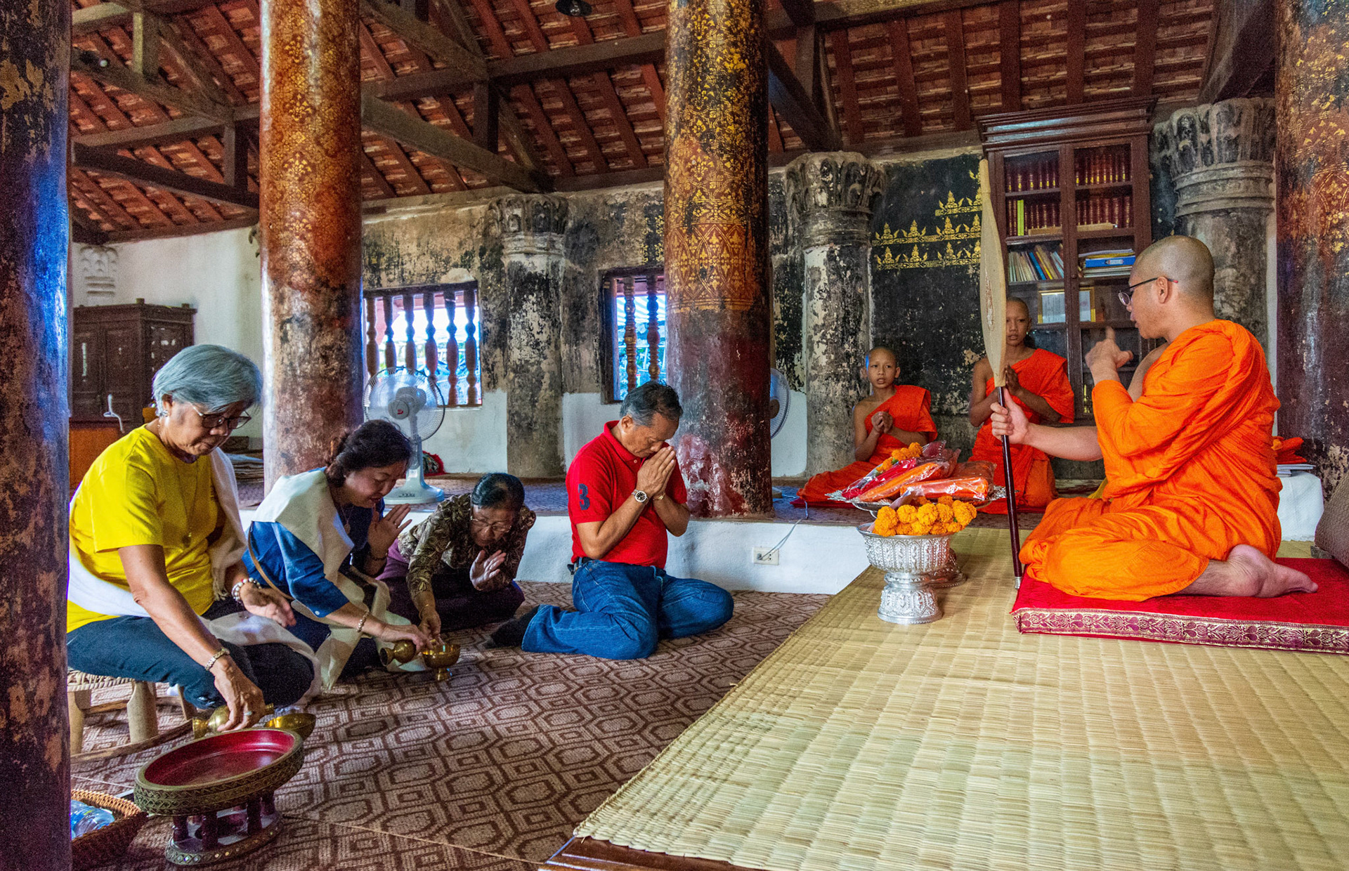 Boun Heua Fai (Fireboat Festival) day with the parade, weather permitting, due to take place that night. I went into Wat Siphoutthabath to see if anything was happening and was almost immediately greeted by a monk and invited into a prayer service- he’d seen my camera and wanted me to take shots during the service. Apart from the novices, there was what seemed like a prominent family group who during the service gave numerous offerings to the temple. Afterwards the monk walked the family group, a couple of other tourists and me in tow around the grounds.