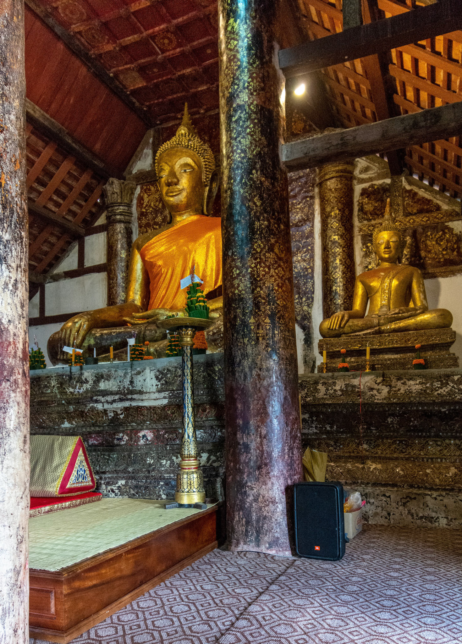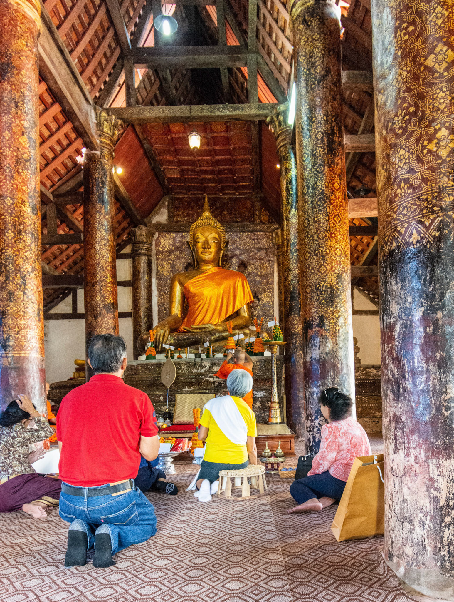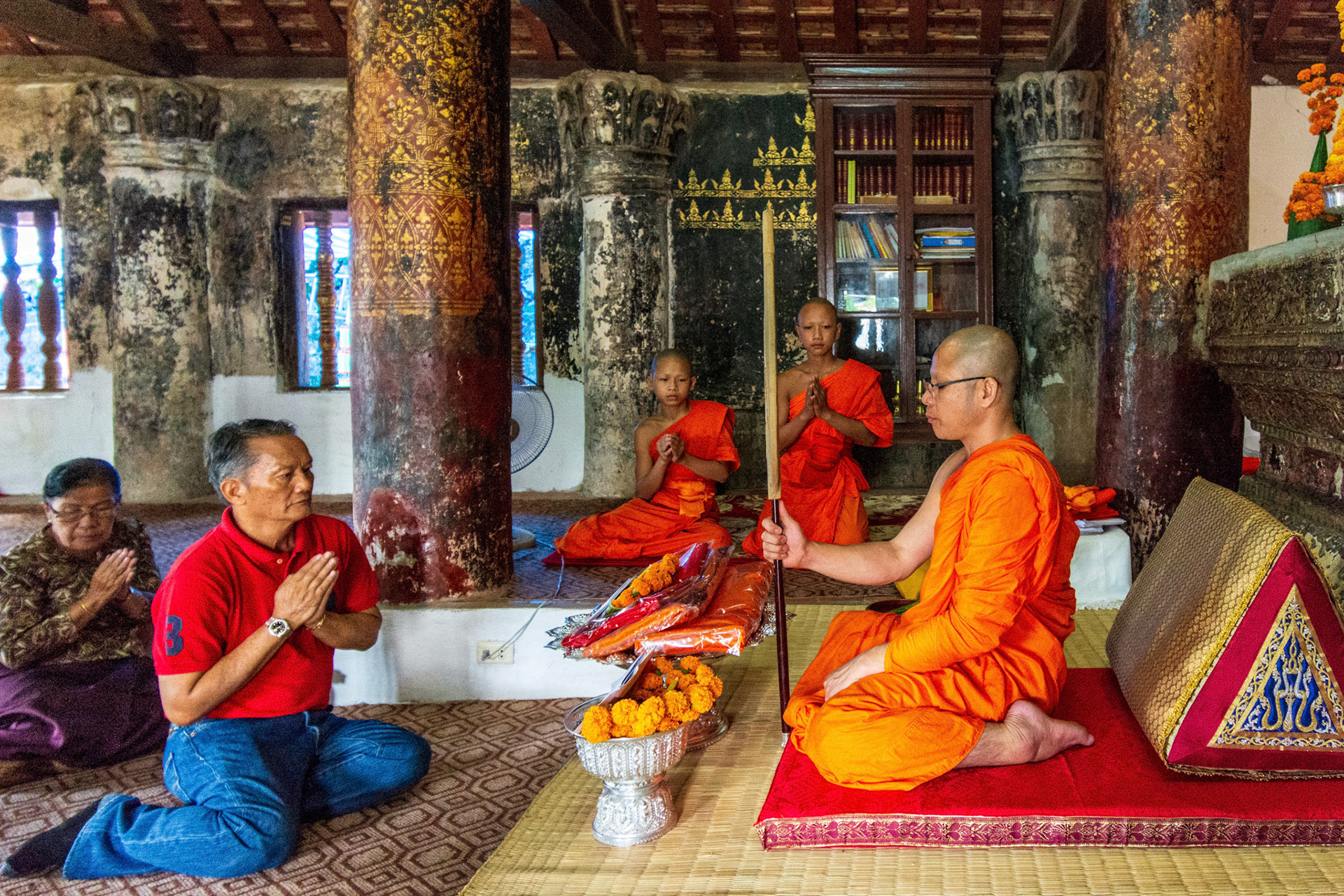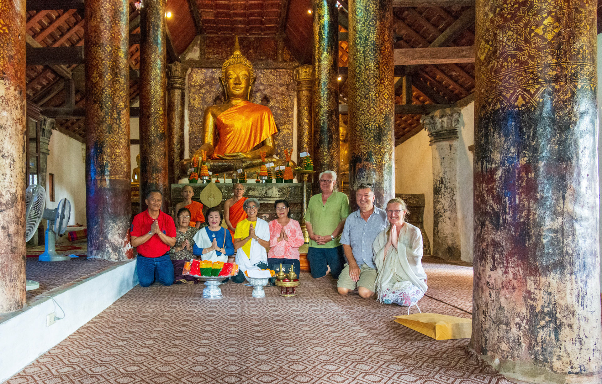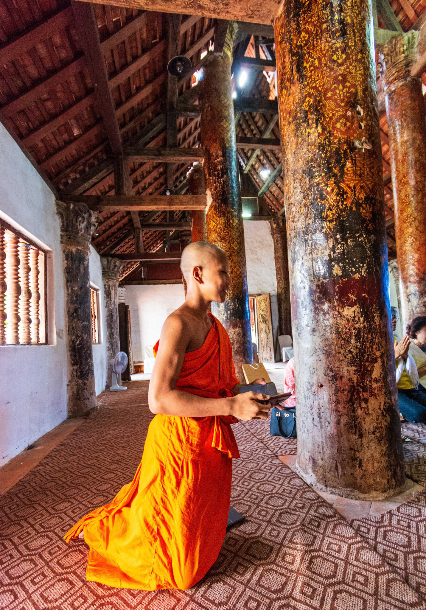 Boun Heua Fai (Fireboat Festival) day with the parade, weather permitting, due to take place that night. I went into Wat Siphoutthabath to see if anything was happening and was almost immediately greeted by a monk and invited into a prayer service- he’d seen my camera and wanted me to take shots during the service. Apart from the novices, there was what seemed like a prominent family group who during the service gave numerous offerings to the temple. Afterwards the monk walked the family group, a couple of other tourists and me in tow around the grounds.