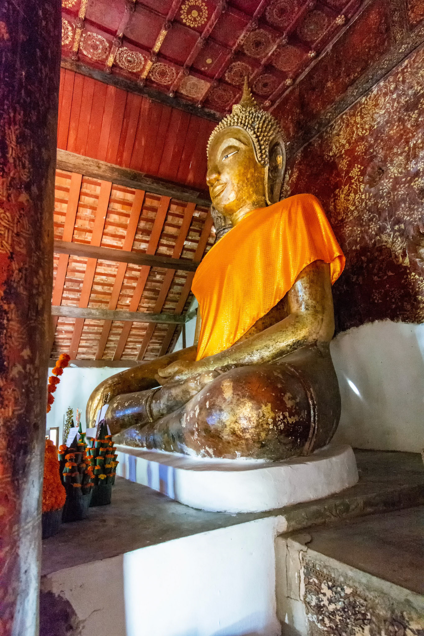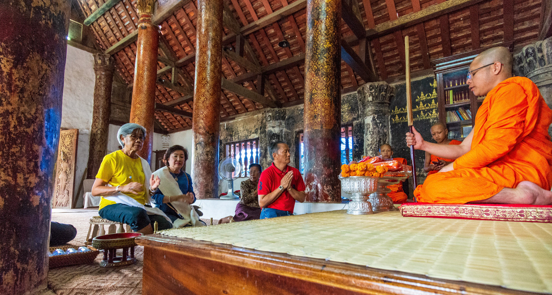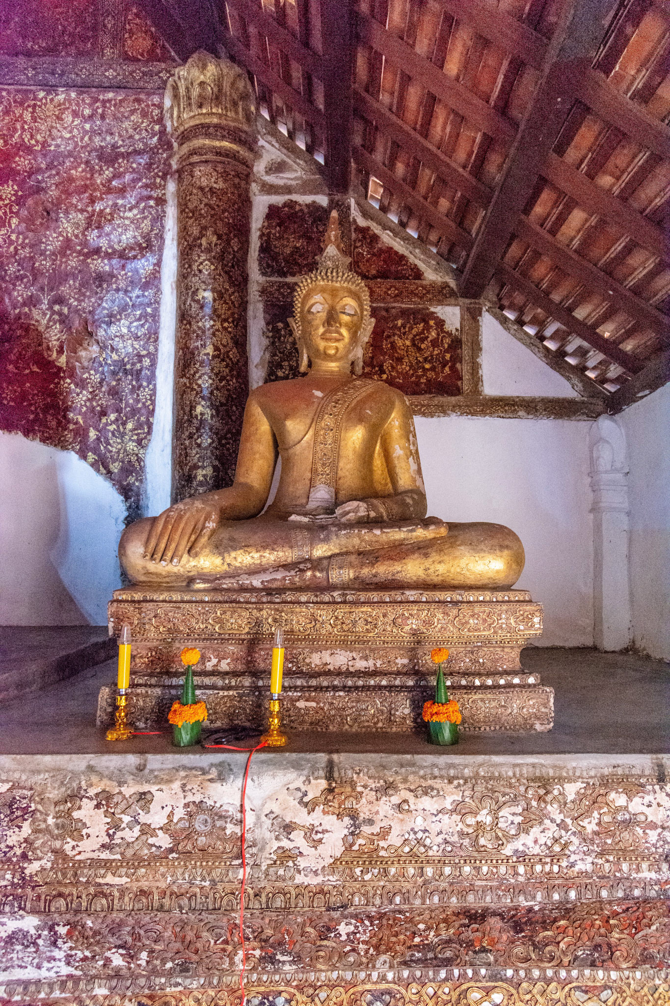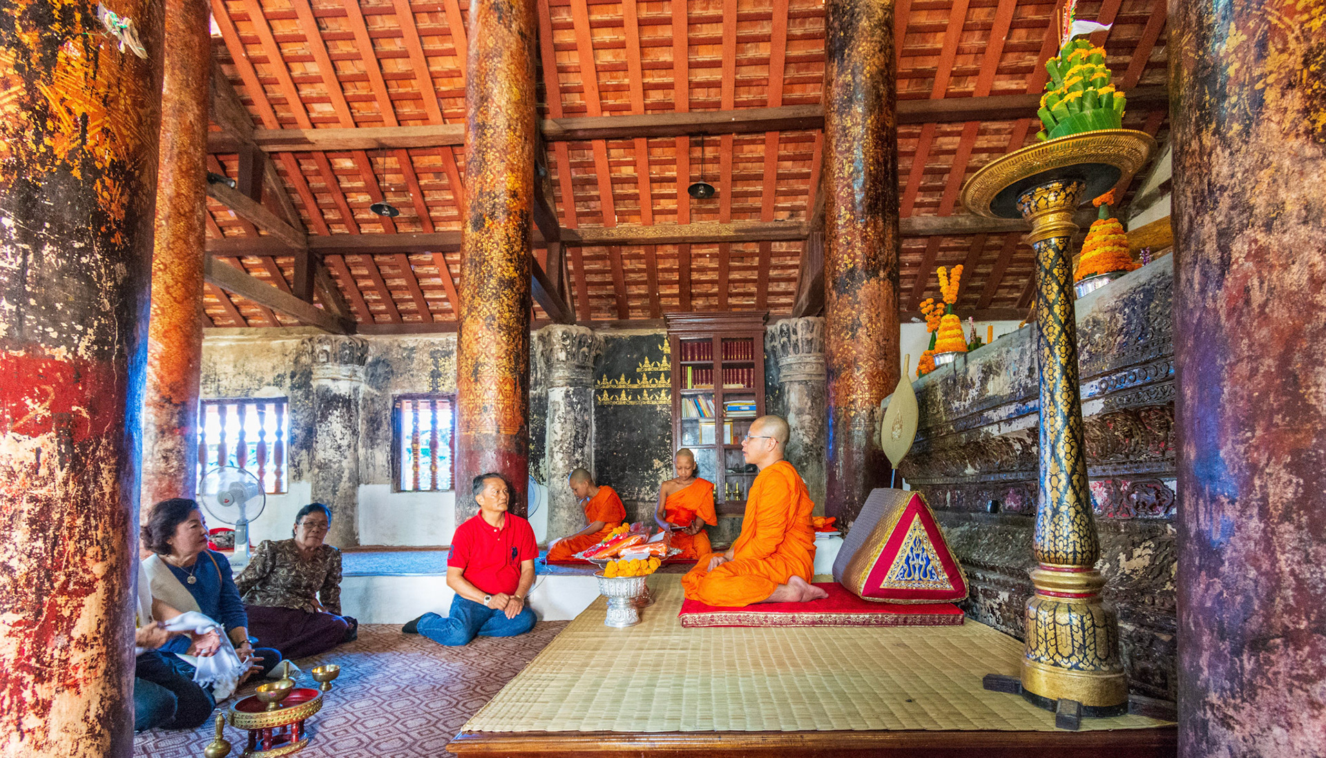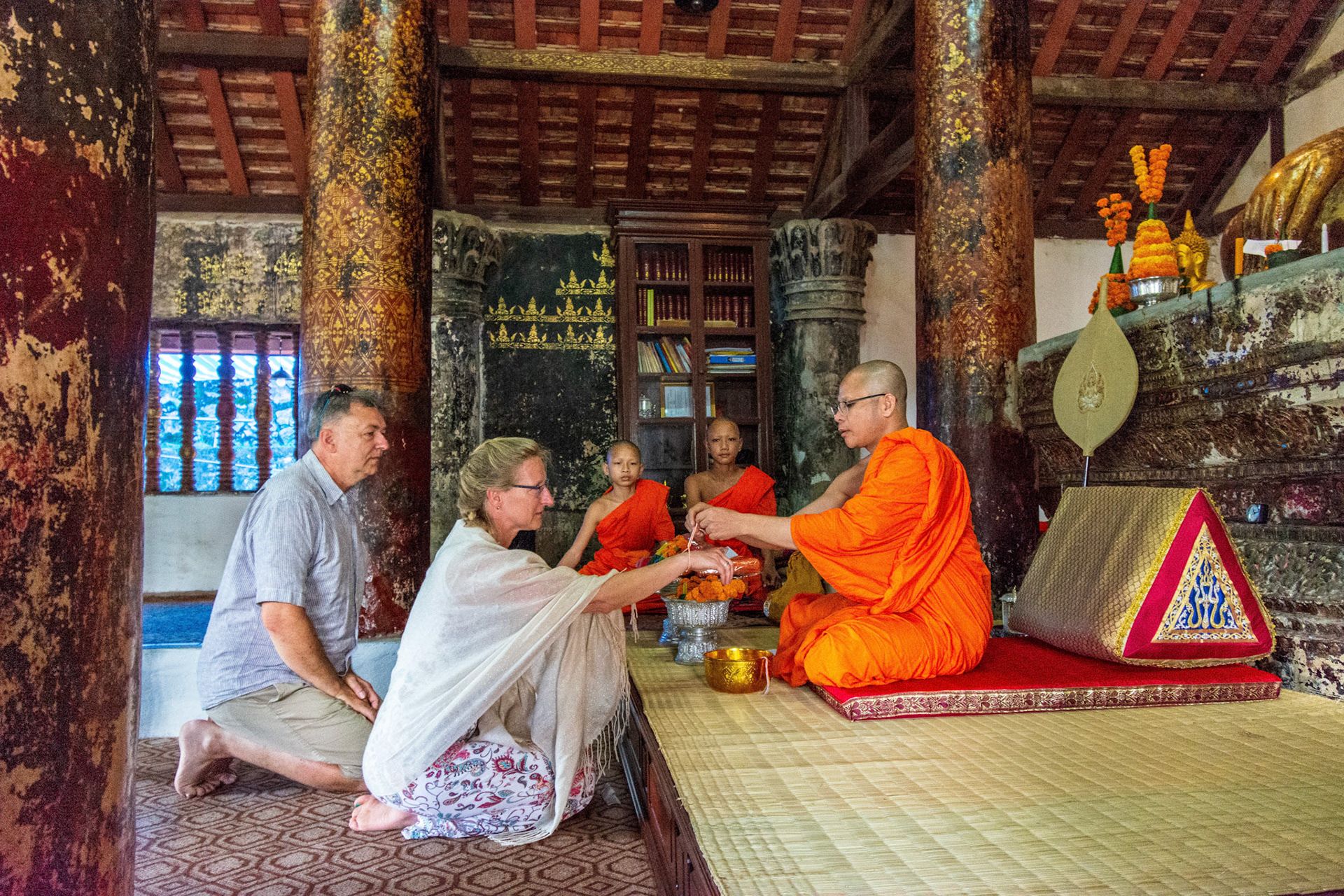 Boun Heua Fai (Fireboat Festival) day with the parade, weather permitting, due to take place that night. I went into Wat Siphoutthabath to see if anything was happening and was almost immediately greeted by a monk and invited into a prayer service- he’d seen my camera and wanted me to take shots during the service. Apart from the novices, there was what seemed like a prominent family group who during the service gave numerous offerings to the temple. Afterwards the monk walked the family group, a couple of other tourists and me in tow around the grounds.