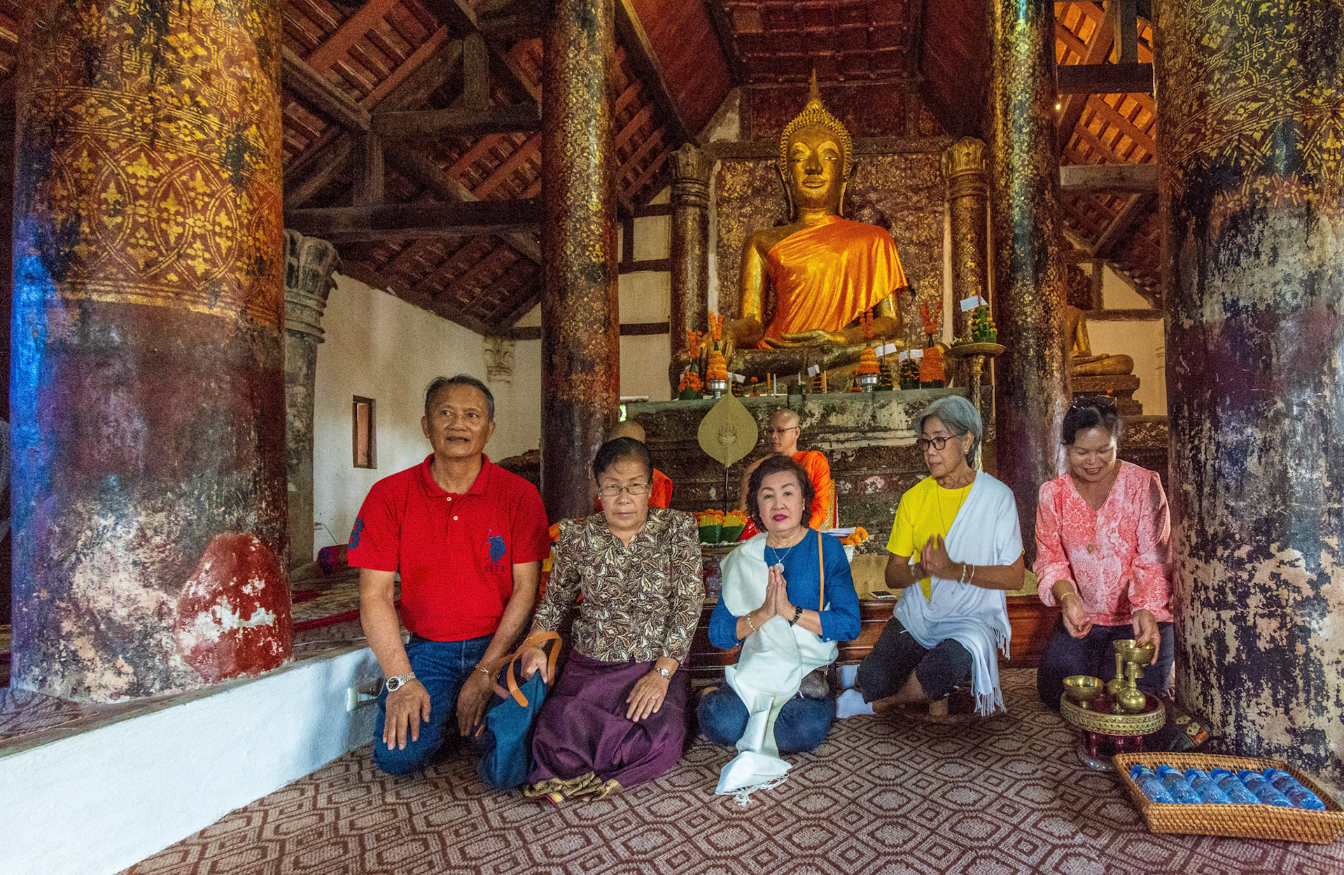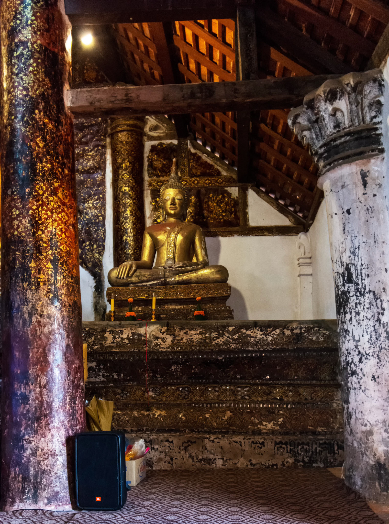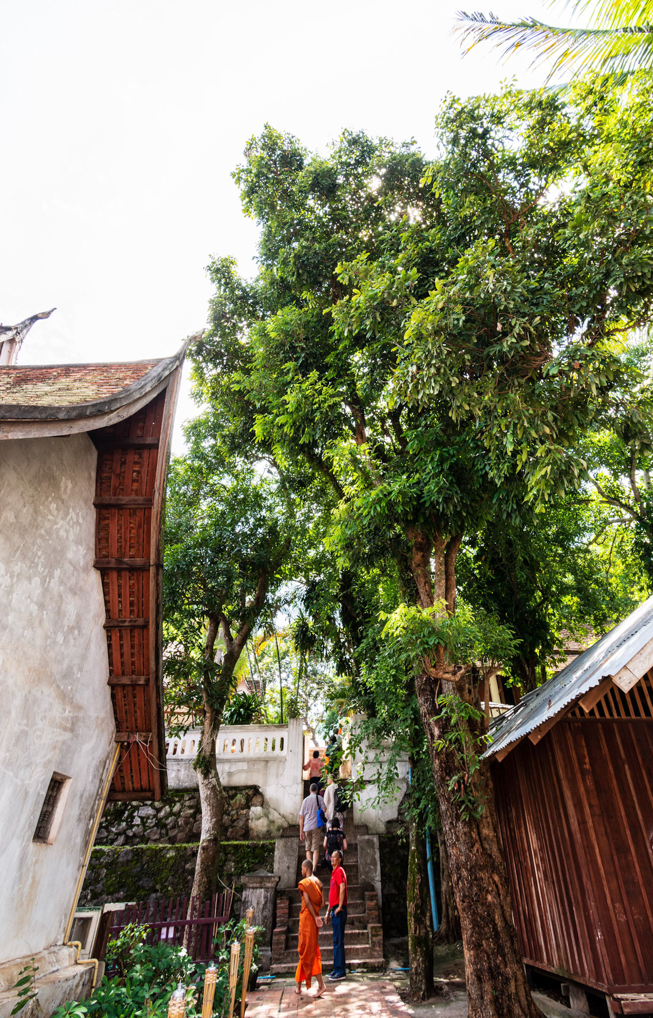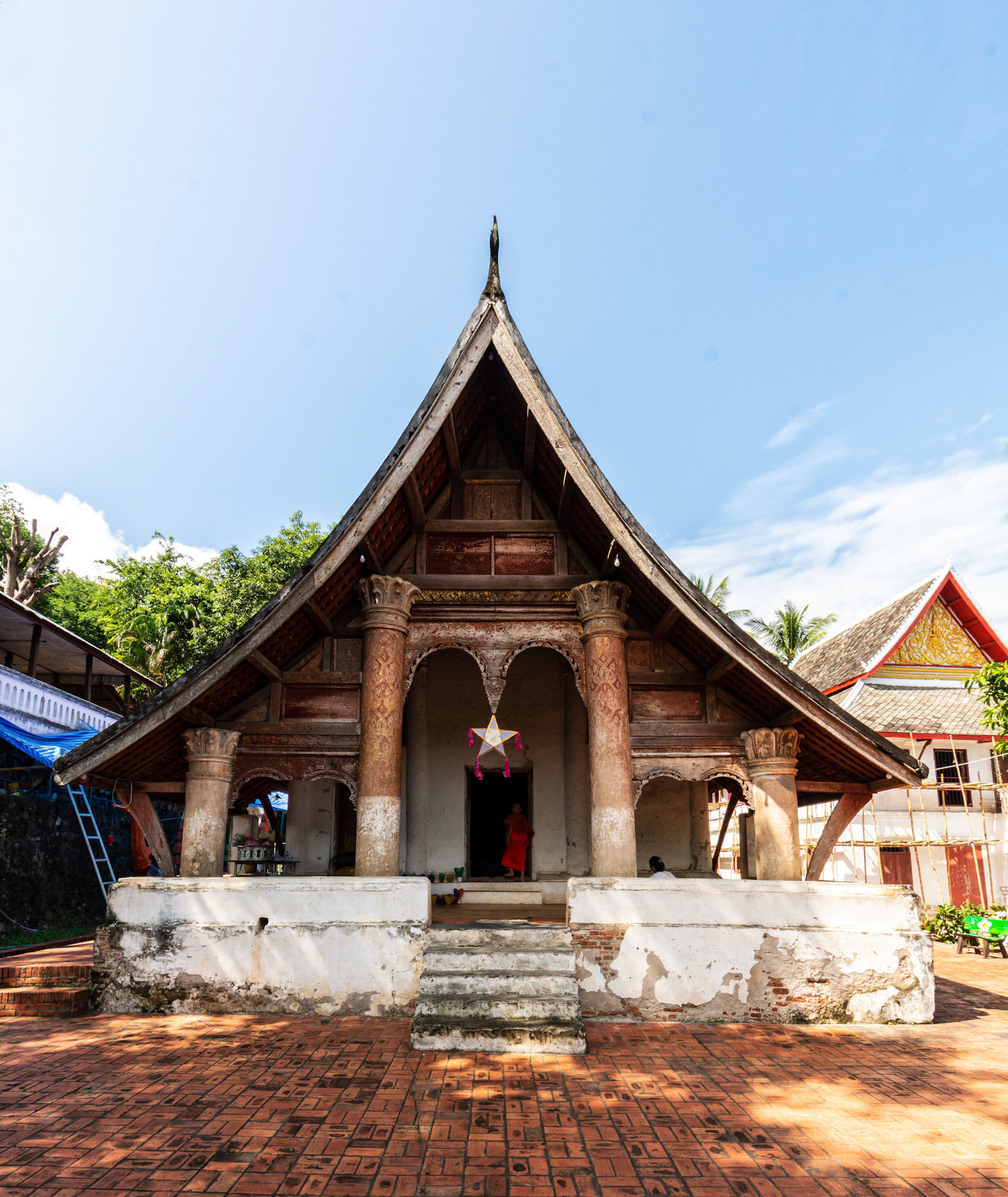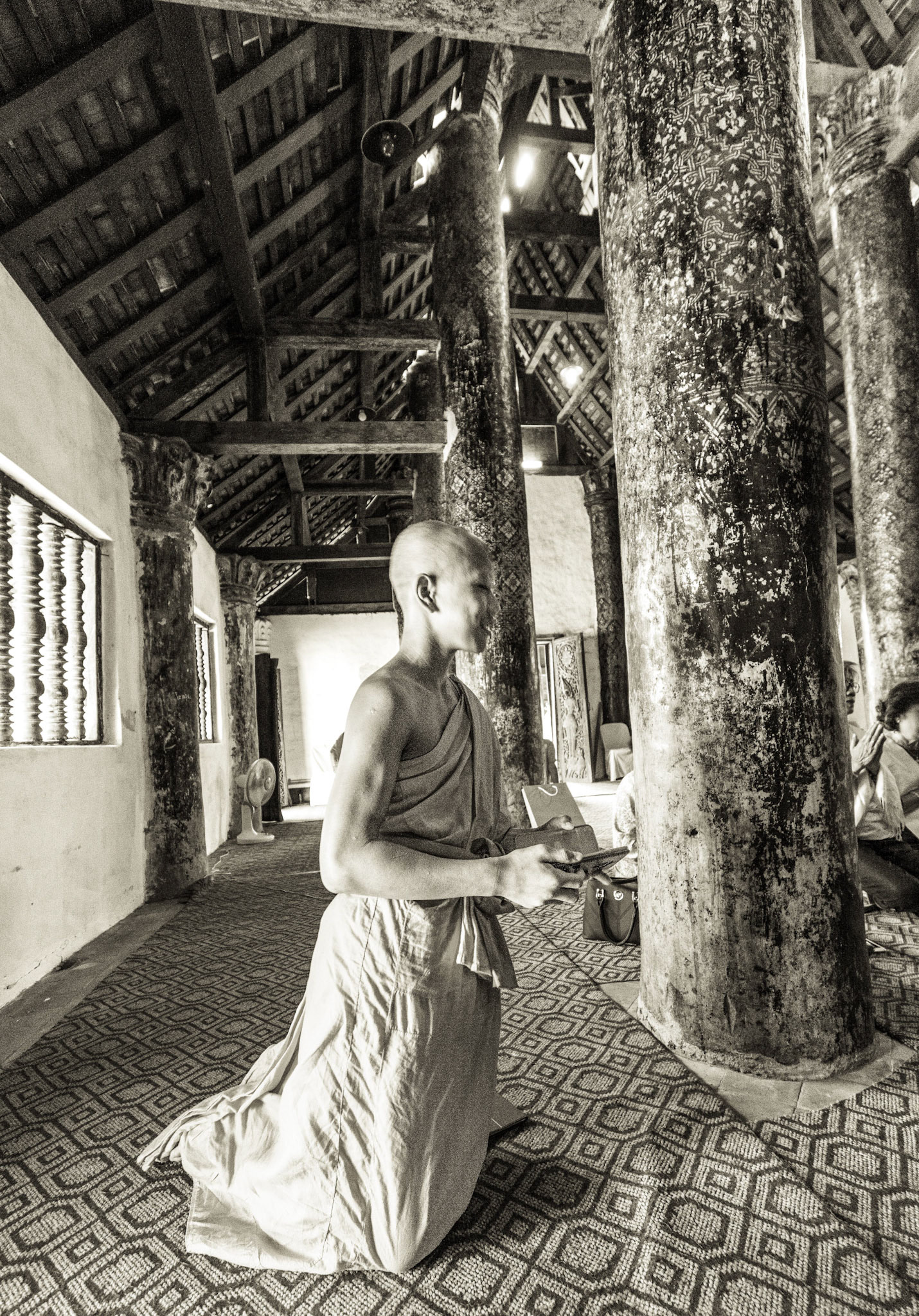Boun Heua Fai (Fireboat Festival) day with the parade, weather permitting, due to take place that night. I went into Wat Siphoutthabath to see if anything was happening and was almost immediately greeted by a monk and invited into a prayer service- he’d seen my camera and wanted me to take shots during the service. Apart from the novices, there was what seemed like a prominent family group who during the service gave numerous offerings to the temple. Afterwards the monk walked the family group, a couple of other tourists and me in tow around the grounds.