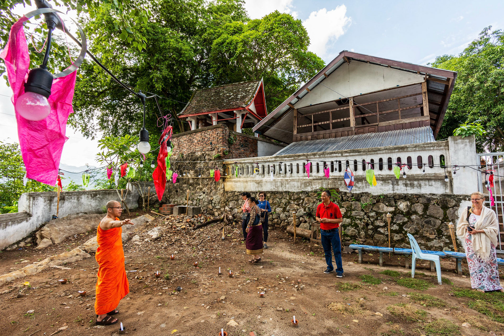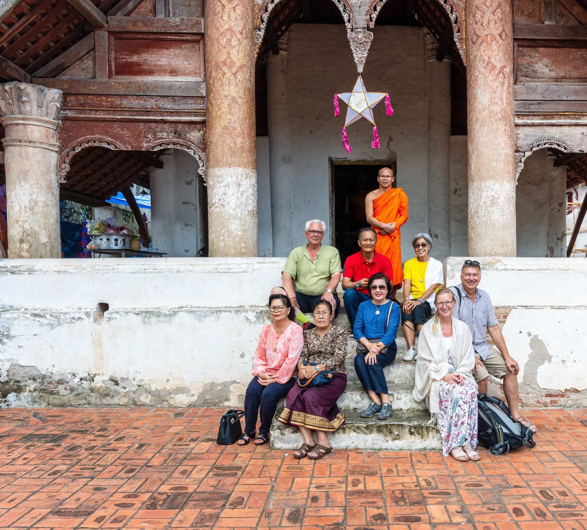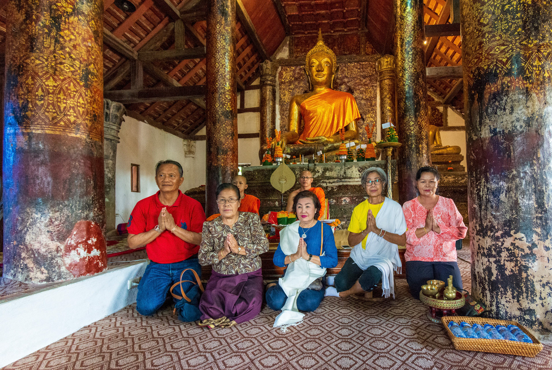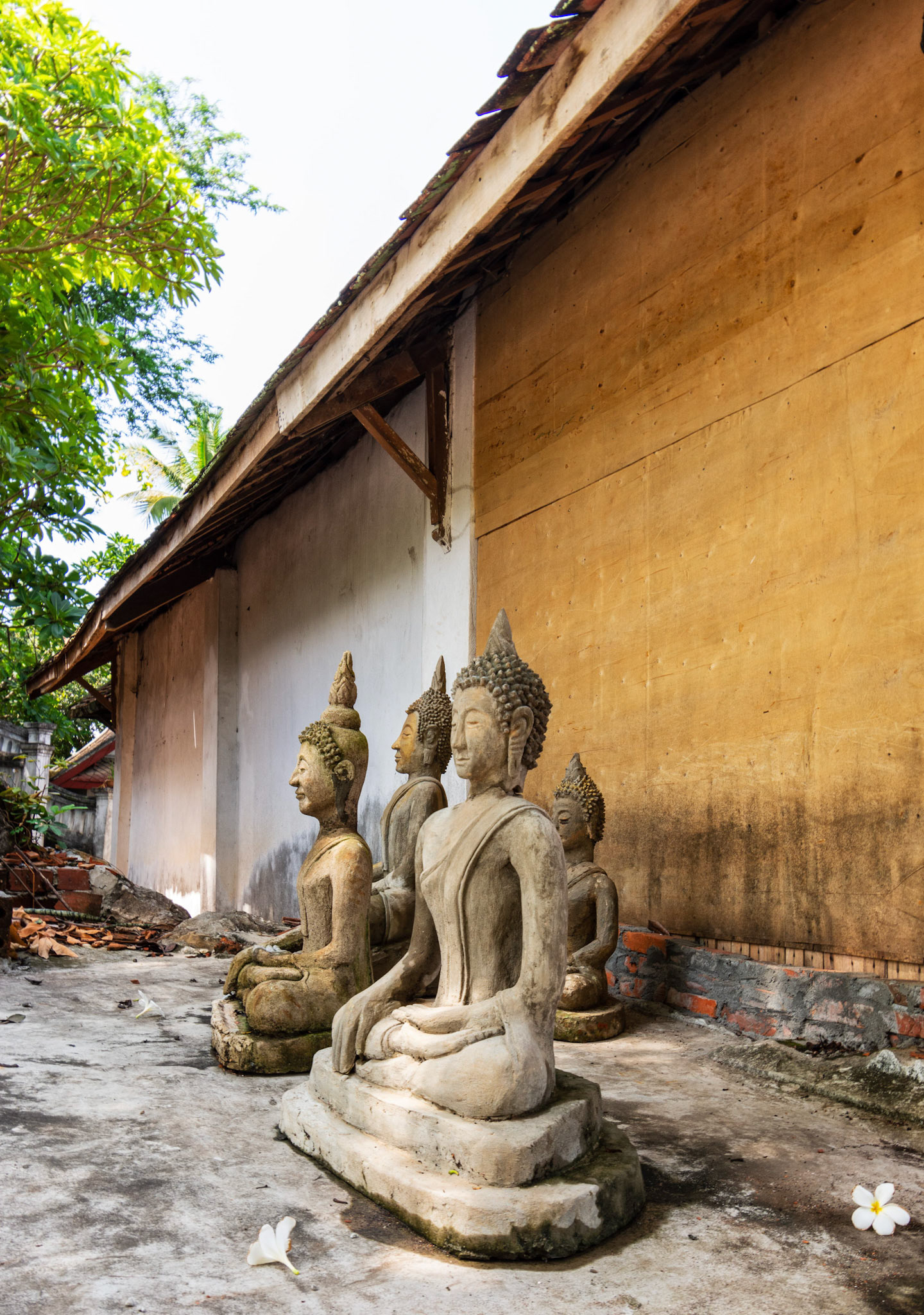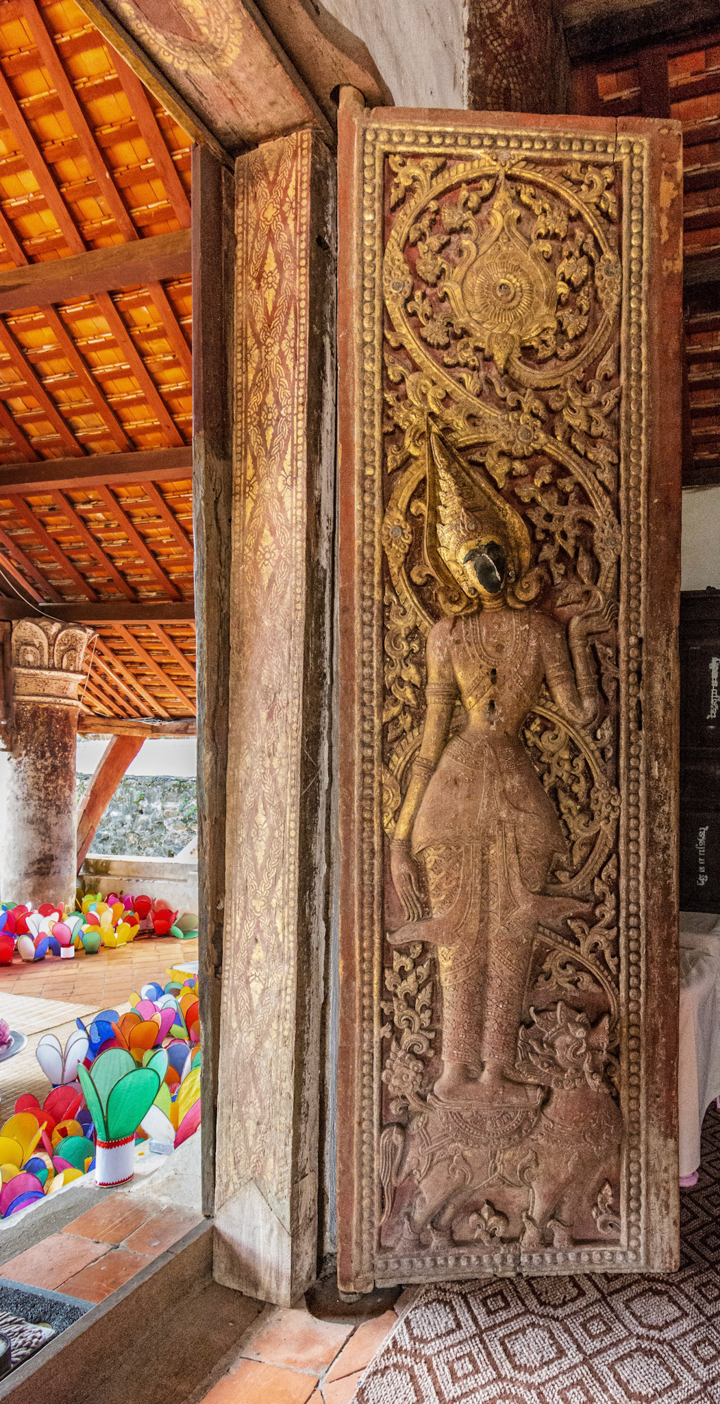 Boun Heua Fai (Fireboat Festival) day with the parade, weather permitting, due to take place that night. I went into Wat Siphoutthabath to see if anything was happening and was almost immediately greeted by a monk and invited into a prayer service- he’d seen my camera and wanted me to take shots during the service. Apart from the novices, there was what seemed like a prominent family group who during the service gave numerous offerings to the temple. Afterwards the monk walked the family group, a couple of other tourists and me in tow around the grounds.