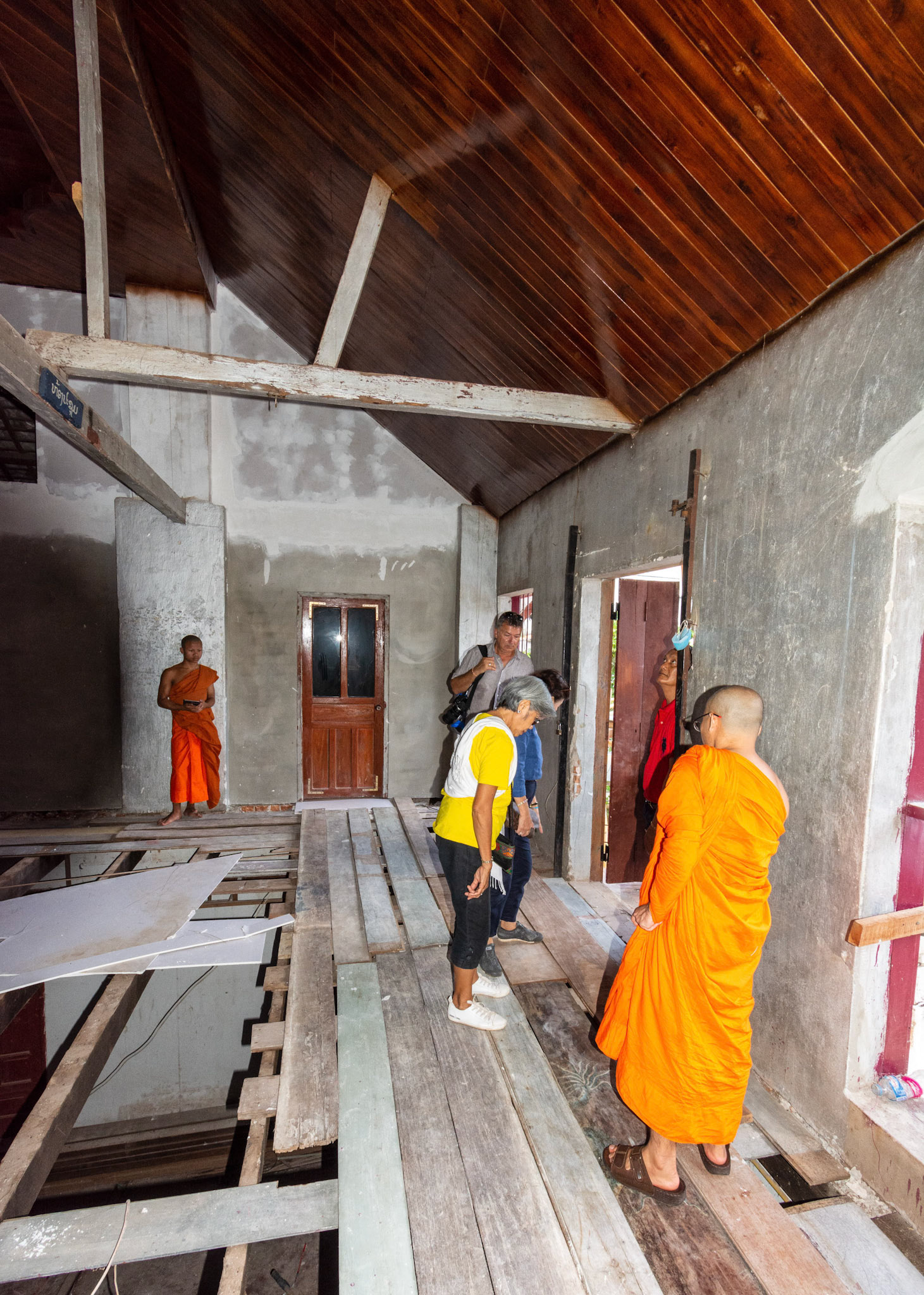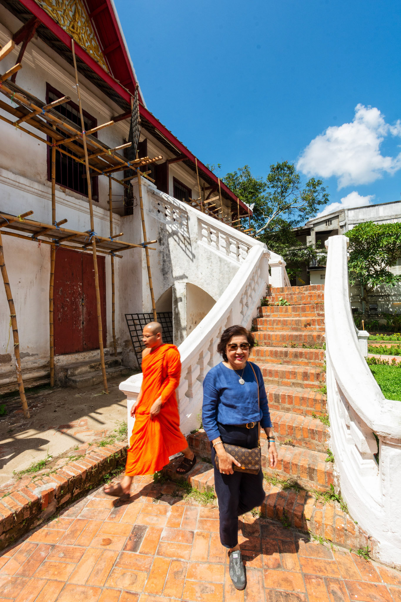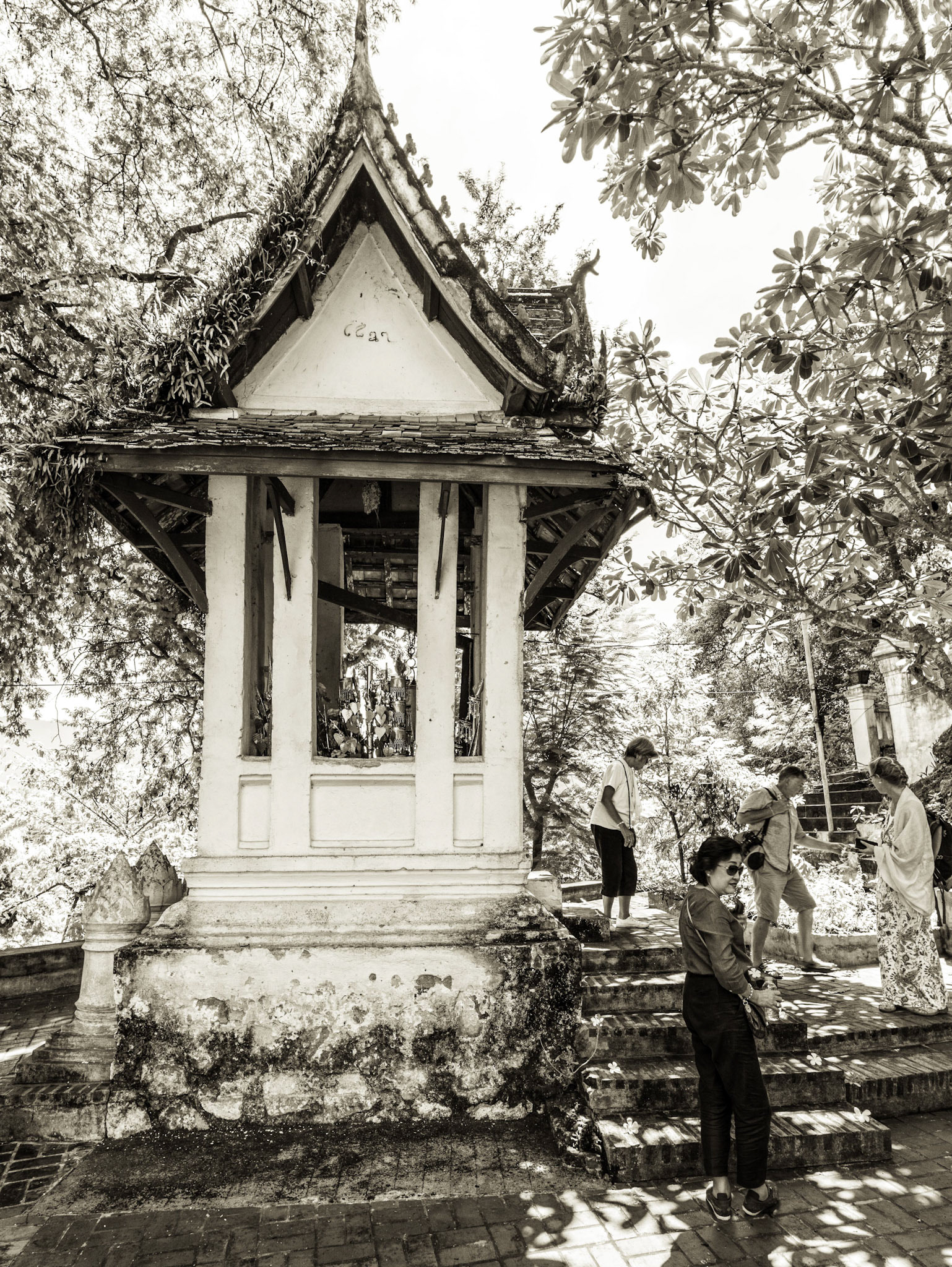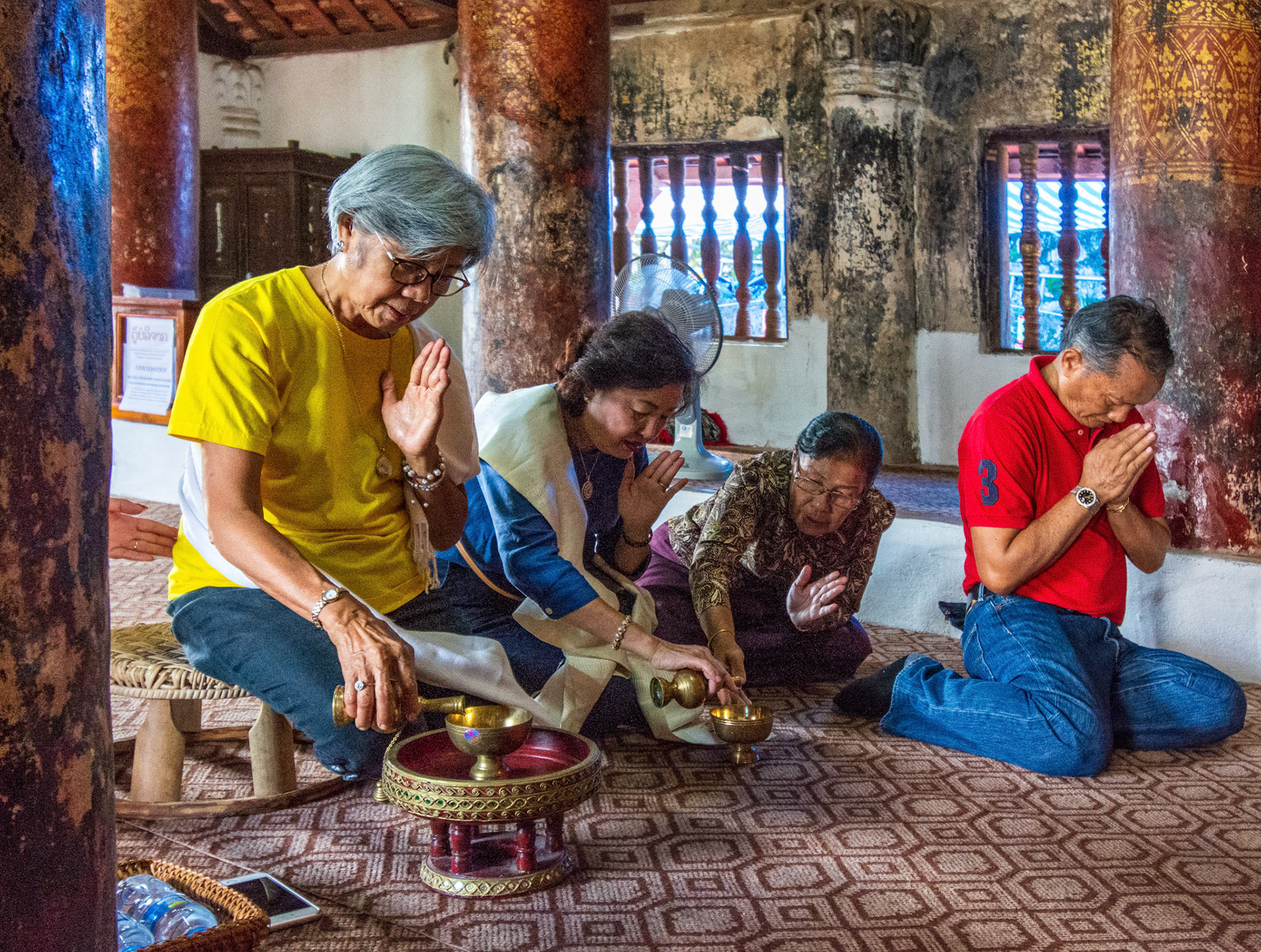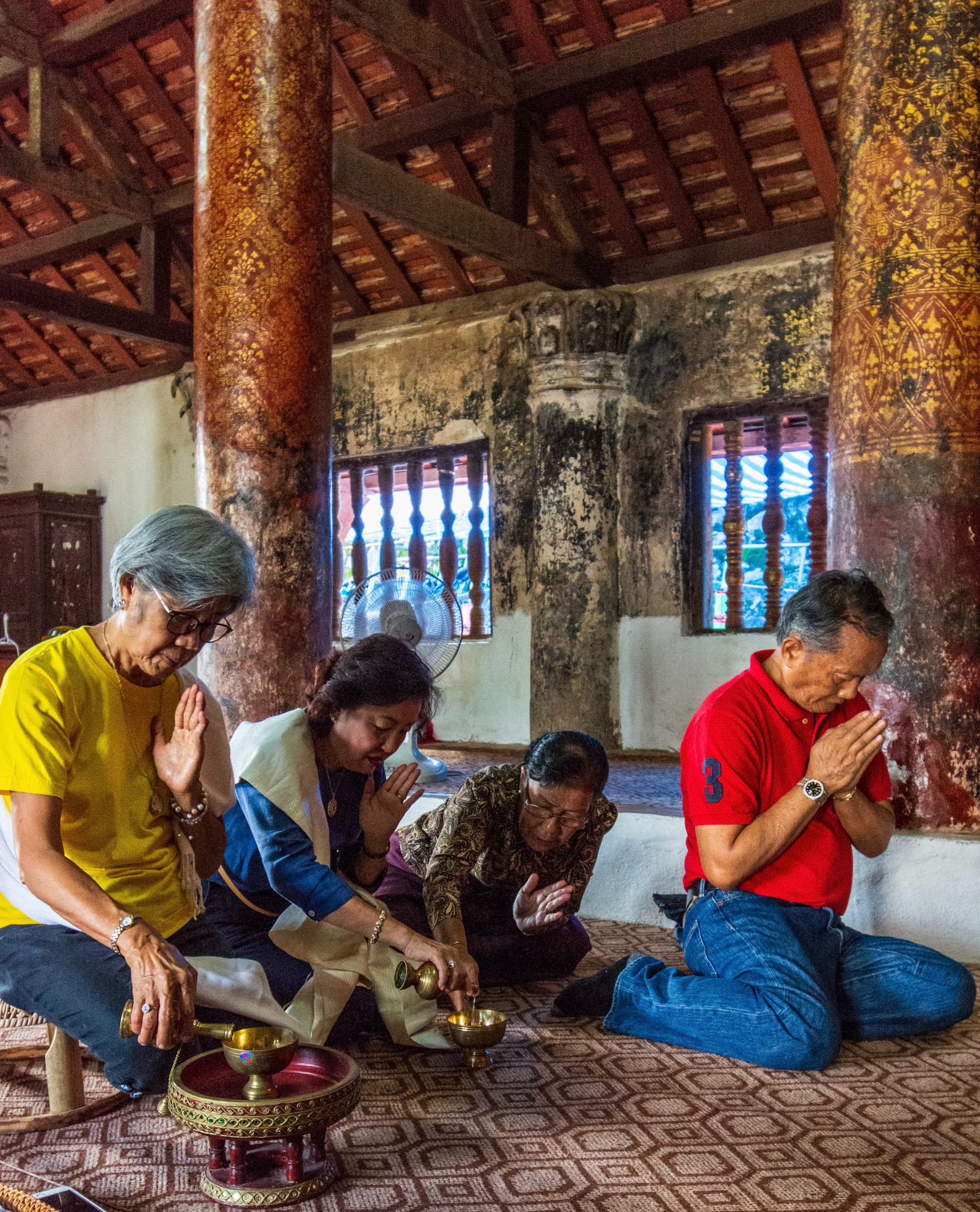Boun Heua Fai (Fireboat Festival) day with the parade, weather permitting, due to take place that night. I went into Wat Siphoutthabath to see if anything was happening and was almost immediately greeted by a monk and invited into a prayer service- he’d seen my camera and wanted me to take shots during the service. Apart from the novices, there was what seemed like a prominent family group who during the service gave numerous offerings to the temple. Afterwards the monk walked the family group, a couple of other tourists and me in tow around the grounds.
