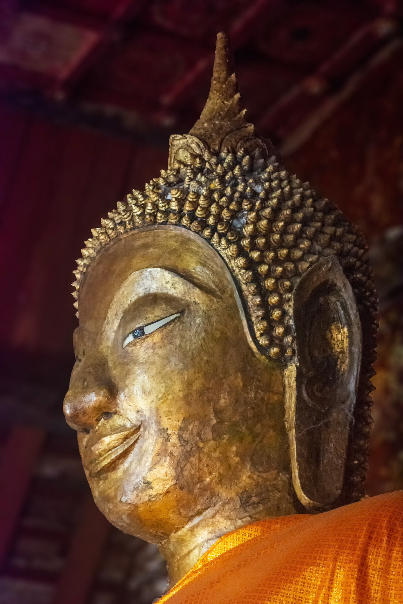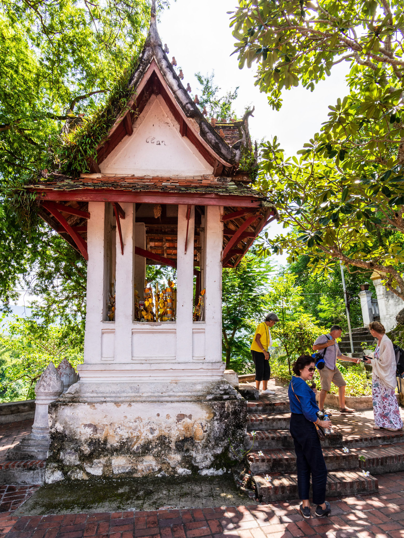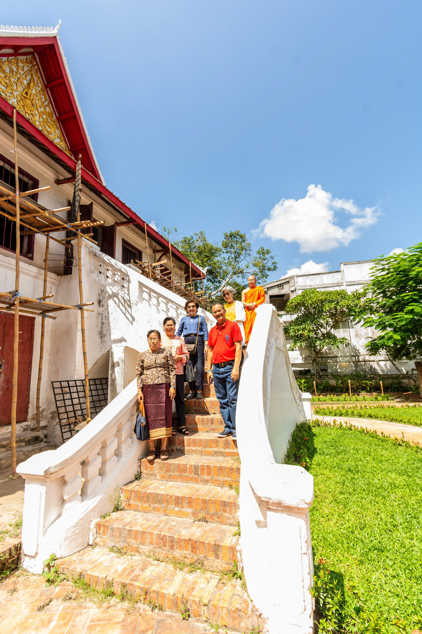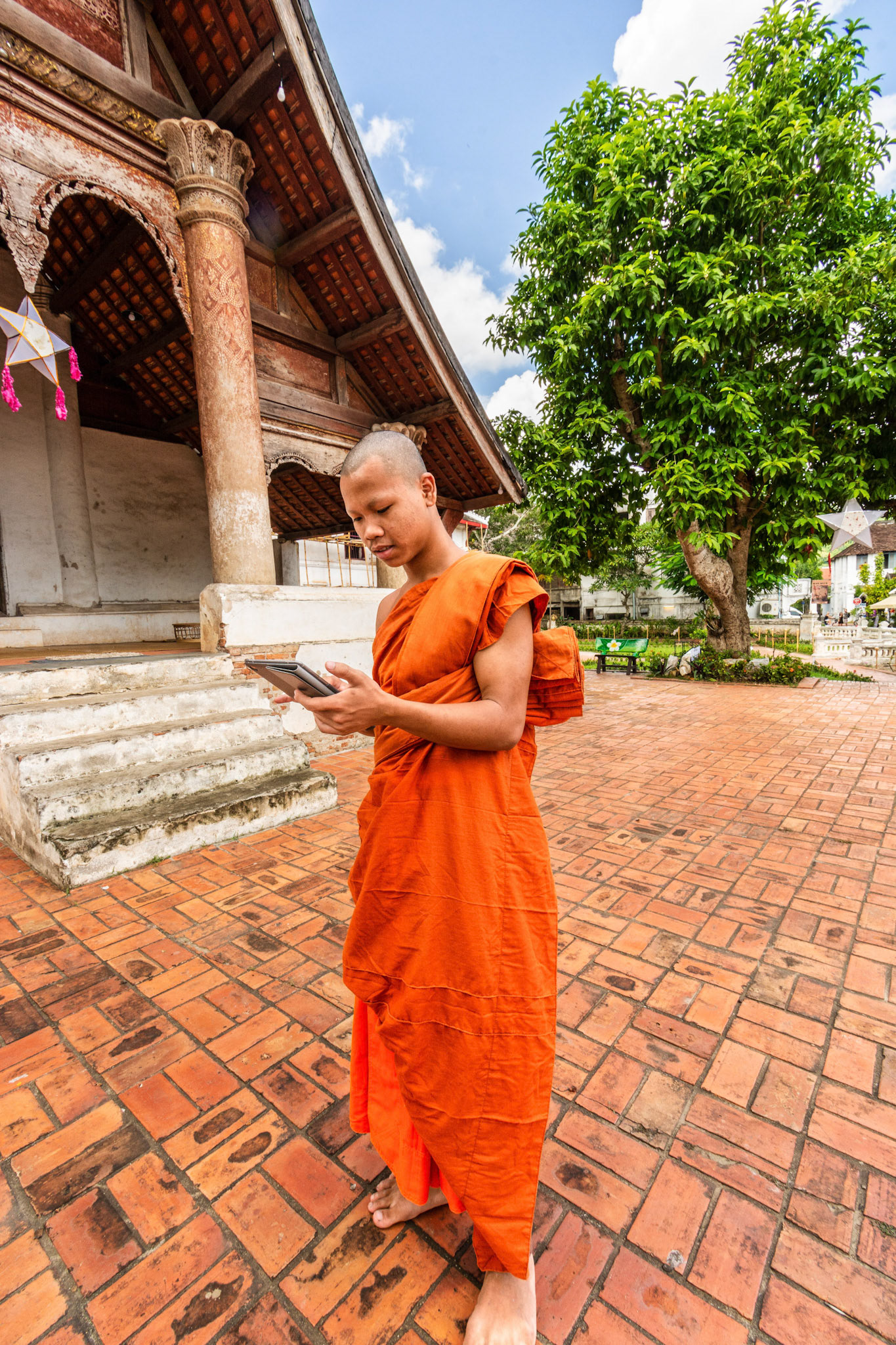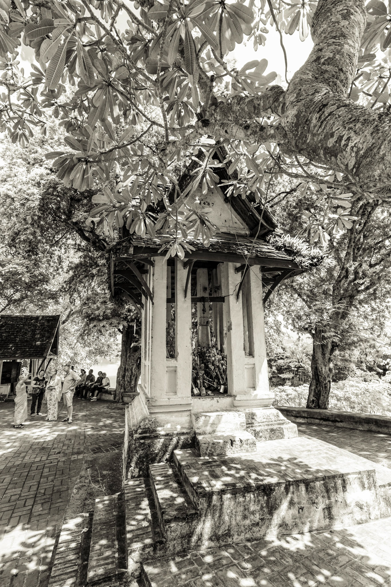 Boun Heua Fai (Fireboat Festival) day with the parade, weather permitting, due to take place that night. I went into Wat Siphoutthabath to see if anything was happening and was almost immediately greeted by a monk and invited into a prayer service- he’d seen my camera and wanted me to take shots during the service. Apart from the novices, there was what seemed like a prominent family group who during the service gave numerous offerings to the temple. Afterwards the monk walked the family group, a couple of other tourists and me in tow around the grounds.