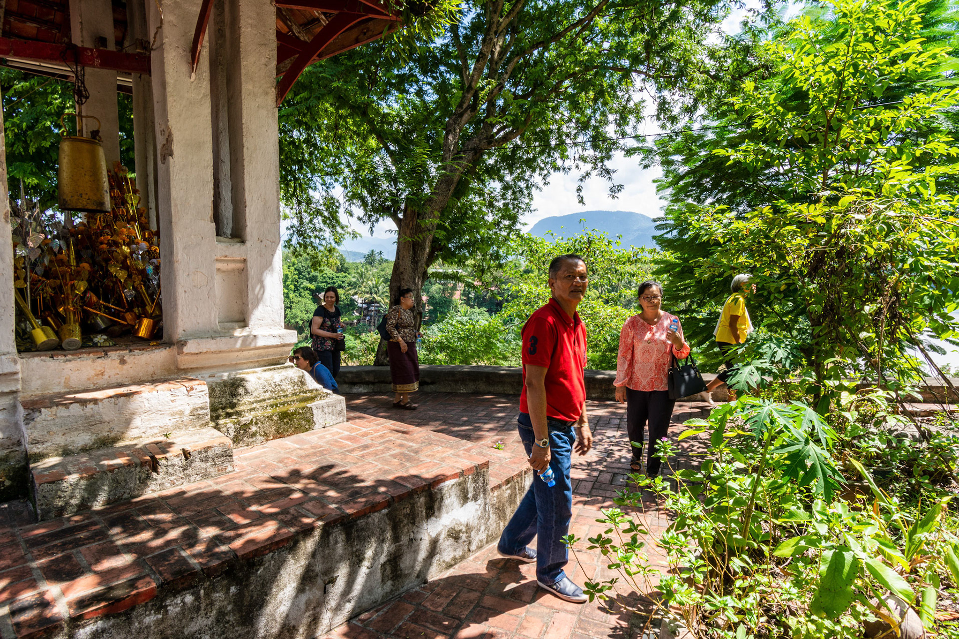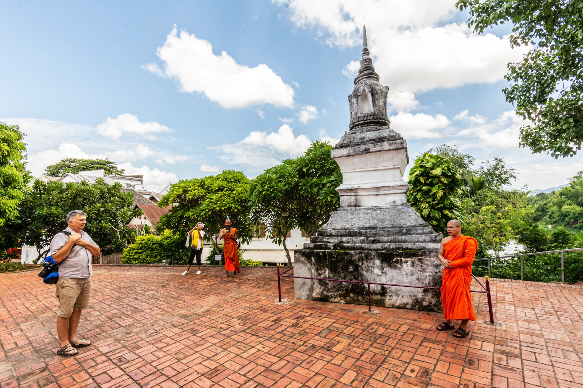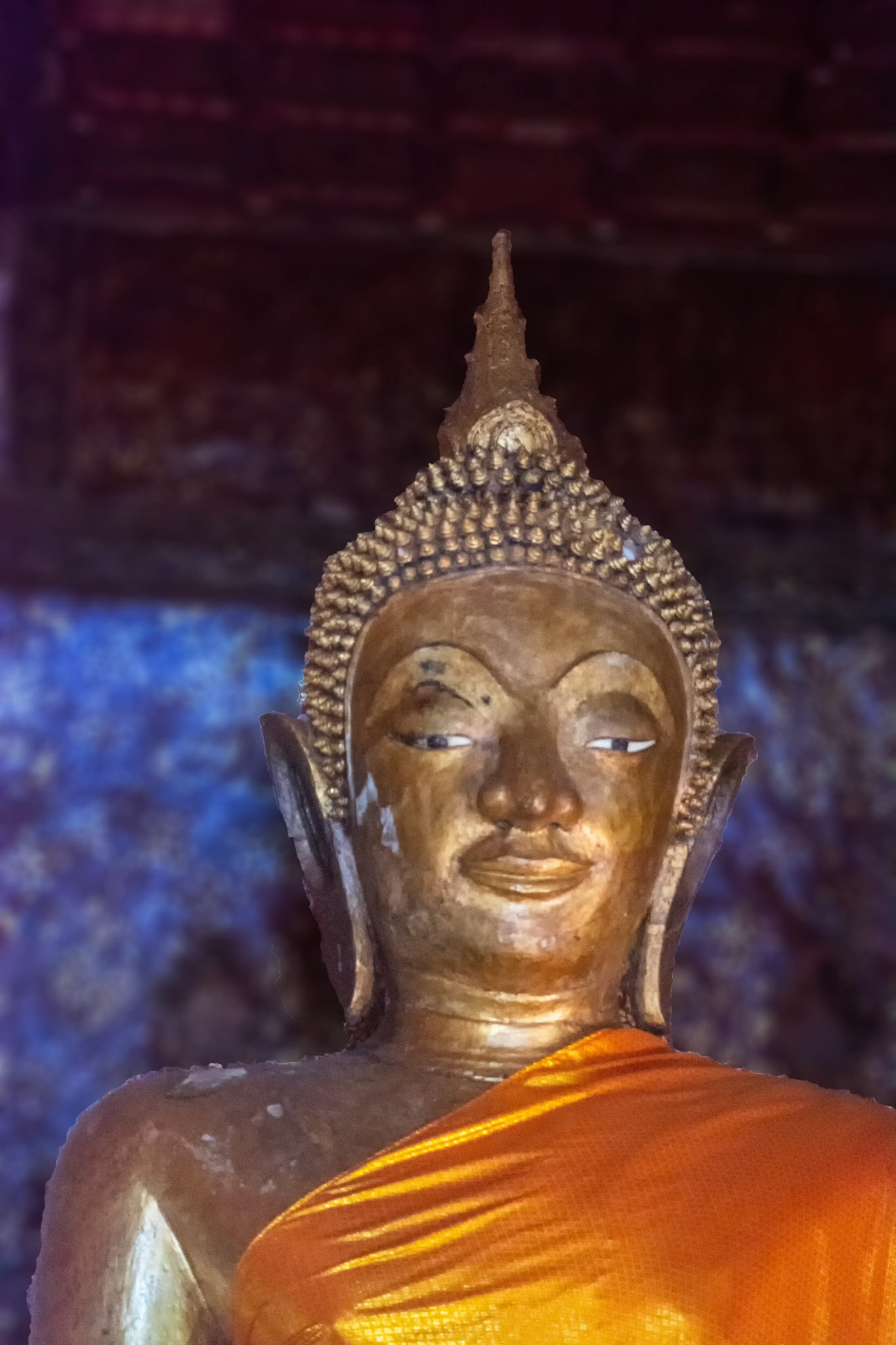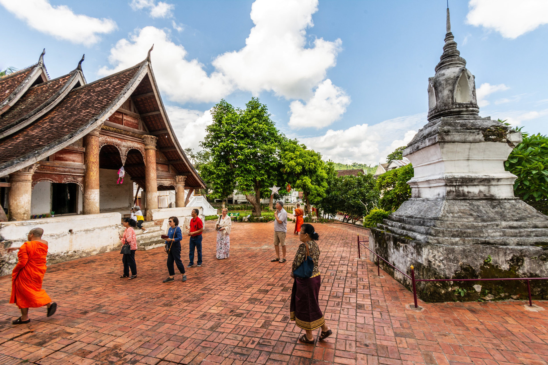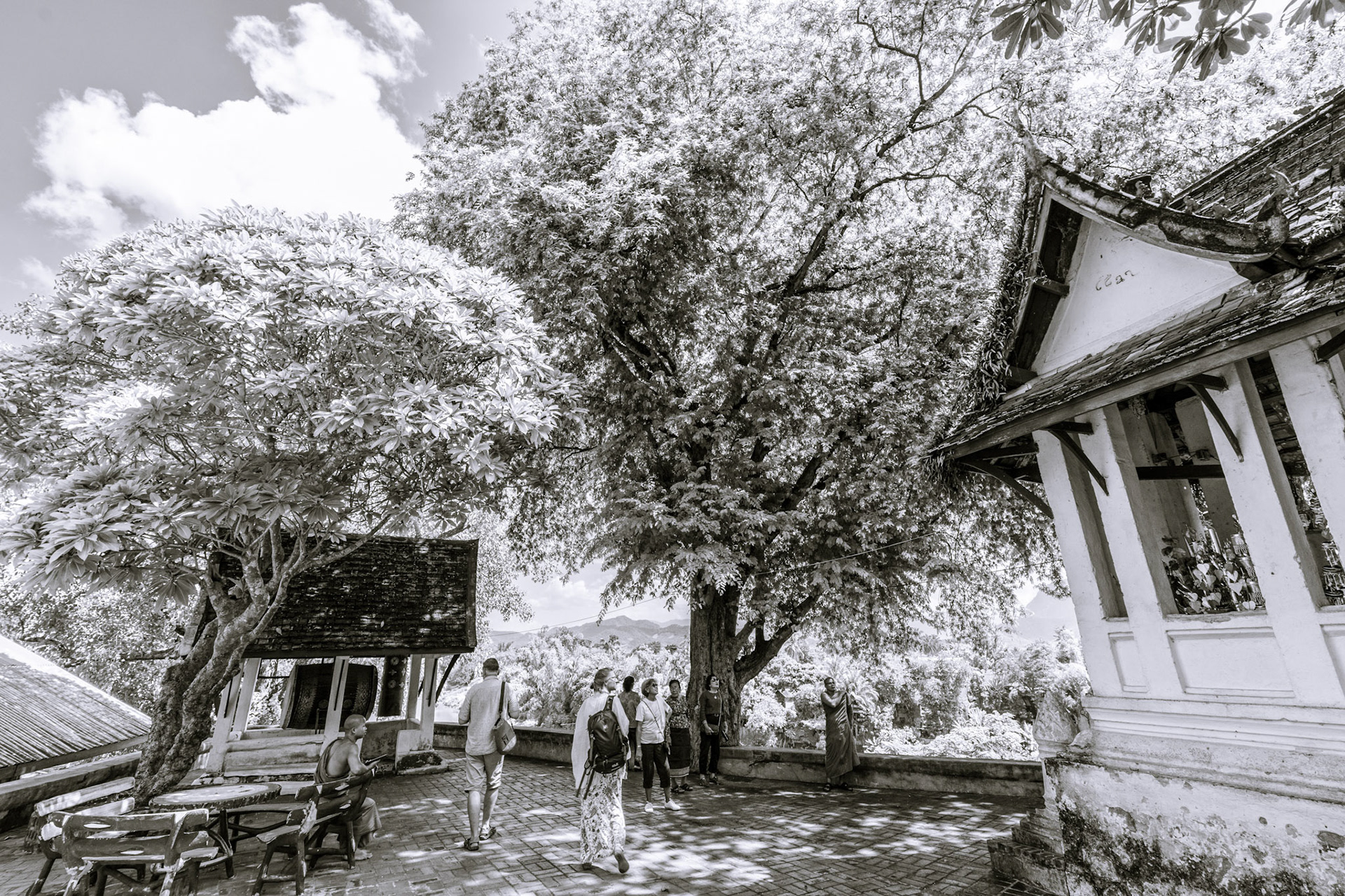 Boun Heua Fai (Fireboat Festival) day with the parade, weather permitting, due to take place that night. I went into Wat Siphoutthabath to see if anything was happening and was almost immediately greeted by a monk and invited into a prayer service- he’d seen my camera and wanted me to take shots during the service. Apart from the novices, there was what seemed like a prominent family group who during the service gave numerous offerings to the temple. Afterwards the monk walked the family group, a couple of other tourists and me in tow around the grounds.