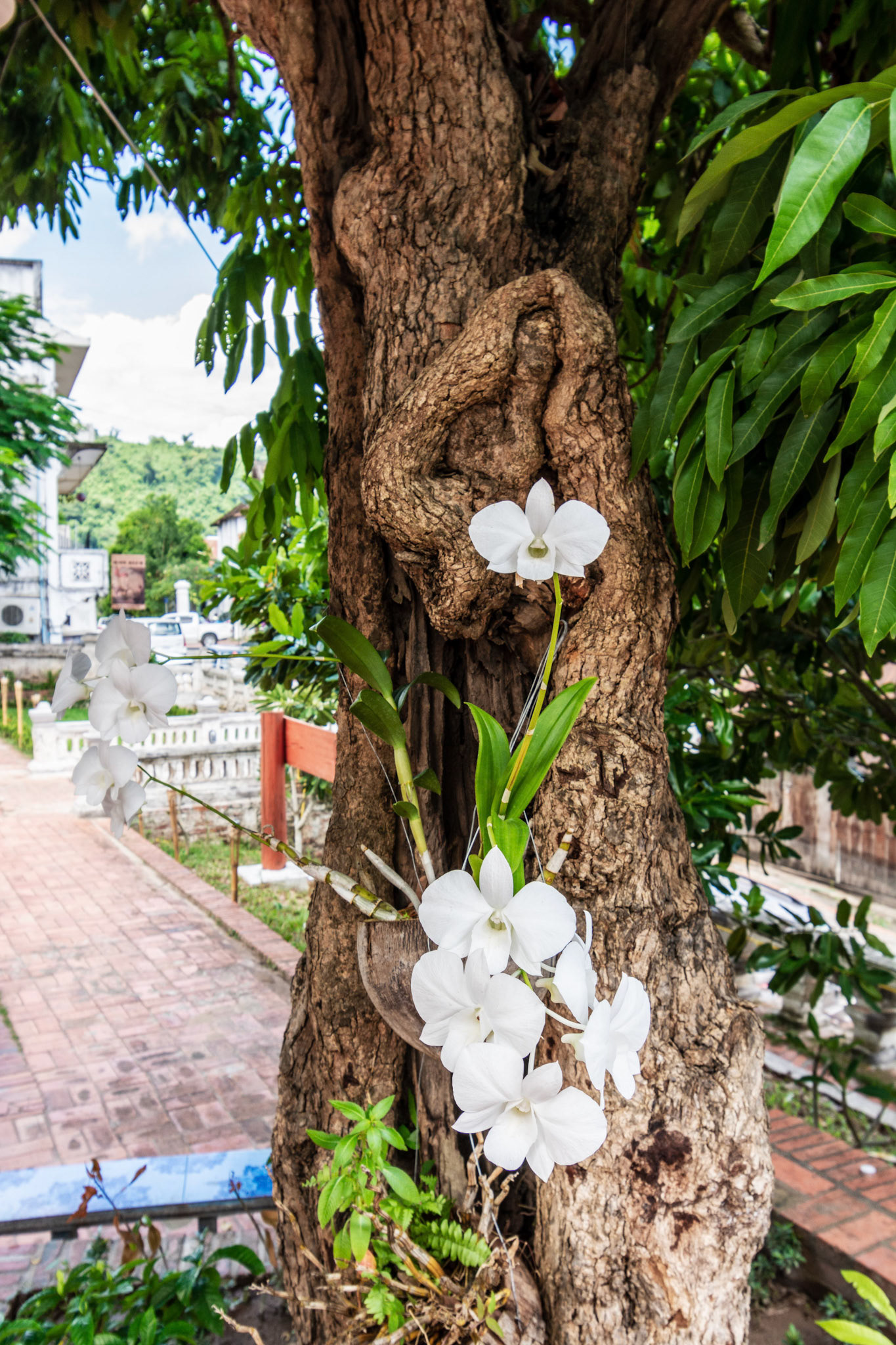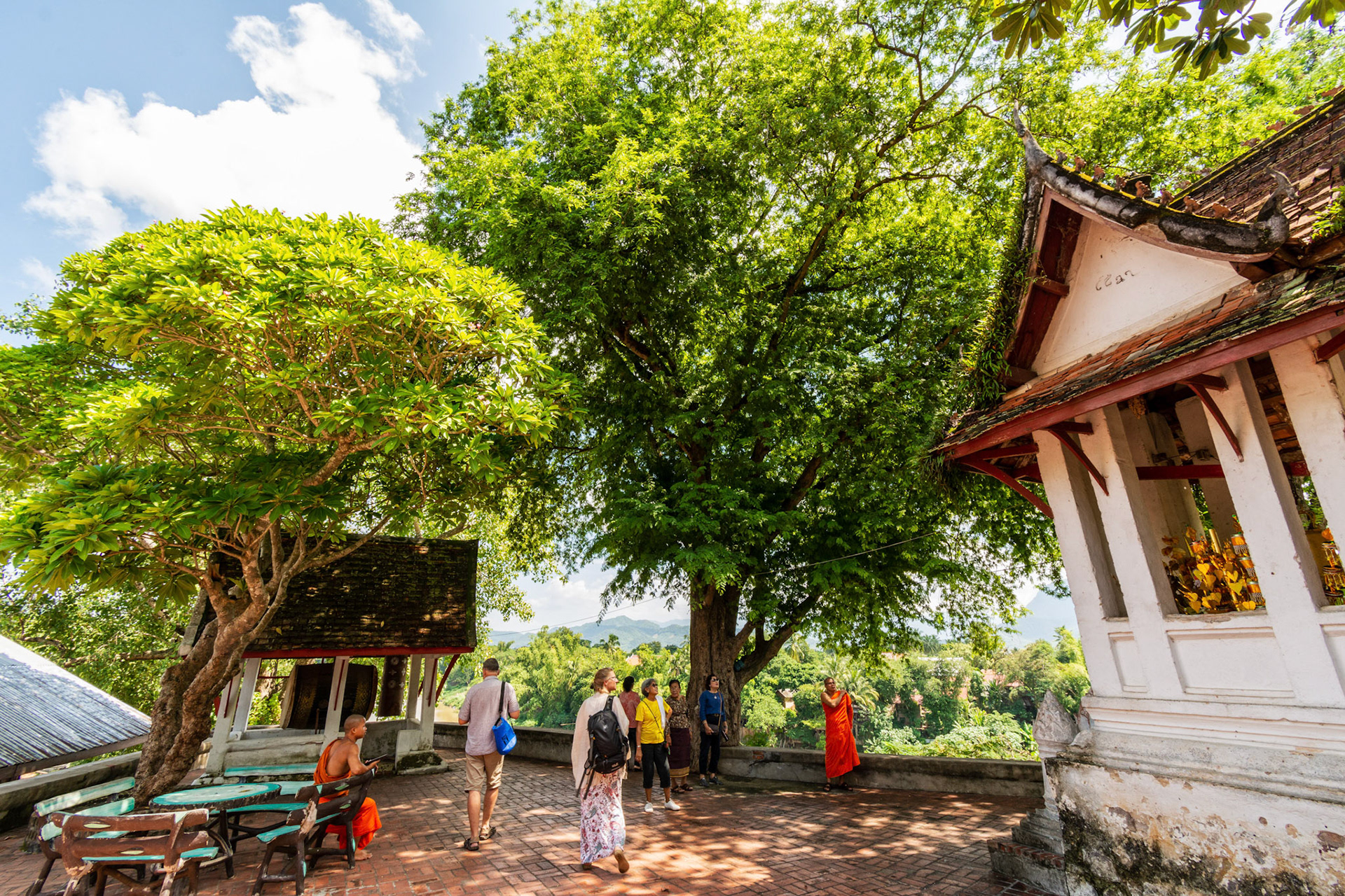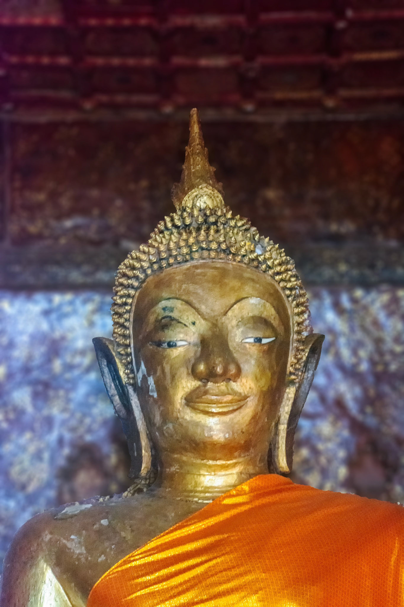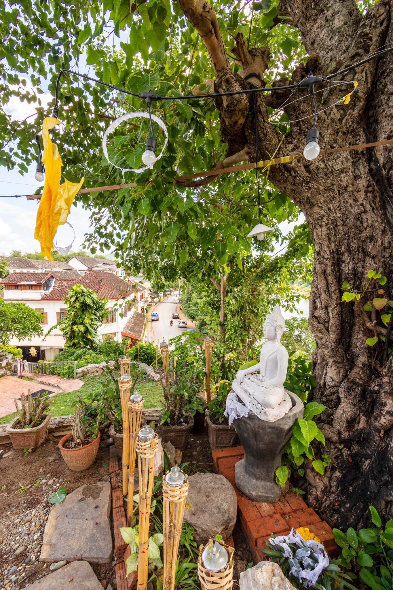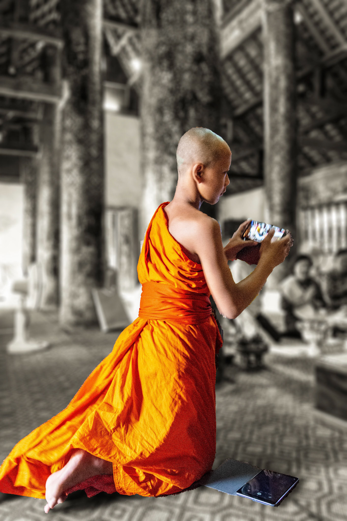 Boun Heua Fai (Fireboat Festival) day with the parade, weather permitting, due to take place that night. I went into Wat Siphoutthabath to see if anything was happening and was almost immediately greeted by a monk and invited into a prayer service- he’d seen my camera and wanted me to take shots during the service. Apart from the novices, there was what seemed like a prominent family group who during the service gave numerous offerings to the temple. Afterwards the monk walked the family group, a couple of other tourists and me in tow around the grounds.